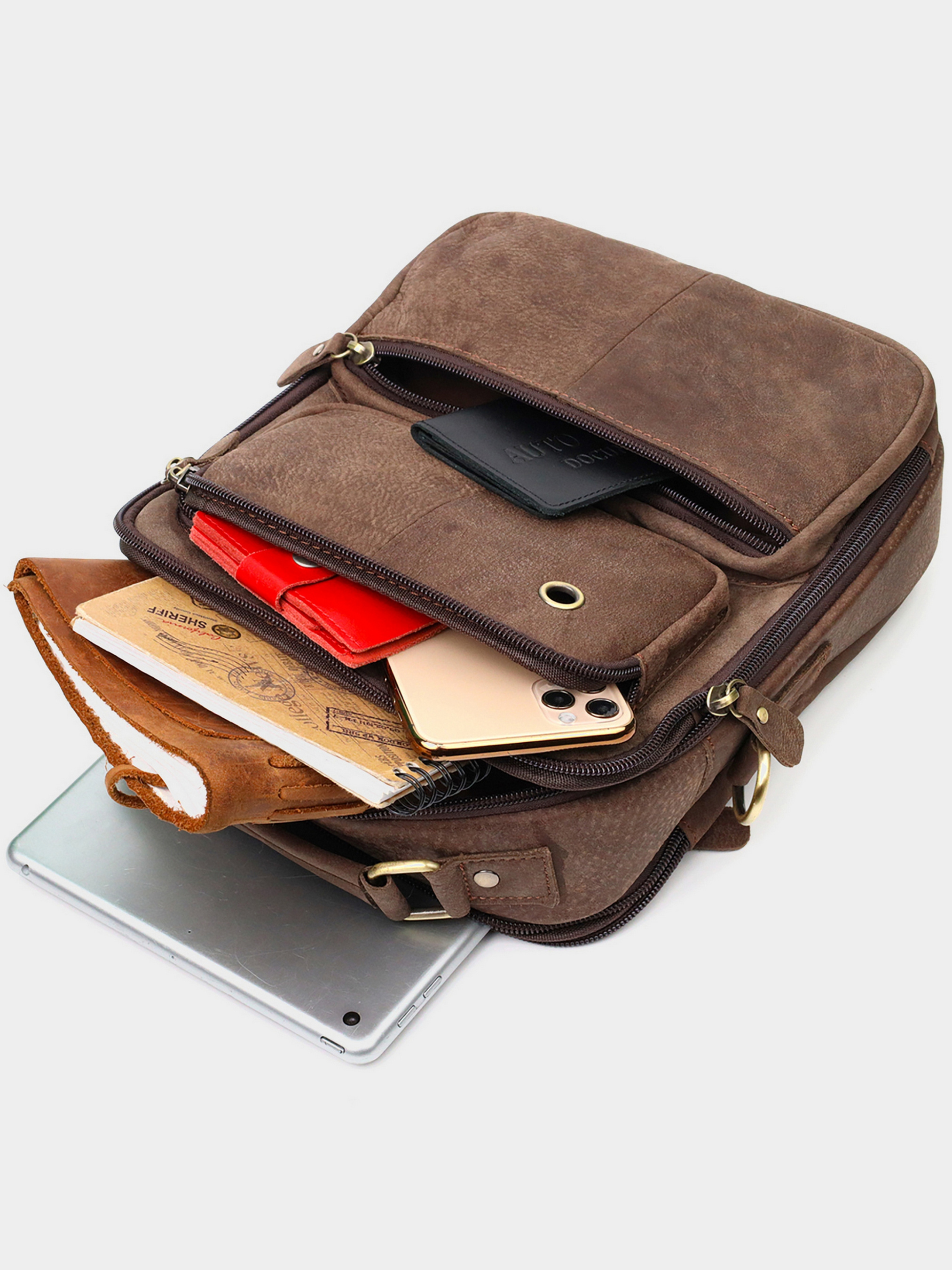 Колір: коричневий; Матеріал: натуральна шкіра; Розміри (ШхВхГ, см): 24х26х9 см; Країна виробник: Китай. Бренд: Vintage. Опис: - 2 основні відділення на блискавці; - у дальньому: усередині потайна кишеня на блискавці; - у ближньому: 2 кишені відкритого типу для мобільного телефону; - відділення на блискавці на тильній стороні; - на зовнішній стороні 2 кишені на блискавці; - знімна текстильна ручка зі шкіряною вставкою; Дуже зручна у використанні сумка із натуральної шкіри. Ви можете носити її на плечі, а також в руках, є шкіряна ручка для вашої зручності. Сумка прослужить не один рік, тому що пошита з якісної шкіри. Модель доповнена якісною міцною фурнітурою золотистого кольору. Аксесуар упакований у тканинний мішок, що дуже зручно для зберігання. Буде бажаним подарунком для будь-якого приводу.
