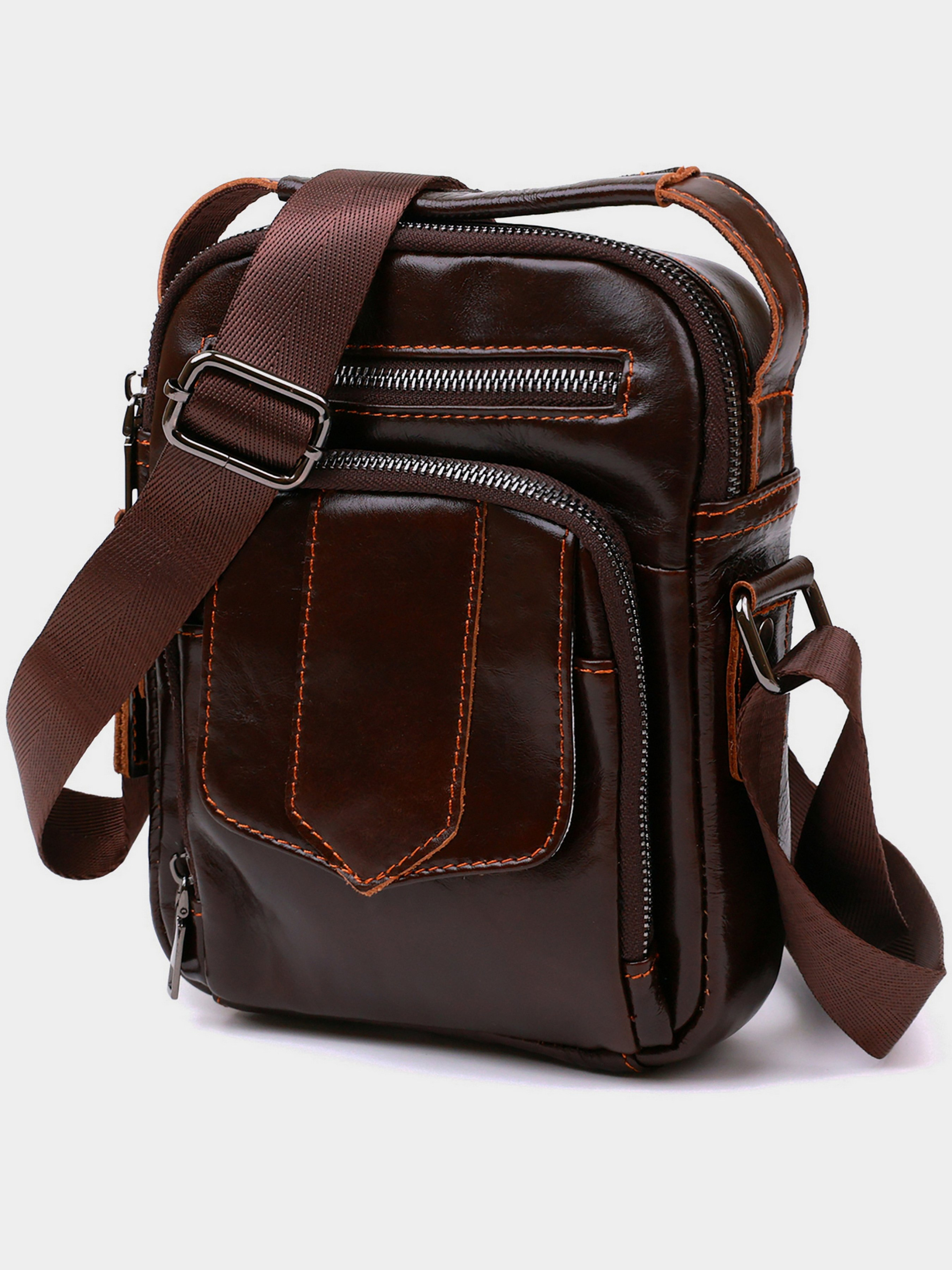 Колір коричневий; Матеріал: натуральна шкіра; Розмір (ШхВхГ, см): 16х20х4,5; Країна виробник: Китай; Бренд: Vintage. Опис: - одне основне відділення на блискавці; - потайна кишеня на блискавці; - дві накладні кишені, на лицьовій стороні - одна на блискавці, інша з хлястиком на магніті; - кишеня на блискавці на тильній стороні. - ручка для носіння в руках; - колір фурнітури – темне срібло; - не знімний ремінець на плече. Практична повсякденна сумка месенджер для чоловіків. Виріб ідеального розміру для роботи чи навчання. Сумка красивого коричневого кольору, який виділить вас із натовпу. Сумка з якісної натуральної шкіри, м'якої та приємної на дотик. Поверхня шкіри глянсова та добре тримає форму. Сумка має достатньо відділень. Якість виробу дуже висока. Нитки, що стирчать відсутні, міцна фурнітура і щільна підкладка. Сумка доповнена різноманітними кишеньками для вашої зручності. Ця модель стане чудовим подарунком для будь-якого чоловіка. У комплекті йде пилозахисний чохол.