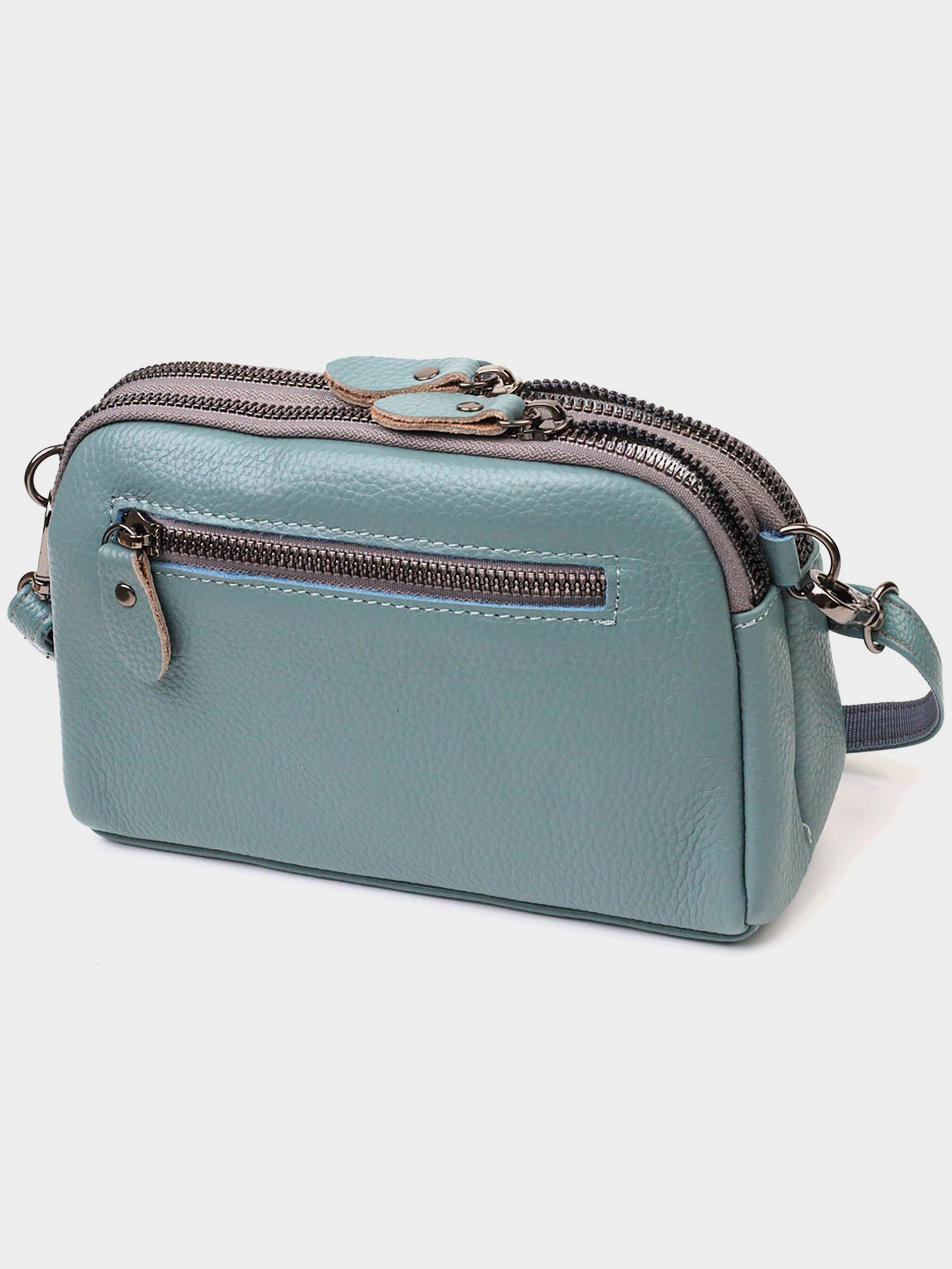 Колір: сіро-блакитний; Матеріал: натуральна шкіра високої якості; Розмір (ШхВхГ, см): 19х12х7 см; Країна виробник: Китай. Усередині: - два основні відділення на блискавці; - кишеня на блискавці всередині; - бічна кишеня відкритого типу всередині; - кишеня, що закривається хлястиком на магніті на лицьовій стороні; - кишеня на блискавці на тильній стороні; - знімний кистьовий ремінь; - знімний плечовий ремінь. Модна невелика сумка-клатч із натуральної м'якої шкіри високої якості. Виріб дуже зручний, можна носити на плечі, через плече, під рукою та на кисті. Модель доповнена фурнітурою кольору темного срібла. Аксесуар має два основні відділення на блискавках, в яких дві кишеньки - на блискавці та одна відкритого типу, також зовні знаходяться дві кишені. У комплекті до сумки йде знімний плечовий ремінь та знімний кистьовий ремінь. Модель закривається на блискавку.