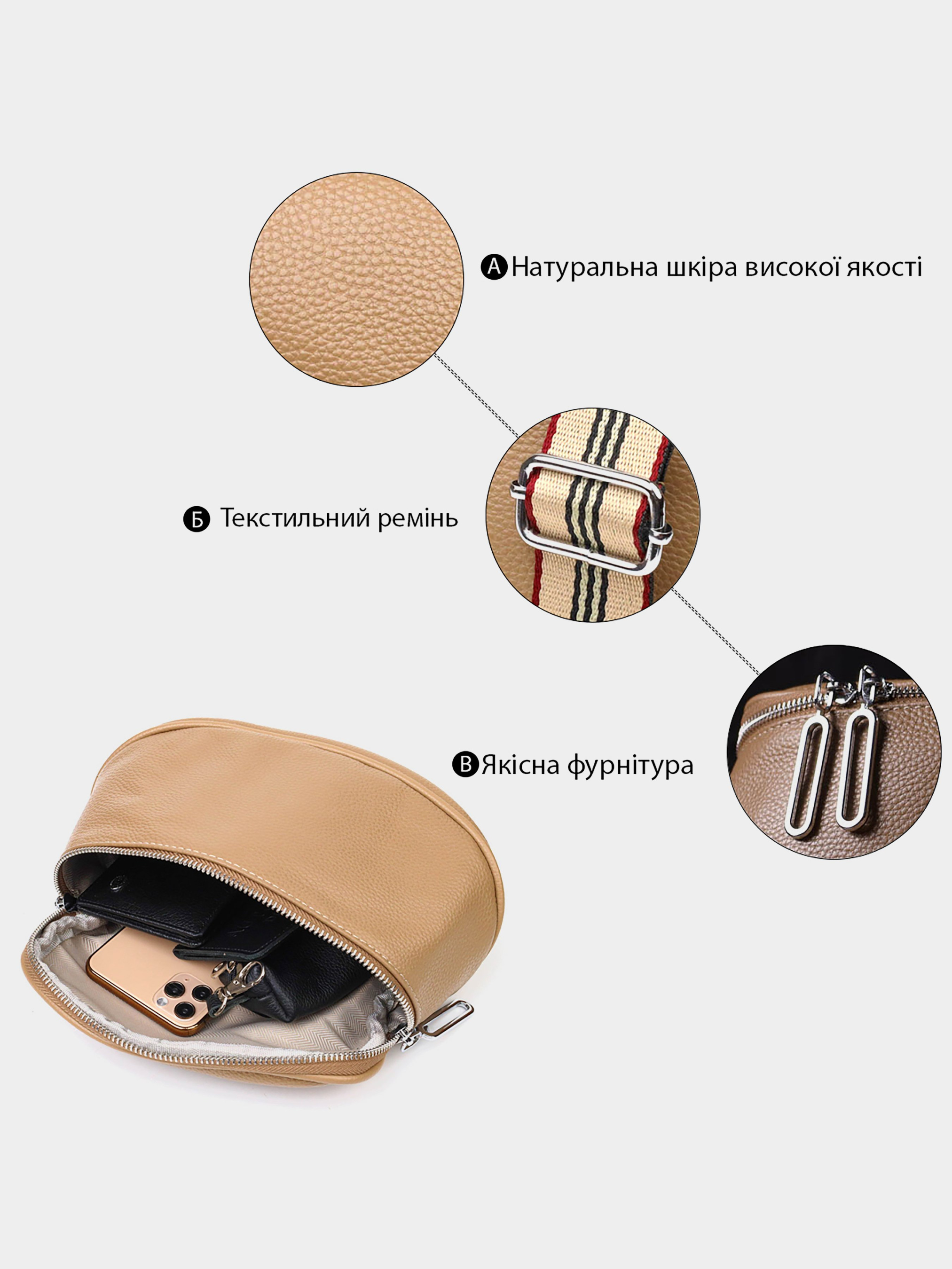 Колір: бежевий; Матеріал: натуральна шкіра високої якості; Розмір (ШхВхГ, см): 20х13х8,5 см; Країна виробник: Китай. Опис: - основне відділення на блискавці; - потайна кишеня на блискавці; - бічна кишеня відкритого типу; - знімний плечовий ремінь. Стильна жіноча сумочка з натуральної шкіри високої якості. Виріб дуже зручний, можна носити на плечі та через плече, відмінний повсякденний варіант невеликої сумки. Модель доповнена фурнітурою сріблястого кольору. Аксесуар має одне основне відділення в якому дві кишеньки - на блискавці та відкритого типу. Модний та практичний варіант сумки для стильних жінок.