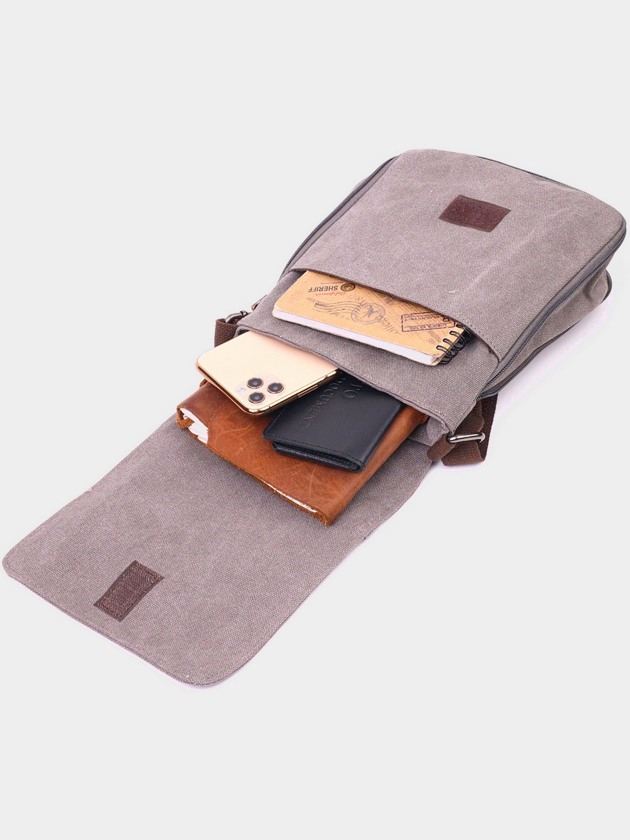 Матеріал: текстиль; Колір: сірий; Розміри (ШхВхГ, см): 19х24х2 см; Країна виробник: Китай. Особливості: - основне відділення, що закривається на блискавку; - три кишені всередині одного відділення, одна на блискавці; - накладна кишеня на лицьовій стороні під клапаном; - горизонтальна кишеня на блискавці на тильній стороні; - кишенька на блискавці на клапані; - не знімний регульований ремінь; - закривається на блискавку та клапаном на липучку; - підкладка із темної коричневої тканини. Чоловіча невелика сумка із міцного текстилю. Аксесуар має одне основне відділення, три внутрішні кишені різних розмірів, одна з яких на блискавці і три зовнішні кишені, дві з яких на блискавці. Сумка має розширювач на блискавці, щоб більше ваших речей помістилося, а наявність кишень допоможе вам ідеально їх розкласти. Сумка чудово поєднується зі стилем кежуал, а також мілітарі. Модель дуже практична та універсальна. Виріб стане чудовим подарунком для будь-якого чоловіка.
