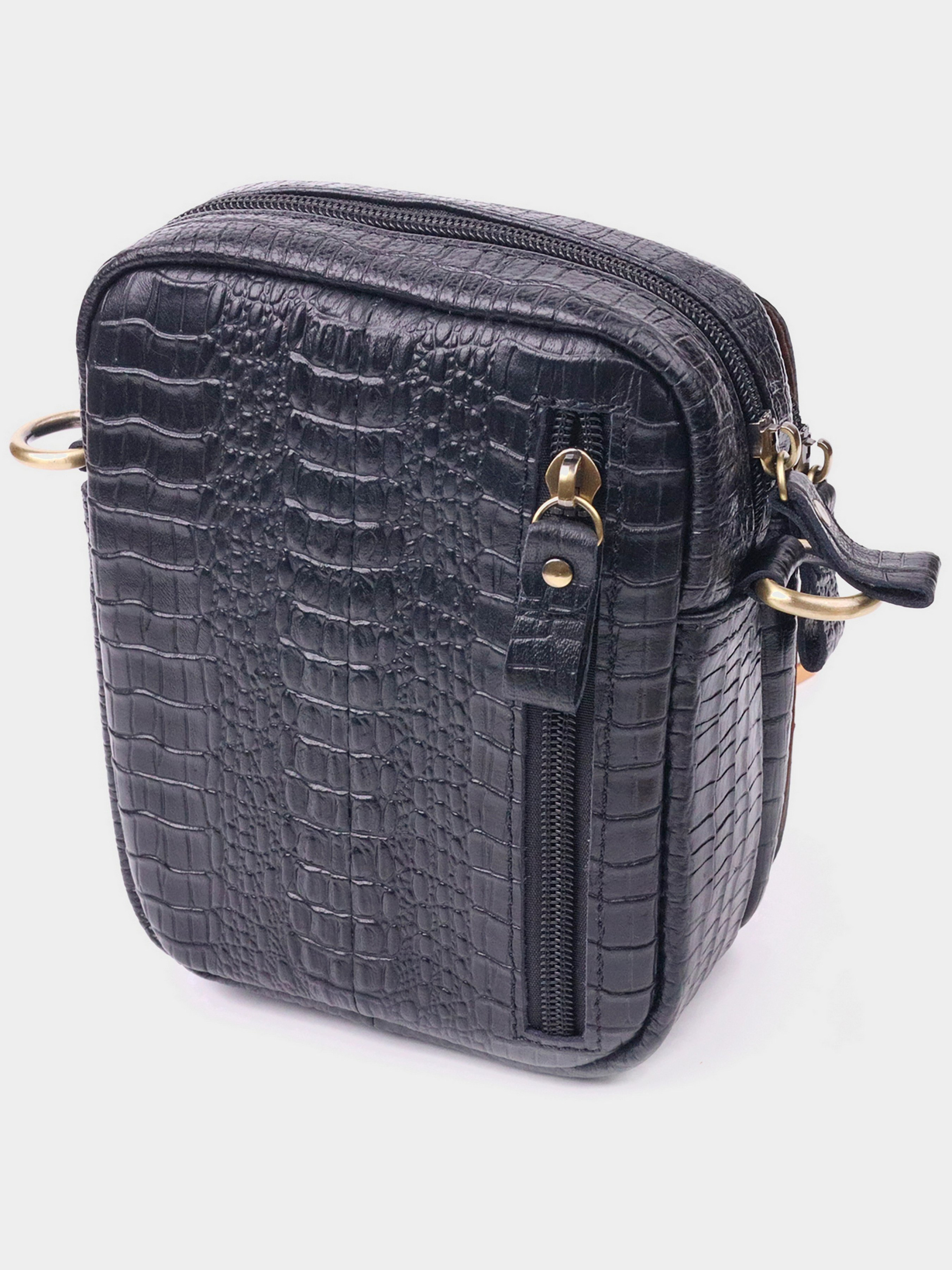 Колір: чорний; Матеріал: натуральна шкіра високої якості; Розмір (ШхВхГ, см): 13,5х18х6 см; Країна виробник: Китай. Особливості: - основне відділення на блискавці; - одна вертикальна кишеня на тильній стороні, на блискавці; На лицьовій стороні: - накладна кишенька на блискавці під клапаном, що закривається хлястиком на магніт; - знімний регульований текстильно-шкіряний ремінець на плече. Сучасна чоловіча сумка невеликого розміру із натуральної фактурної шкіри з тисненням під крокодила. Модель, яка ідеально підійде на кожен день. В аксесуарі одне основне відділення та дві кишені різних розмірів, сумку можна носити на плечі. Основним акцентом у цій сумці є декор у вигляді голови крокодила, зовні. Доповнено виріб якісною фурнітурою жовтого кольору. Сумка стане чудовим подарунком для близької людини.