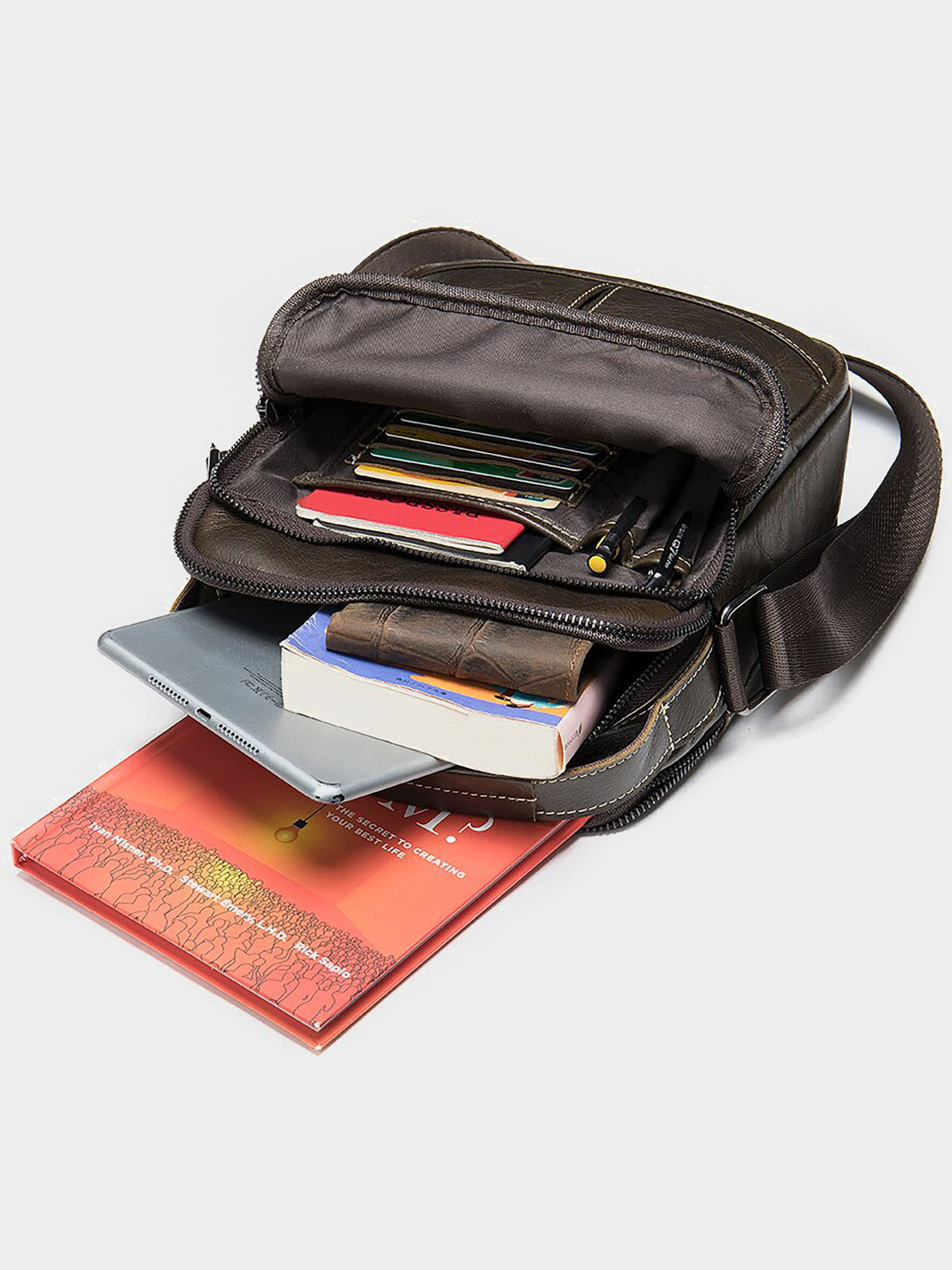 Колір коричневий; Матеріал: натуральна шкіра; Розмір (ШхВхГ, см): 23х19х5,5. Країна виробник: Китай. Бренд: Vintage. Особливості: - два основних відділення на блискавці; - кишеня на блискавці на тильній стороні; - дві кишені на блискавці на лицьовій стороні сумки (одна вбудована і одна накладна); - всередині накладної кишені на лицьовій стороні: 3 слота для карток, відкрита кишеня і 2 петлі для ручок; - незнімний текстильний ремінець на плече. Шкіряний коричневий месенджер середнього розміру. Сумка на два відділення дуже універсальна і зручна. З таким месенджером вам буде зручно ходити на навчання або роботу. Модель №1 на кожен день. Всередині - якісна текстильна підкладка коричневого кольору. По краях сумка прошита світлим рядком. Модель упакована в пилозахисний чохол. Сумка з натуральної шкіри стане прекрасним подарунком для будь-якого чоловіка.