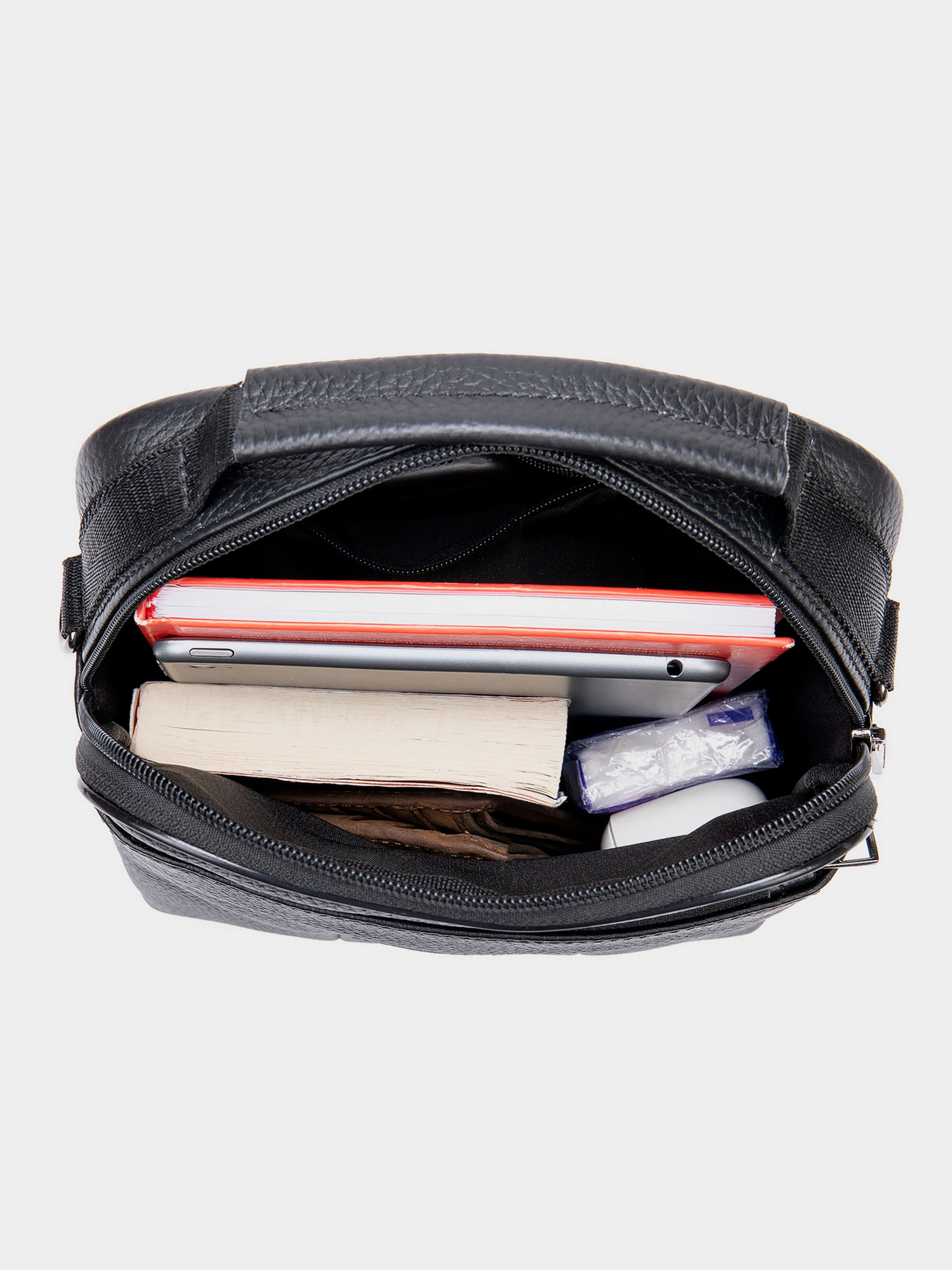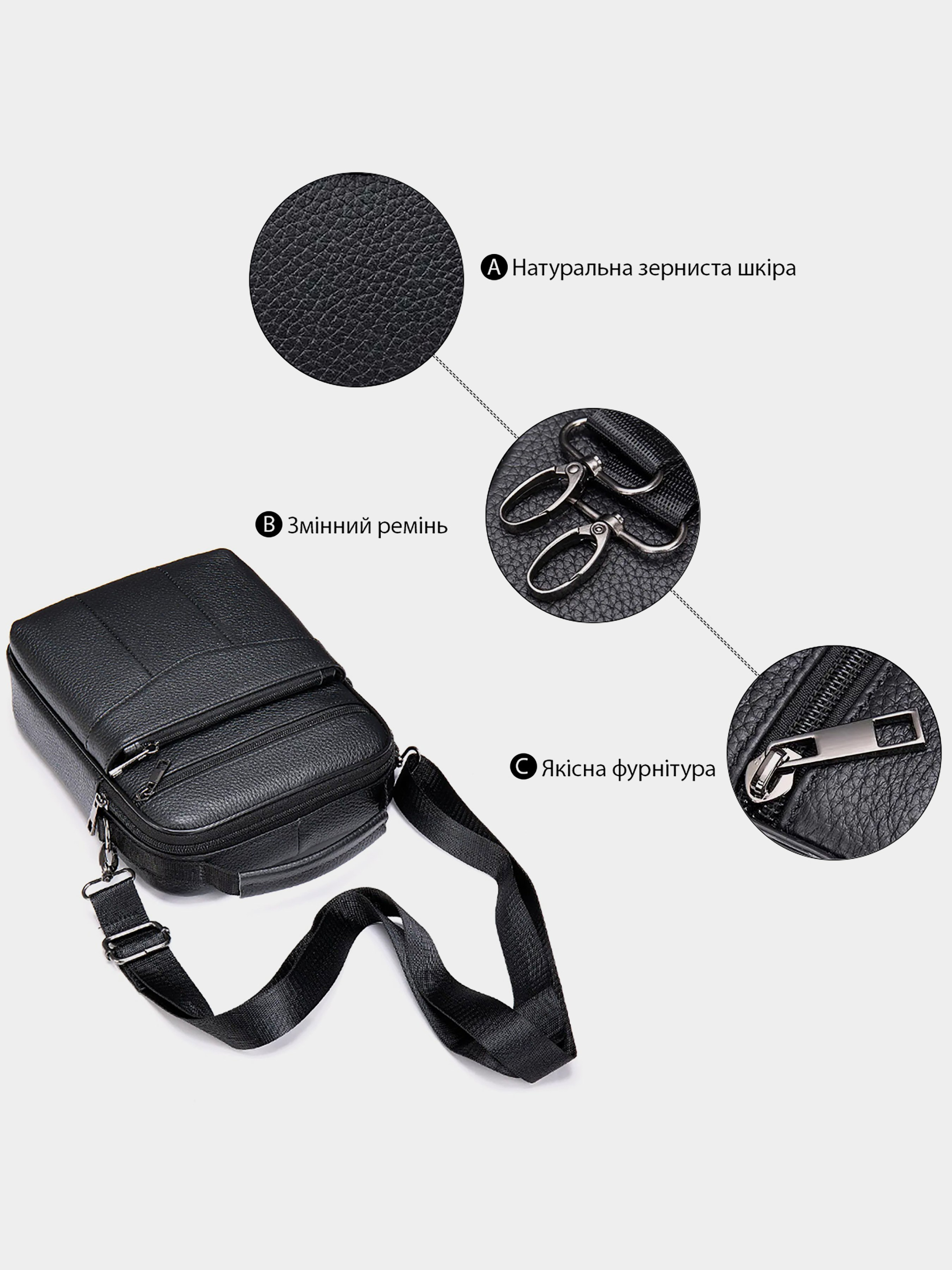 Колір чорний; Матеріал: натуральна шкіра високої якості; Розмір (ШхВхГ, см): 20х25х5. Країна виробник: Китай. Всередині: - одне основне відділення на блискавці; - потайна кишеня на блискавці на задній стінці; - 2 кишені на блискавках на тильній стороні; - вбудована і накладна кишеня на блискавці на лицьовій стороні; - ручка в руку і знімний текстильний ремінець на плече. Сумка виконана в натуральній шкірі зернистого типу. Даний тип шкіри менш вибагливий у догляді. На ньому не видно подряпин і потертостей. Класичний чорний колір підійде під будь-який образ. Месенджер - ідеальний варіант сумки на кожен день. Аксесуар дуже місткий навіть незважаючи на одне відділення. Сумка доповнена безліччю кишень для вашої зручності. З її функціональністю ви зручно розмістите свої речі і буде порядок всередині вашої сумки. В сумку поміщається блокнот-щоденник діагоналлю 25 см. Розмірами 21 на 15 см. Виріб підійде як для навчання, роботи, так і для просто прогулянок. Якщо ви перебуваєте в пошуку подарунка - рекомендуємо вам дану модель. Впевнені, що прослужить вона вам далеко не один рік.
