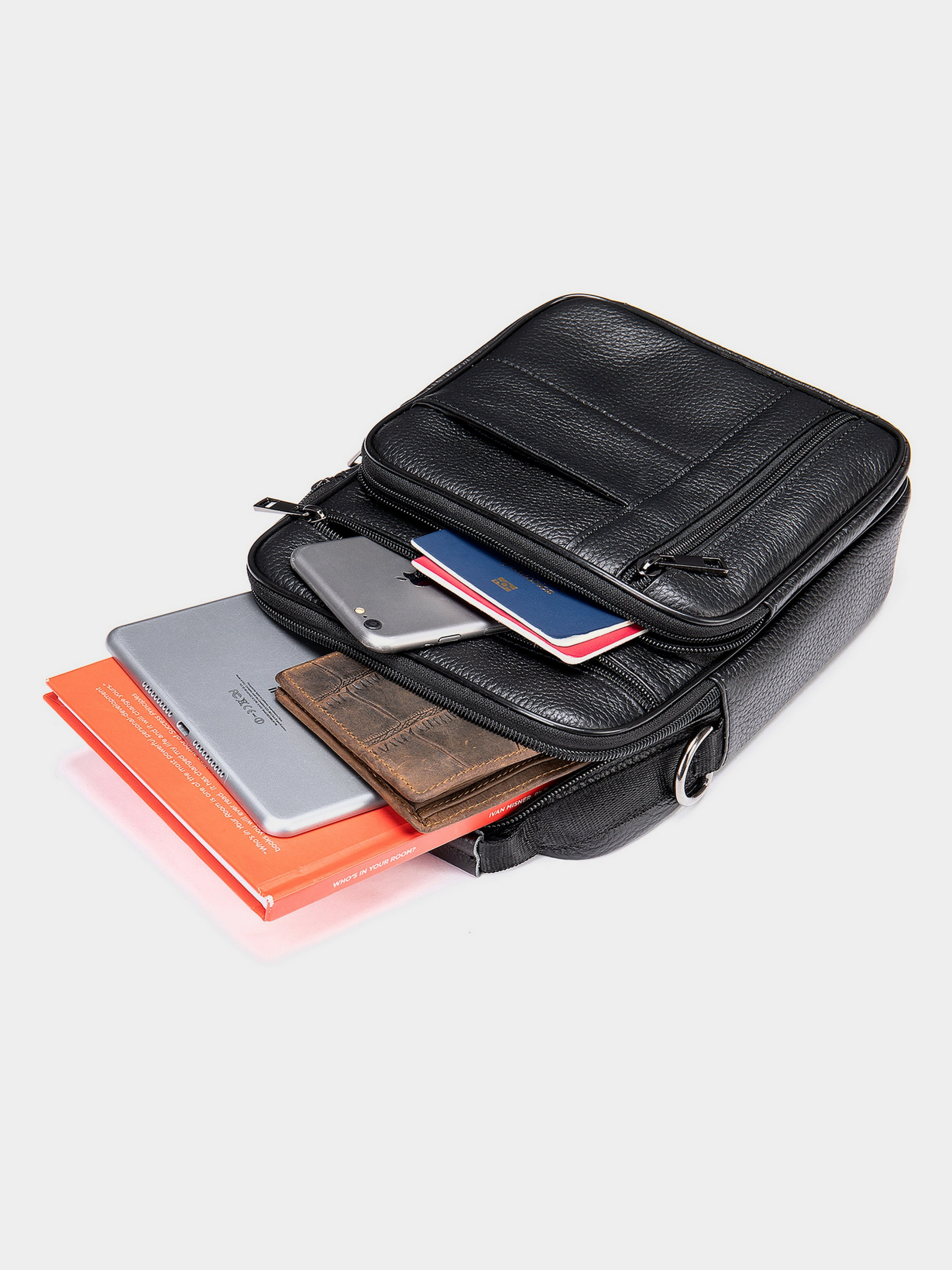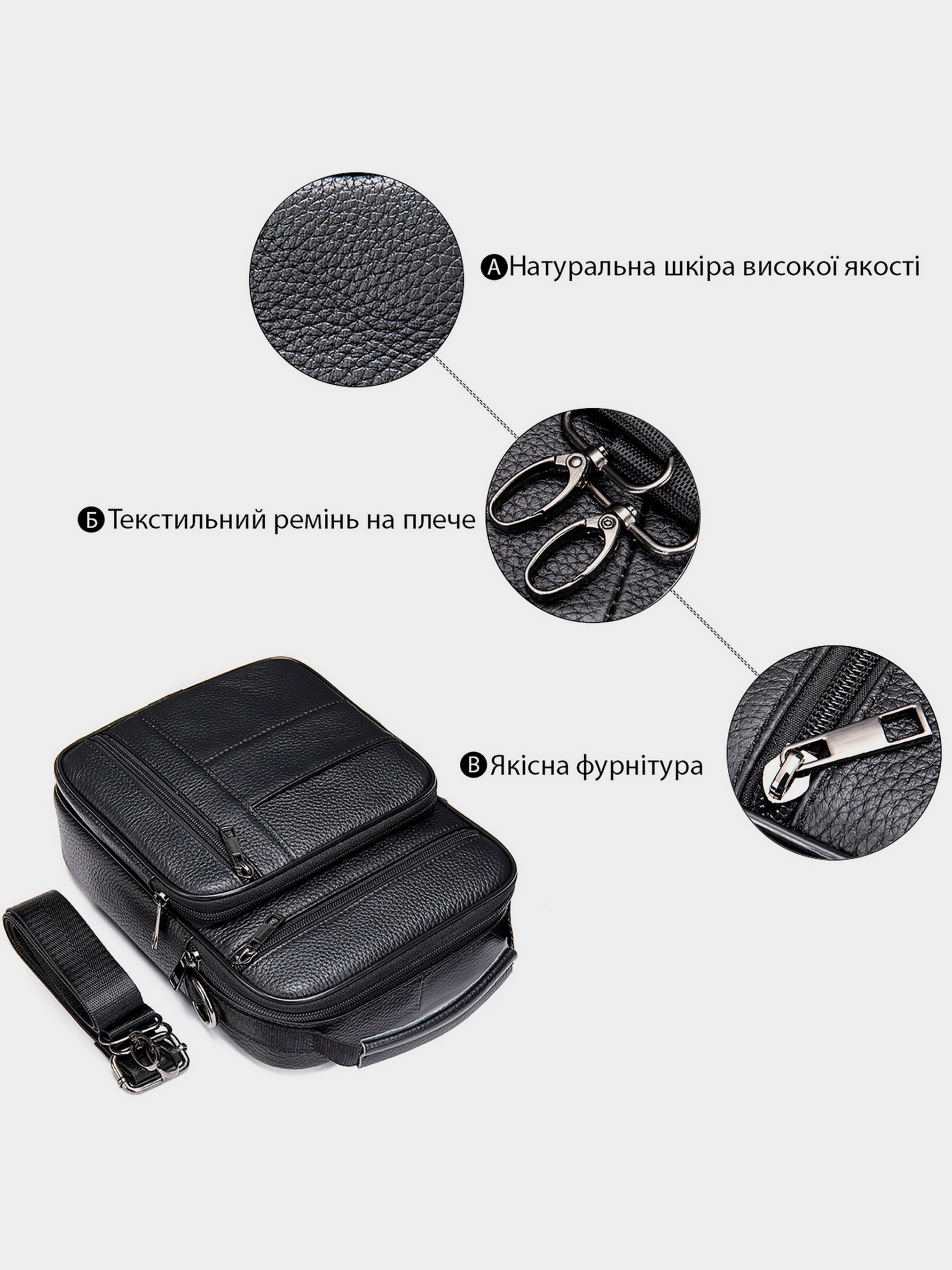 Колір чорний; Матеріал: натуральна шкіра високої якості; Розмір (ШхВхГ, см): 20х25,5х5,5. Країна виробник: Китай. Всередині: - одне основне відділення на блискавці; - потайна кишеня на блискавці на задній стінці; - 2 кишені на блискавках на тильній стороні; - вбудований і накладна кишеня на блискавці на лицьовій стороні; - кишенька вертикального типу на лицьовій стороні; - ручка в руці і знімний текстильний ремінець на плече. Шкіряний чоловічий мессенджер - ідеальний вибір сумки на кожен день. Виріб виконаний в шкірі типу флотар, яка менш вибаглива в догляді. В сумку поміщається блокнот-щоденник діагоналлю 25 см. Розмірами 21 на 15 см. Мессенджер ви можете носити як на плечі, так і в руках за допомогою текстильного ремінця. Виріб має багато кишеньок різних за розмірами, що забезпечить вам порядок у вашій сумці. Всередині - якісна підкладка. Така класична сумка з легкістю доповнить ваш образ і прослужить далеко не один рік. Якщо ви перебуваєте в пошуку подарунка - рекомендуємо вам дану модель.