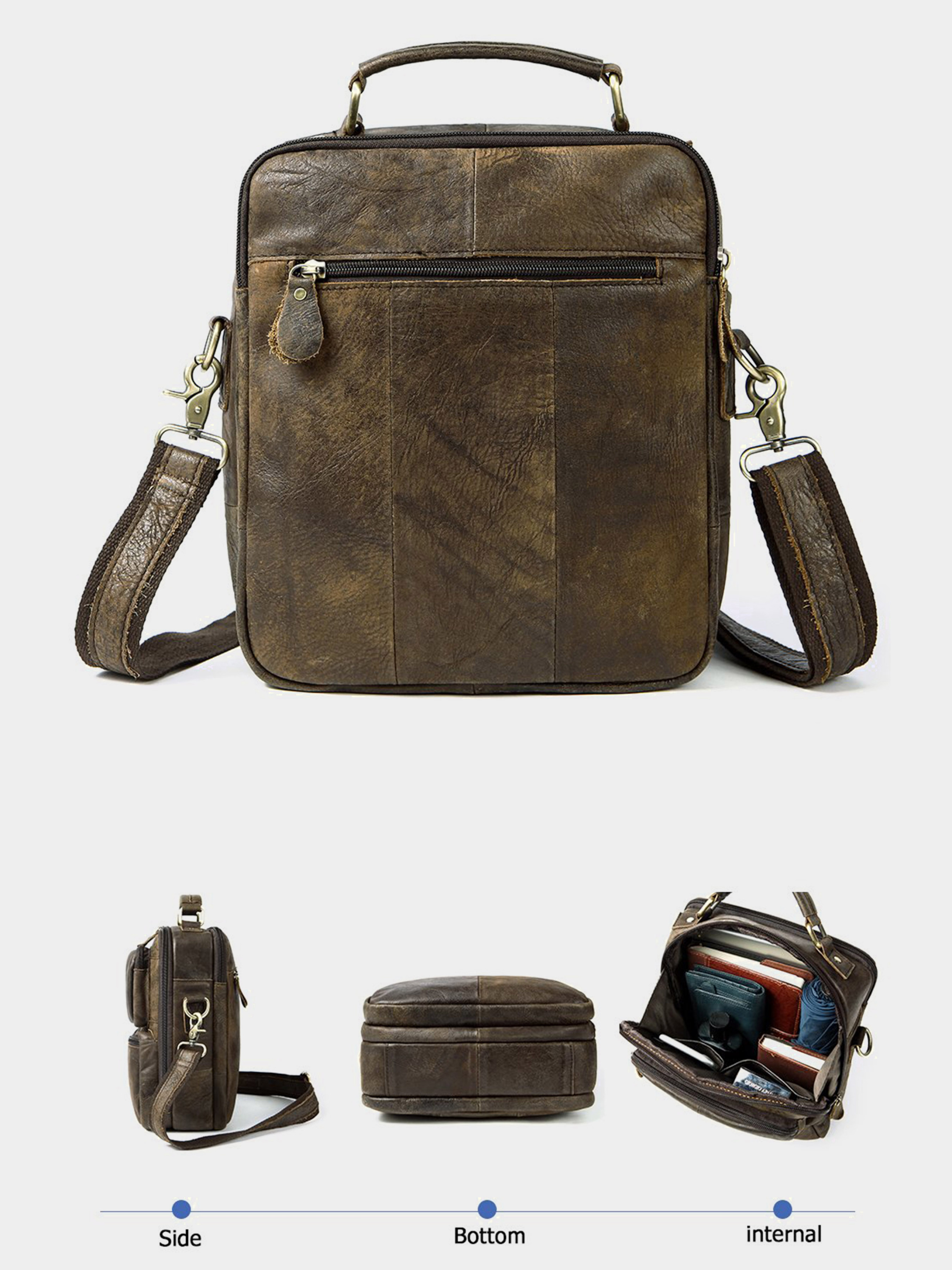 Колір: рудий; Матеріал: натуральна шкіра; Розміри (ШхВхГ, см): 23х27х7,5 см Країна виробник: Китай. Бренд: Vintage. Опис: - 2 основні відділення на змійці; - в далекому: всередині потайна кишеня на змійці; - в ближньому: 2 кишені відкритого типу для мобільного телефону; - відділення на змійці на тильній стороні; - на зовнішній стороні 2 кишені на змійці; - зйомна текстильна ручка зі шкіряною вставкою; Сумка з ефектом старовини. Розмір сумки один з найоптимальніших для будь-якого чоловіка. Ви можете носити її як на плечі, так і в руках, є шкіряна ручка для вашої зручності. Дуже зручна у використанні і не вибаглива в догляді річ. Сумка прослужить вам не один рік. Модель доповнена якісною міцною фурнітурою золотистого кольору. Виробляється фабрикою в Китаї, яка вже давно на ринку. Ми контролюємо процес виробництва сумок, які замовляємо. Тому ви можете не сумніватися. Аксесуар упакований в тканинний мішок, що дуже зручно для його зберігання. Буде бажаним подарунком для будь-якого приводу.