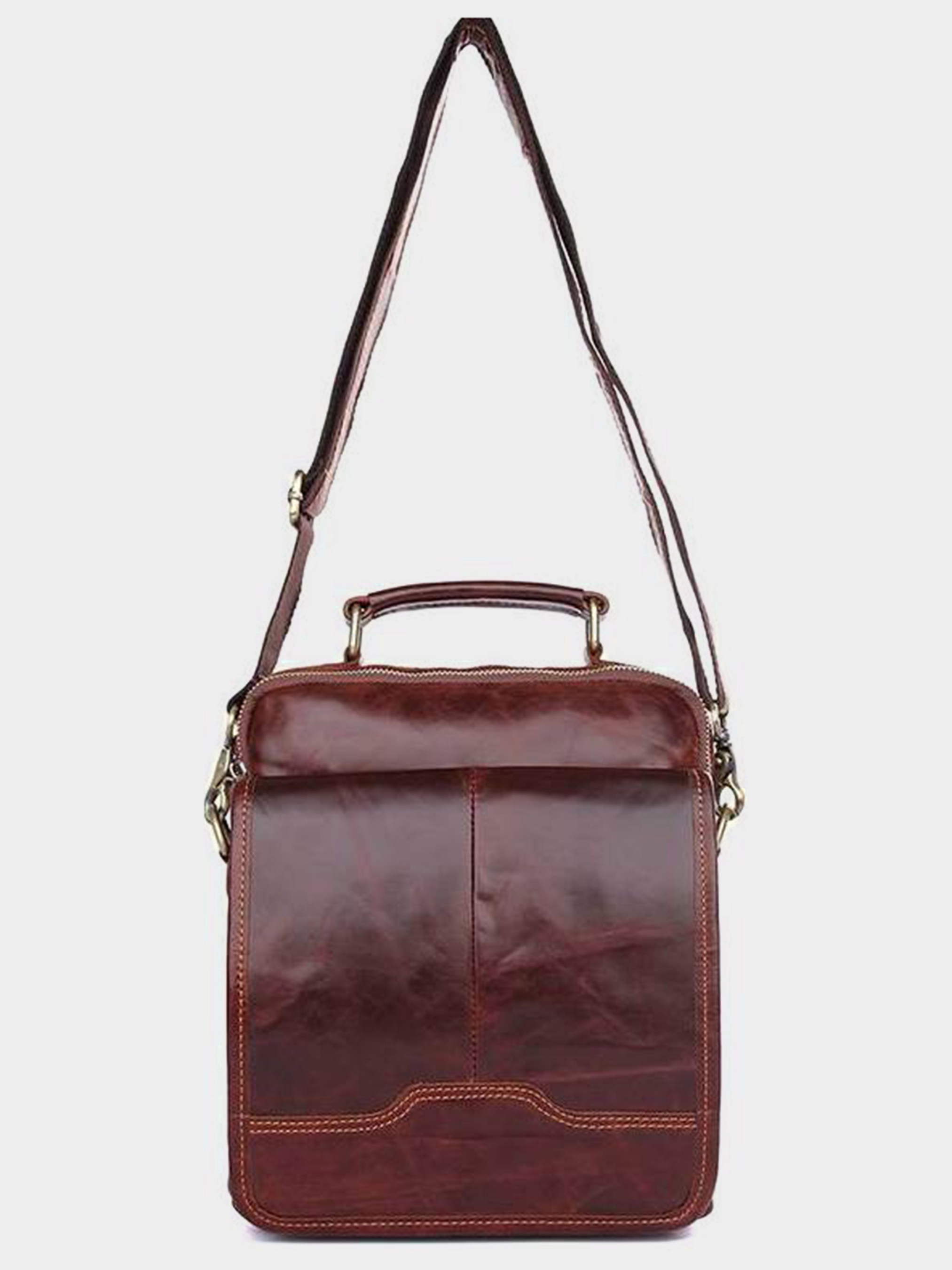 Матеріал: натуральна шкіра; Колір: коричневий (коньячний); Розміри (ШхВхГ, см): 21х25х5.5. Відмінна чоловіча сумка коричневого кольору. Аксесуар виконаний з натуральної високоякісної шкіри, яка відрізняється легким, ледь помітним блиском. Колір фурнітури: латунь. На лицевій стороні розташована невелика кишеня під клапаном на магніті. На задній зовнішній стороні знаходиться містке відділення на блискавці. Сумка має два автономних відділення, які закриваються на блискавки. У першому відділенні перебувають дві невеликі накладні кишені, а у другому відділенні розташована потайна кишеня на блискавці. Носиться даний аксесуар за допомогою шкіряної ручки і через плече за допомогою, регульованого ременя, що знімається. Підкладка виконана з міцного текстильного матеріалу коричневого кольору. Сумка упакована в текстильний пилозахисний чохол білого кольору.