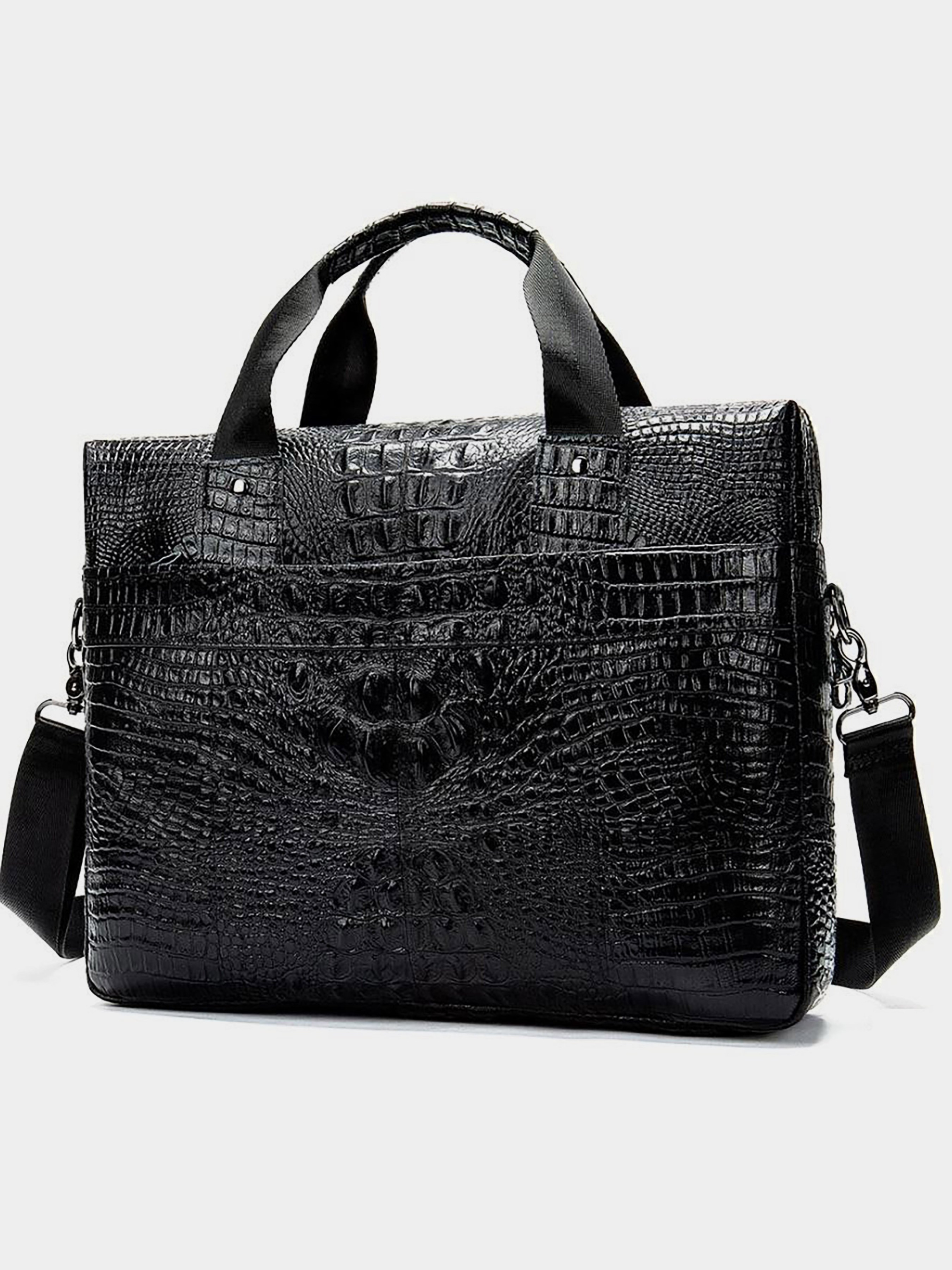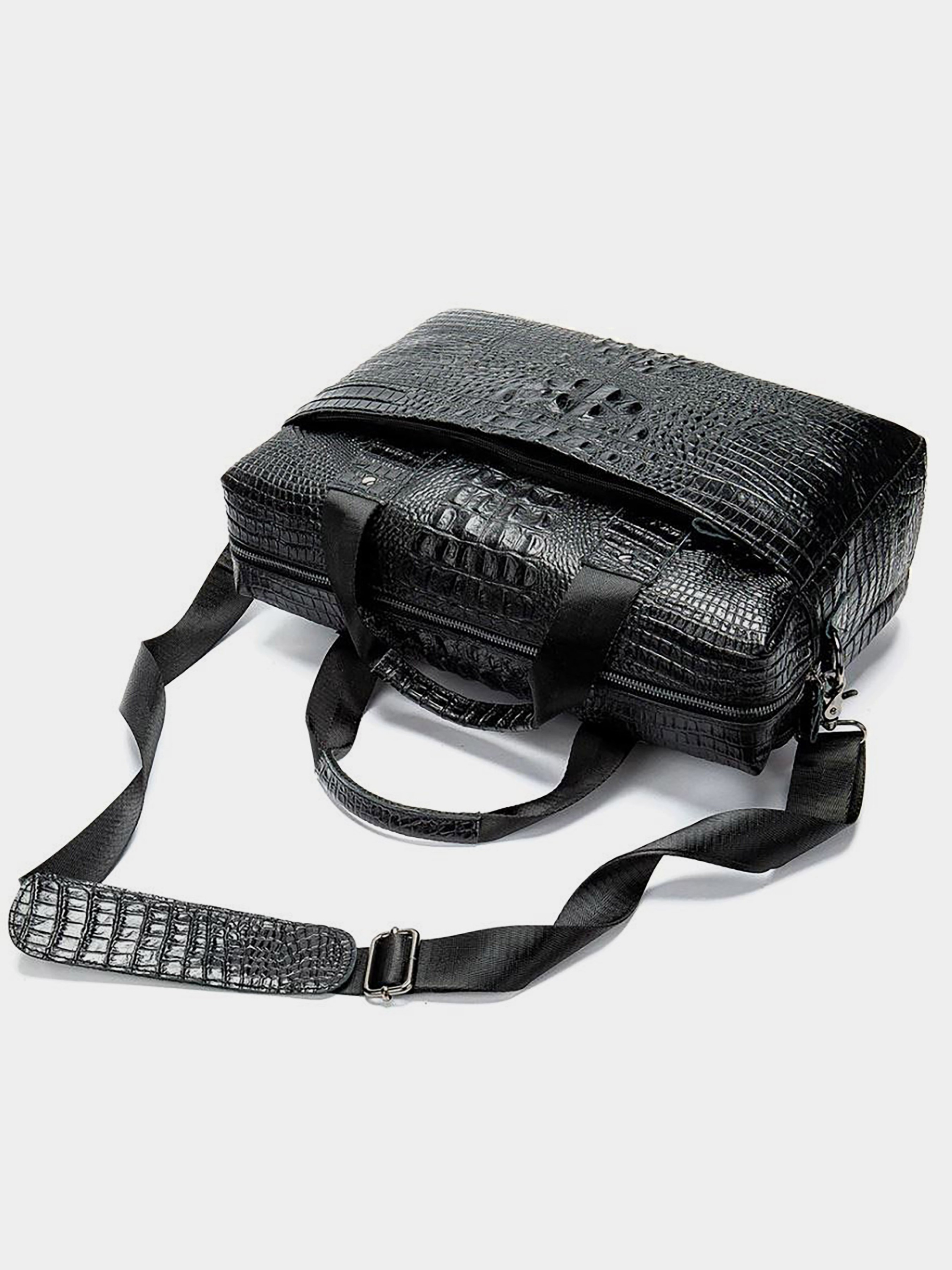 Матеріал: натуральна шкіра високої якості. Колір: чорний. Розміри (ШхВхГ, см): 40х34х5,5 см. Країна виробник: Китай. Бренд: Vintage. Опис: - основне відділення на змійці; Всередині: - потайна кишеня на змійці; - липучка для ноутбука; - 4 слота для карток; - 2 петлі для ручок; - 2 відкриті кишені накладні; - зйомний ремінець на плече текстильний; - кишеня на тильній стороні на змійці; - на лицьовій стороні накладна кишеня на змійці і відділення на змійці; Солідна, якісна сумка з тисненням під крокодила з натуральної шкіри. У сумці зручно носити ноутбук, документи формату А4. Аксесуар прошитий чорною ниткою. Ви можете носити таку сумку як на плечі, так і в руках за ручки. Усередині сумки коричнева підкладка. Виглядає така сумка дуже солідно і розкішно. Шкіра такого плану дуже добре і довго носиться і невибаглива в догляді. Дуже комфортно ходити з такою сумкою на роботу або на зустрічі. Також, ви можете взяти сумку з собою в поїздку. Аксесуар відмінно підійде для чоловіків, які люблять почуття стилю і розкіш. Ідеальний подарунок для будь-якого чоловіка.