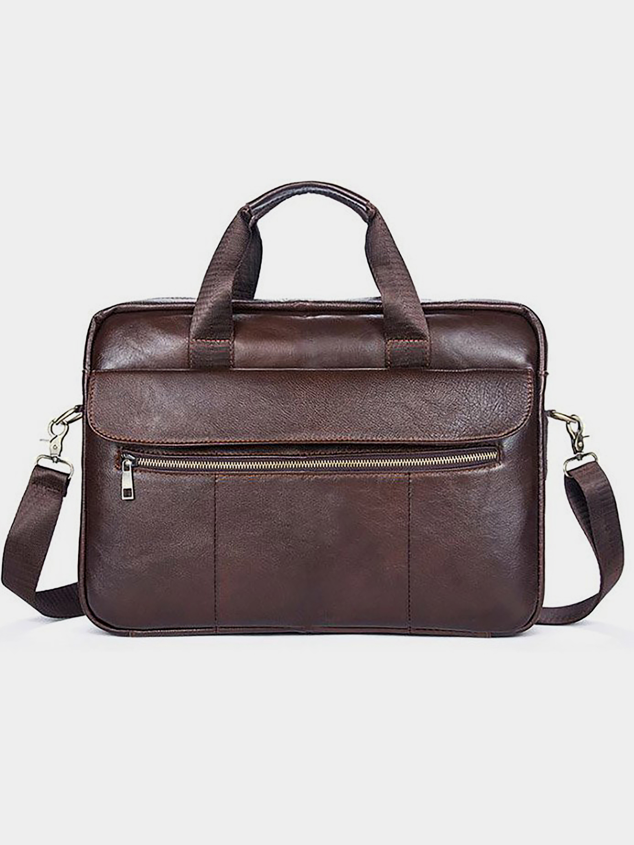 Матеріал: натуральна шкіра високої якості. Колір: коричневий. Розміри (ШхВхГ, см): 40х31х6,5 см. Країна виробник: Китай. Бренд: Vintage. Опис: - основне відділення на змійці; - потайна кишеня на змійці; - дві відкриті накладні кишені; - кишеня на липучці для ноутбука; - на тильній стороні кишеня на змійці; - кишеня на лицьовій стороні кишеня на змійці; - відкрита кишеня під клапаном з двома магнітами на лицьовій стороні; - текстильний ремінець на плече (знімний); Солідна сумка для зустрічей, щоб носити з собою ноутбук і документи. Аксесуар доповнено золотистою фурнітурою і прошитий рудою ниткою. Модель можна носити як за ручки з шкіряними вставками, так і за допомогою текстильного ремінця на плече. Усередині міцна текстильна підкладка коричневого кольору. У догляді модель не примхлива і довго носиться. Буде ідеальним варіантом для подарунка близькій людині. Аксесуар упакований в тканинний мішок.