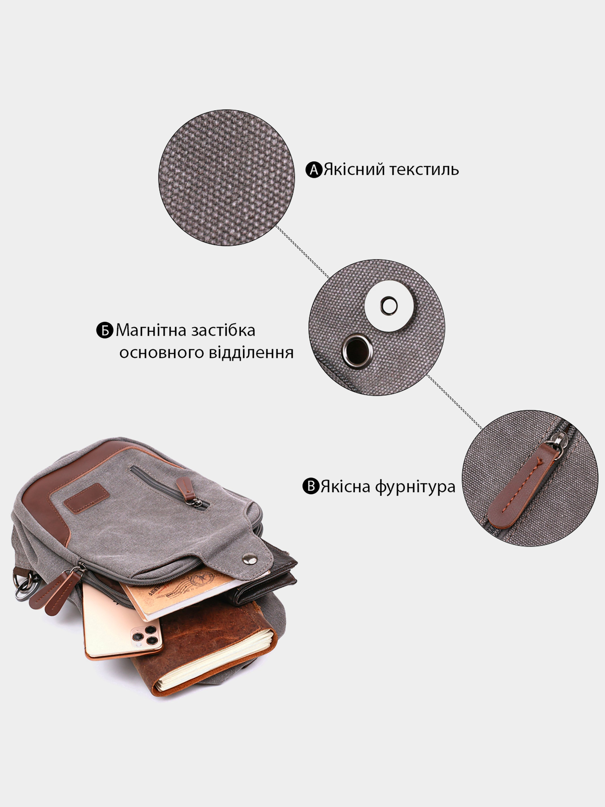 Матеріал: текстиль; Сірий колір; Розміри (ШхВхГ, см): 20х32х6, 5. Країна виробник: Китай. Бренд: Vintage. Опис: - два основні відділення на блискавці; У ближньому: - накладна відкрита кишеня і два слоти для ручок. У далекому: - відкрита кишеня; - потайна кишеня на блискавці; На зовнішній стороні: - кишеня на лицьовій стороні на магнітній кнопці; - вертикальна кишеня на блискавці на лицьовій стороні; - вертикальна кишеня на блискавці на тильній стороні; - текстильний регульований незнімний ремінець на праве або ліве плече; - підкладка із коричневої тканини. Невелика, але містка сумка крос-боді для активних чоловіків у стильному дизайні. Виконана дана модель із міцного та надійного у використанні текстилю. Усередині є багатофункціональні кишені та просторі відділення. Для зручності передбачена можливість перенавішування ременя на ліву або праву сторону, згідно з Вашими уподобаннями.