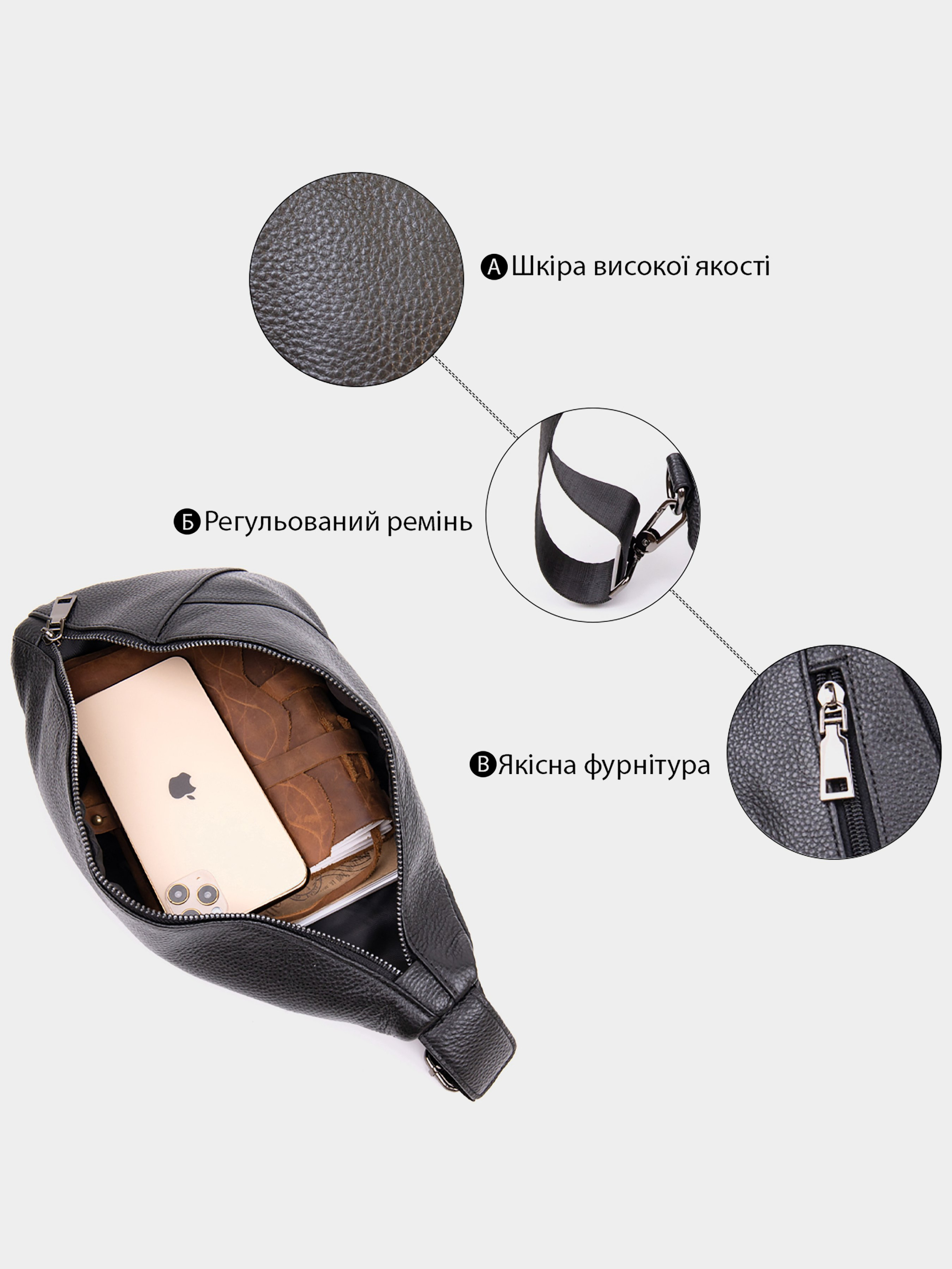 Колір чорний; Матеріал: натуральна шкіра; Розмір (ШхВхГ, см): 16,5х32,5х4. Країна виробник: Китай. Бренд: Vintage. Особливості: - основне відділення на блискавці; - всередині кишеня відкритого типу; - кишеня на блискавці на тильній стороні; - бокова кишеня на блискавці на лицьовій стороні; - регульована ручка на праве або ліве плече. Сумка з натуральної шкіри приємної на дотик. Модель має дуже зручний функціонал. По краях сумка прошита рівним рядком в дизайн виробу. Сумка доповнена якісною фурнітурою, має текстильний ремінець, який ви можете носити на будь-якому зручному вам плечі. Така сумка стане незамінною на кожен день. Також з нею вам буде зручно в поїздках, поклавши в неї все найнеобхідніше. Виріб упаковано в тканинний чохол. Буде ідеальним подарунком для близької людини.