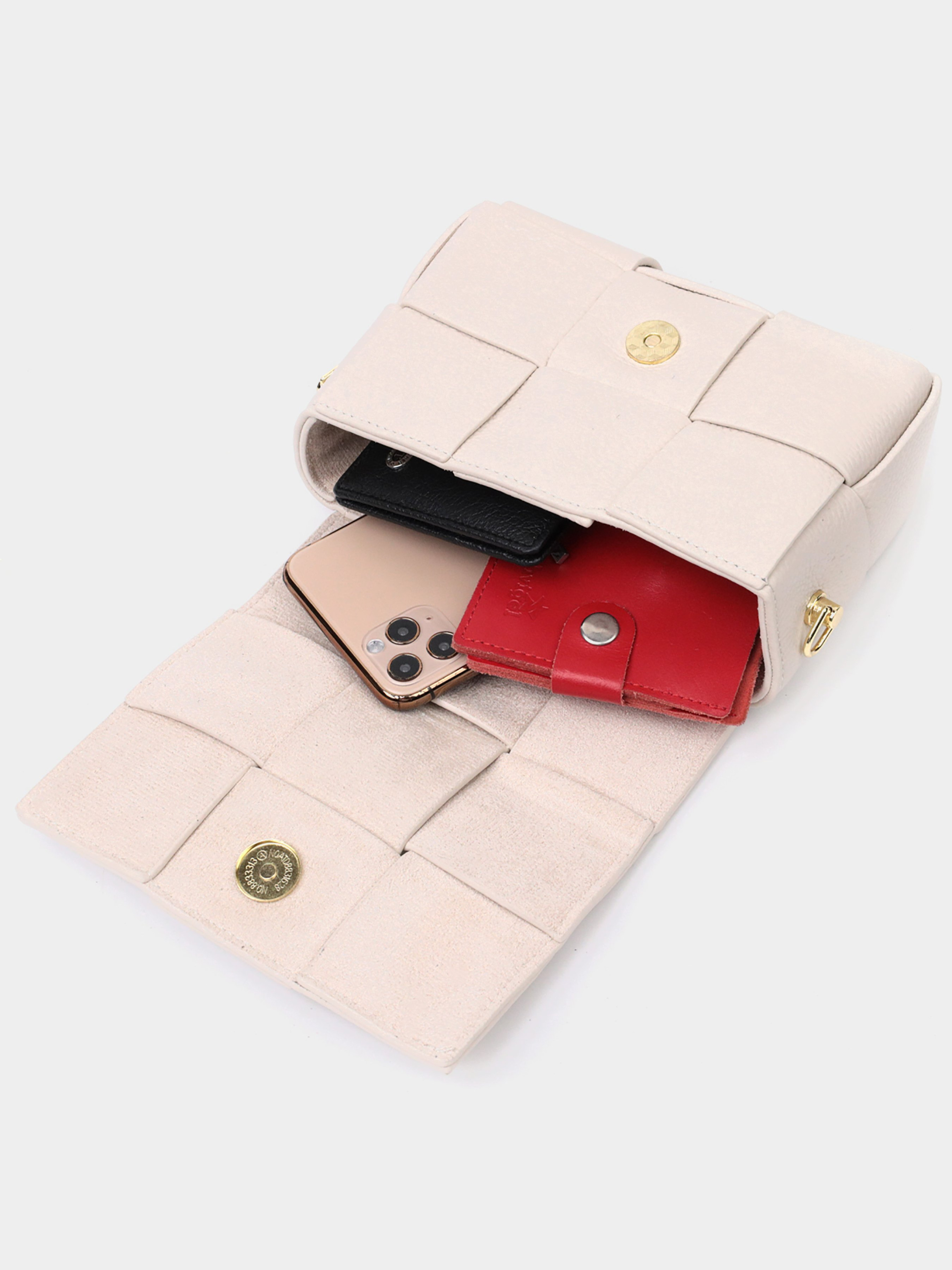 Колір: молочно-білий; Матеріал: натуральна шкіра; Розмір (ШхВхГ, см): 17х12,5х5,5 см; Країна виробник: Китай. Бренд: Vintage. Особливості: - закривається клапаном на магніт; - широке основне відділення; - знімна кишеня-косметичка всередині; - знімний текстильний ремінь з цікавим малюнком. Цікава жіноча сумка з переплетеної шкіри та кишенею-косметичкою всередині. Виріб пошитий з якісної натуральної м'якої шкіри, яка довго носиться і не втрачає свого первісного вигляду. Аксесуар складається з одного відділення, в якому пристібається кишеня косметичка на блискавці. Носити сумку можна під рукою, на плечі та через плече, для цього є текстильний ремінь, що знімається. У виробі використано якісну фурнітуру кольору жовтого золота. Універсальний варіант сумки як на вечір так і як сумочка на кожен день.