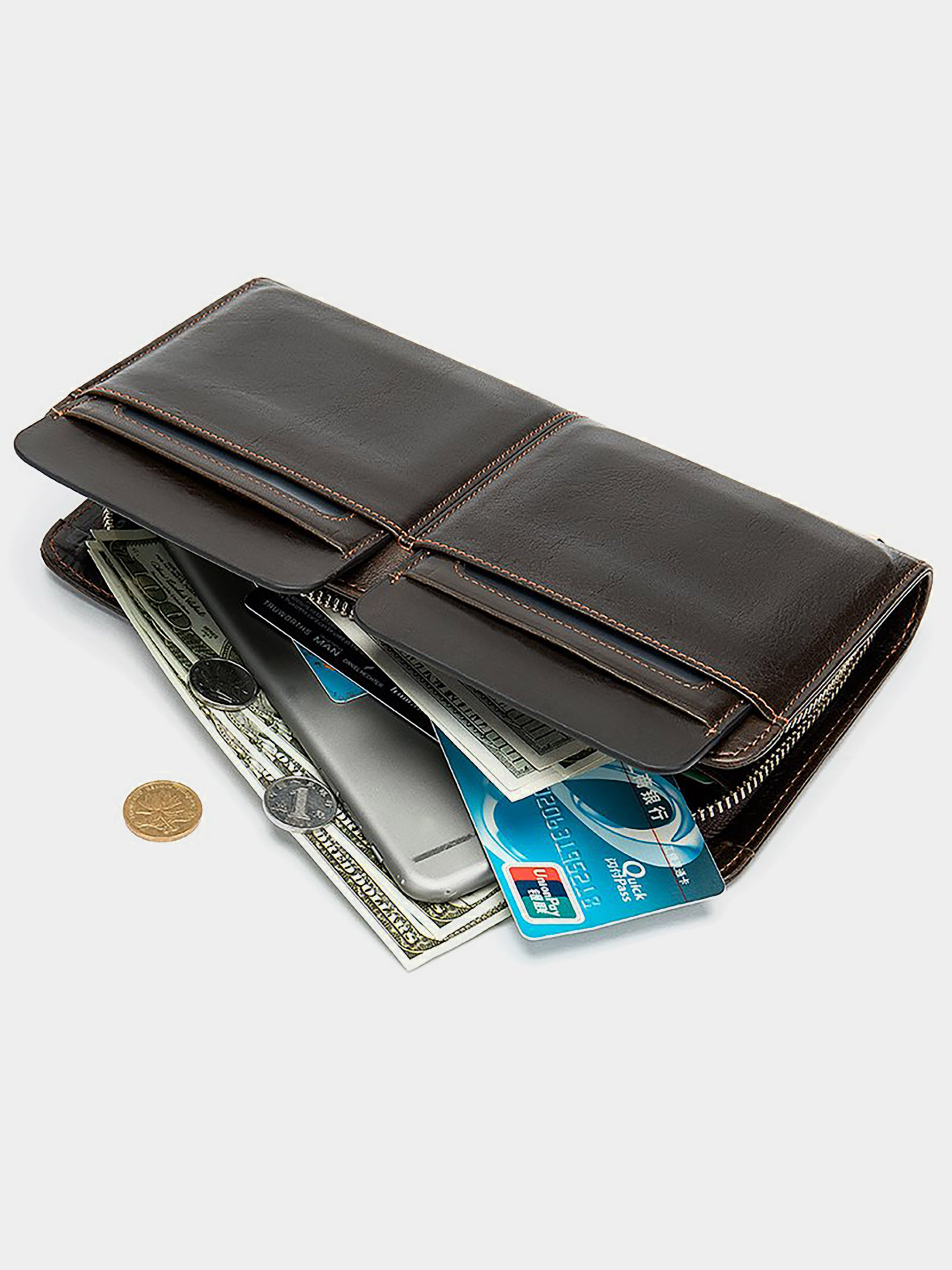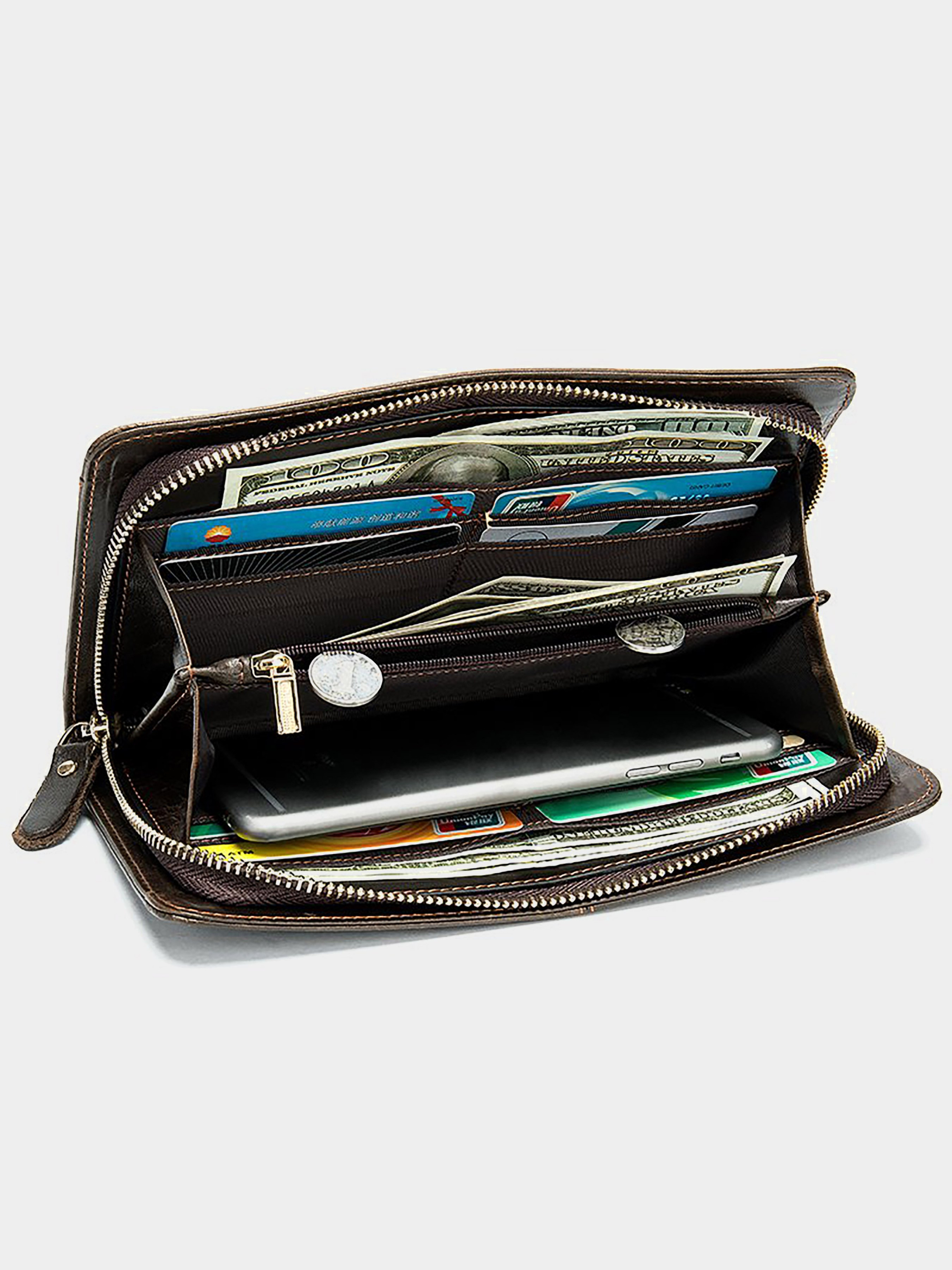 Матеріал: натуральна шкіра високої якості. Колір: коричневий. Розміри (ШхВхГ, см): 21,5х11,5х3см. Країна виробник: Китай. Бренд: Vintage. Опис: - 2 відділи для купюр і перегородка-монетниця на блискавці; - 2 відкритих кишені; - 8 осередків для кредиток; - знімна ручка на зап'ясті; - на лицевій стороні 2 відкриті кишені зі вкладишами для кредиток або прав (по 3 слоти і один прозорий). Солідний чоловічий клатч в класичному стилі. Підійде для будь-якого стилю і під будь-який образ. Барсетка ідеально впишеться під ваш стиль і стане незамінним аксесуаром. Клатч можна носити як в руці так і на зап'ясті за допомогою знімної ручки. Модель упакована в пилозахисний чохол з тканини. Може бути відмінним подарунком для близької людини.