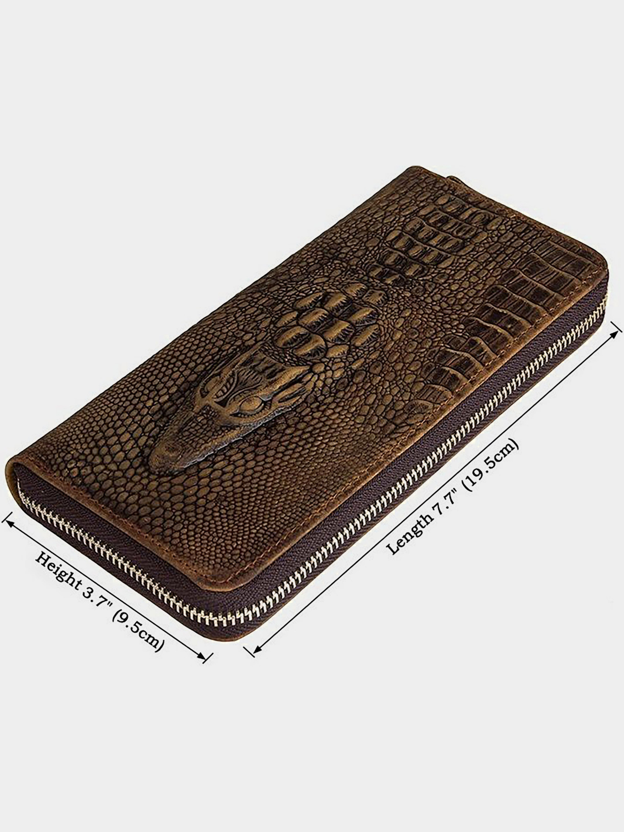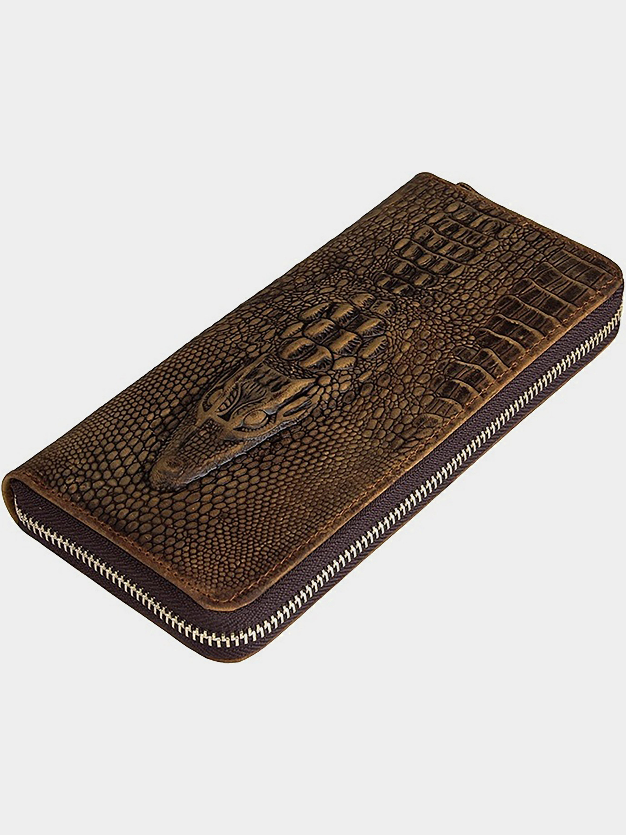 Матеріал: натуральна шкіра високої якості; Колір: коричневий; Розміри: 19,5 на 9,5. Ця оригінальна річ виготовлена з натуральної шкіри з тисненням під крокодила, використано тільки якісні матеріали (фурнітура, текстиль для підкладки всередині). Прошито міцною ниткою коричневого кольору. Зовнішній дизайн незвичайний і ефектний, з таким клатчем Ви 100% привернете увагу оточуючих, так що не перестарайтеся демонстрацією (можуть вкрасти). Закривається надійної металевої блискавкою. При відкритті: - Чотири відділи для купюр; - Одна кишеня-перегородка на застібці - На обох стінках обладнано по 4-ри місця для пластикових карт або візиток і по одній прихованій кишені. Клатч відмінно лягає в руку і зручний в носінні. Гаманець неймовірно якісний, місткий і практичний у використанні. З таким незвичайним сучасним дизайном і позитивними характеристиками, гаманець-клатч завоює довіру свого власника.