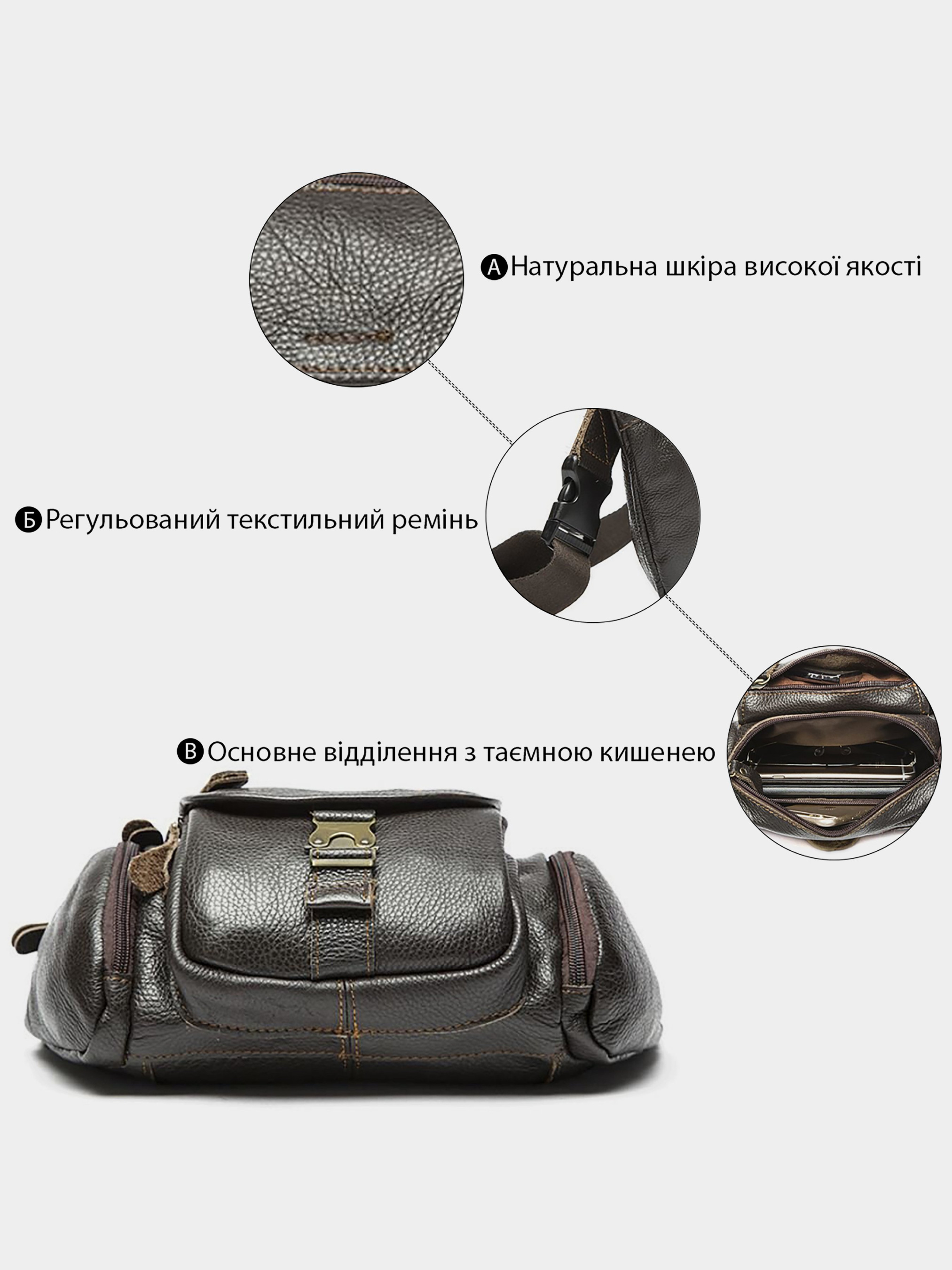 Матеріал: натуральна шкіра високої якості. Колір: коричневий. Розміри (ШхВхГ, см): 27х15,5х10 см. Країна виробник: Китай. Бренд: Vintage. Опис: - основне відділення на змійці з потайною кишенею; - на тильній стороні кишеня на змійці; - на лицьовій стороні кишеня з клапаном на застібці і на змійці і зверху кишенька на змійці; - ремінець на пояс; Зручна і популярна сумка-бананка. Популярність цієї сумки в тому, що вона невеликого розміру, чіпляється на пояс і все необхідне у вас завжди перед очима і під рукою. Ваші важливі речі з такою сумкою будуть в безпеці. З такою сумкою ваші руки будуть вільні. В аксесуар легко поміщається телефон, гаманець, ключі, паспорт, цигарки. Така модель дуже полюбилася водіям завдяки своїй простоті і зручності. Модель упакована в тканинний мішок. Буде чудовим подарунком для близької людини.
