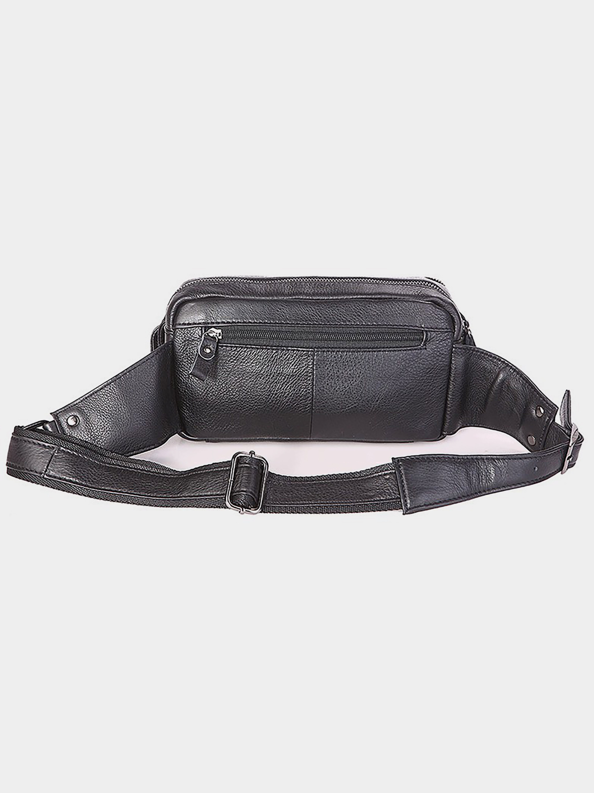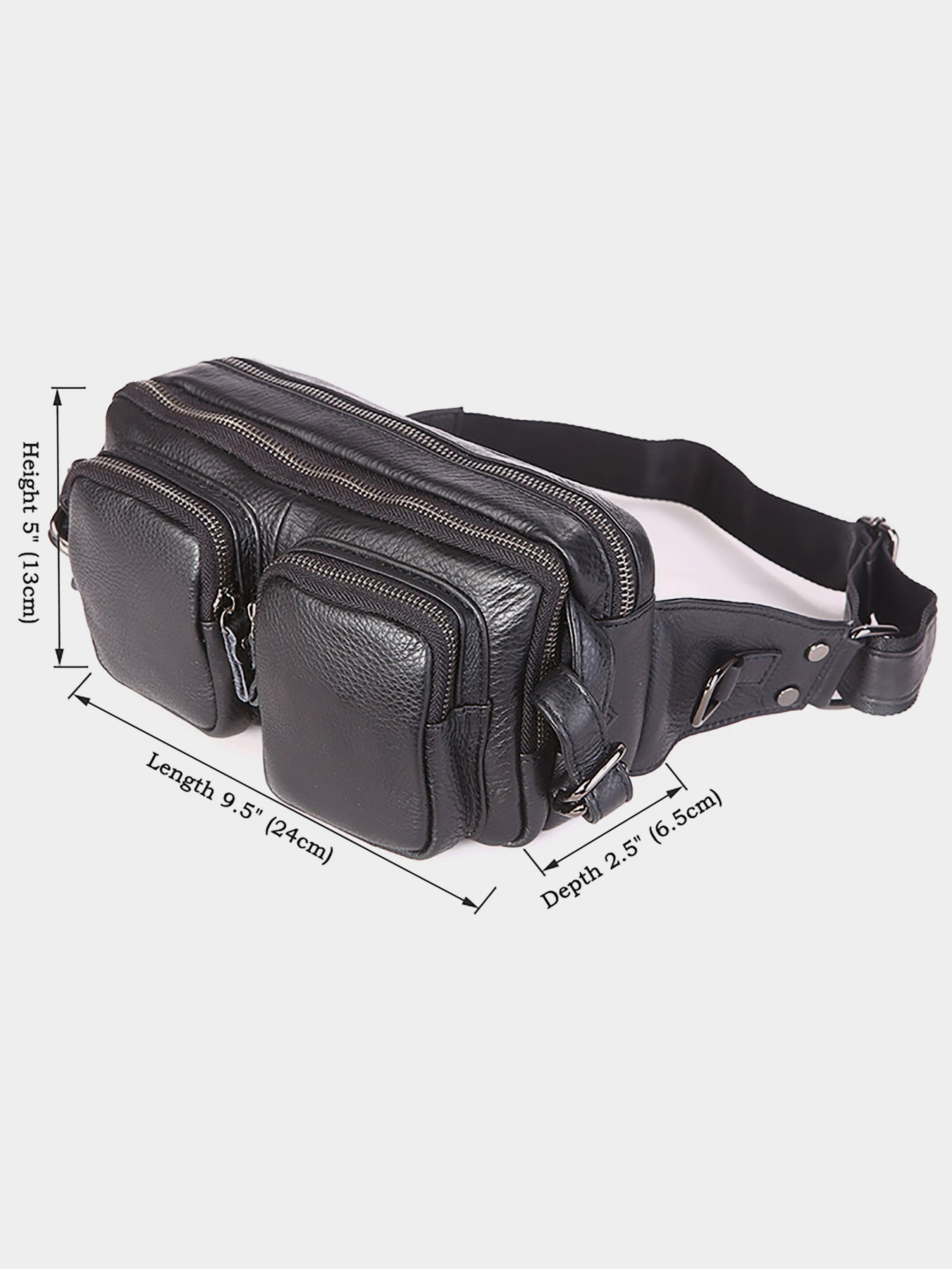 Колір: чорний; Матеріал: натуральна шкіра високої якості; Розміри: 24 на 16 на 6.5 см. Багатофункціональна чоловіча шкіряна поясна сумка. Виглядає дуже стильно. Колір фурнітури: темне срібло. Шкіра, з якої виконаний аксесуар, приємна на дотик. На лицевій стороні виробу розташовані два невеликих відділення на блискавці. На задній зовнішній стороні знаходиться кишеня на блискавці. Сумка має відразу два автономних відділеннями на блискавці, в одному з них знаходиться накладна кишеня і невелика кишеня на блискавці. Довжина поясного шкіряного ременя при необхідності регулюється. Сумка упакована в текстильний пилозахисний чохол білого кольору.