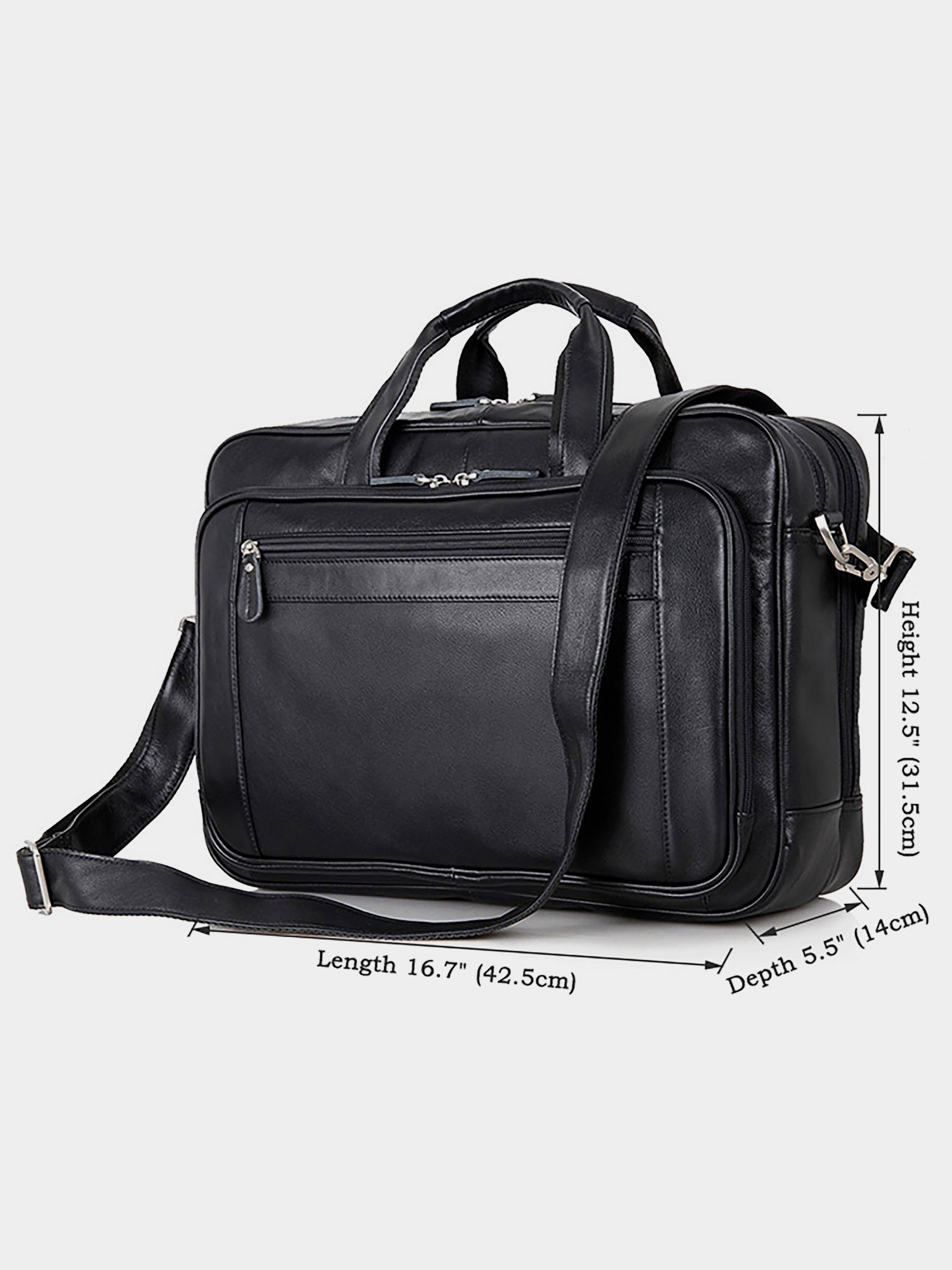 Колір чорний; Матеріал: натуральна шкіра високої якості; Розміри: 42.5 на 31.5 на 14 см. Елітна чоловіча сумка для ноутбука до 17-ти дюймів. Аксесуар виконаний з натуральної високоякісної шкіри чорного кольору. Колір фурнітури: срібло. Переносити дану модель можна в руці, або через плече (в комплекті є регульований плечовий ремінь).На лицевій стороні розташована потайна кишеня на блискавці, а також величезне відділення на блискавці в якому Ви знайдете: - накладну кишеню для мобільного телефону; - три тримачі для кулькових ручок; - три кишеньки для пластикових карток; - потаємне відділення на блискавці. Сумка має відразу два автономних відділення, які закриваються блискавками: У першому: - потайна кишеня на блискавці. У другому: - відділення для невеликого ноутбука. На задній зовнішній стороні даного аксесуару знаходиться відділення на блискавці. Сумка упакована в текстильний пилозахисний чохол білого кольору.