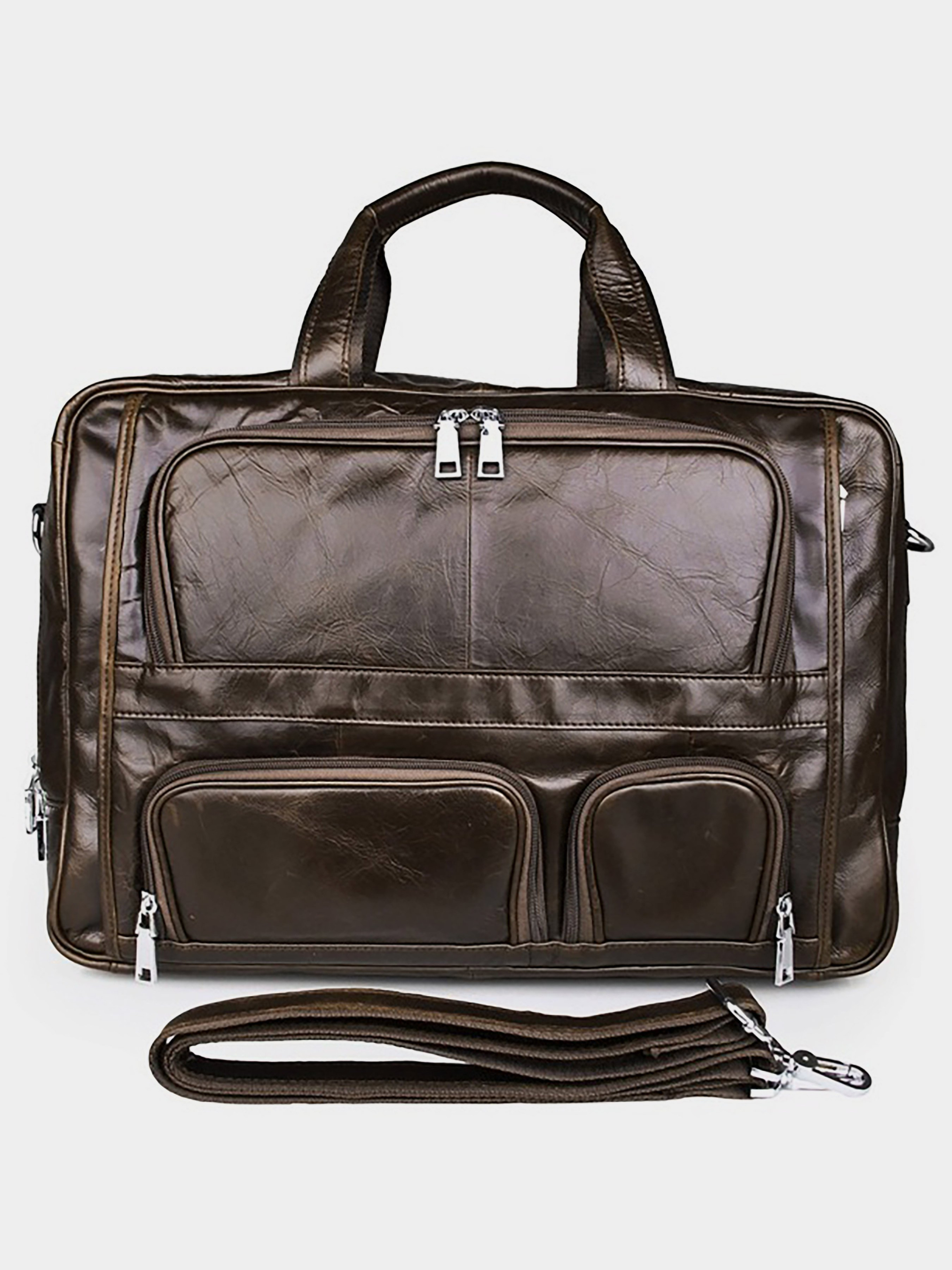 Матеріал: натуральна шкіра; Колір: коричневий; Розміри (ШхВхГ, см): 44.5х31х14. Велика чоловіча шкіряна сумка з безліччю відділень і кишень. Аксесуар можна переносити за допомогою зручних ручок в руці, а також через плече. На задній зовнішній стороні виробу розташована ручка, за допомогою, якої сумка при необхідності кріпитися до валізи. Колір фурнітури: срібло. Аксесуар можна використовувати для носіння папки з документами і ноутбука, а також як сумку для спортзалу. Особливості: - 3 великих автономних відділення на блискавках: а) в 1-му знаходиться відділення для ноутбука; б) 2-е просто закривається і не має додаткових кишень і відділень; в) в 3-му потайна кишеня на блискавці, 2 невеликі накладні кишені; - на лицевій стороні 2 кишені і одне відділення на блискавці; - в комплекті є регульований плечовий ремінь, що знімається.