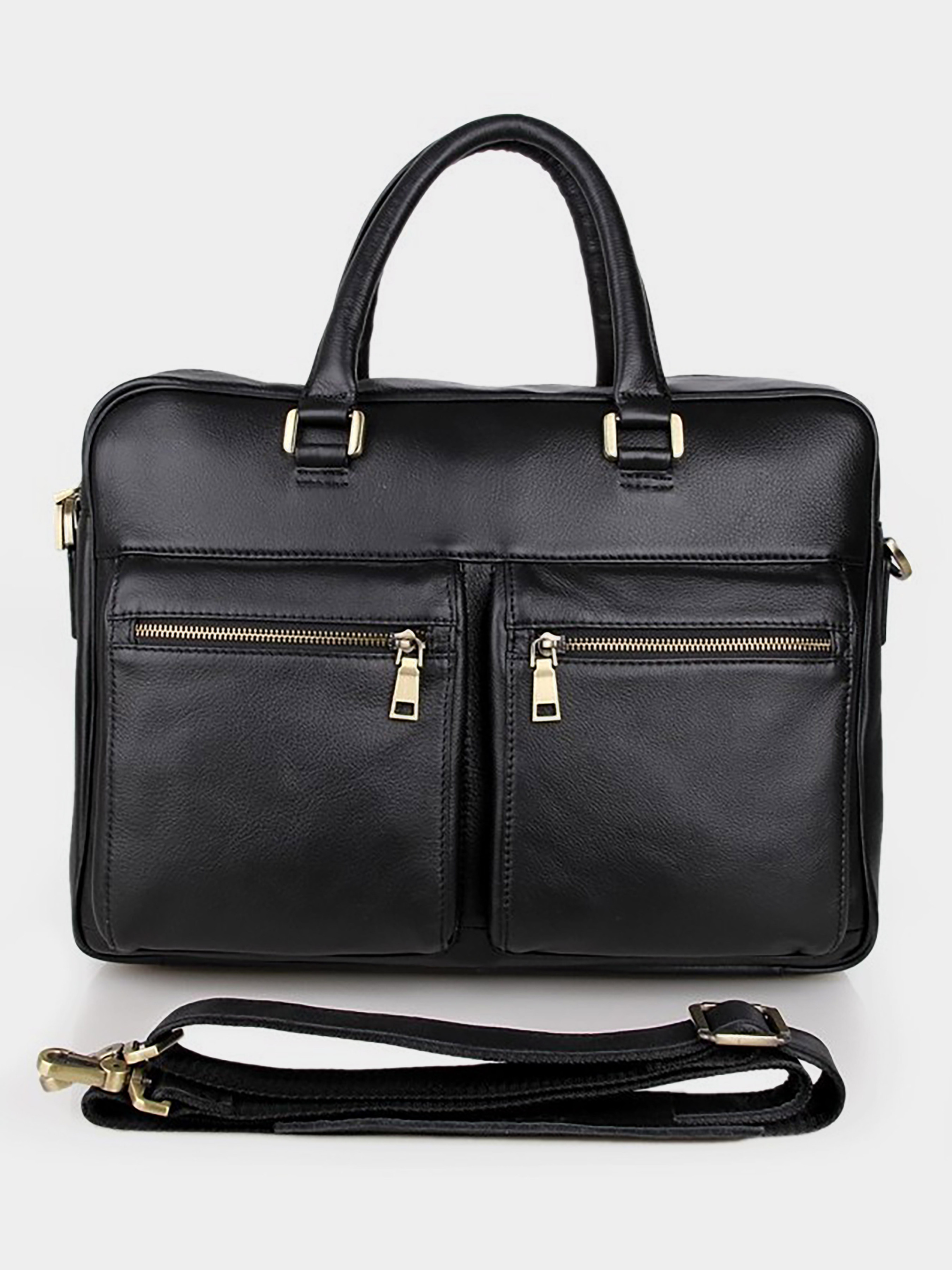 Колір: чорний; Матеріал: натуральна шкіра високої якості; Розміри: 38 на 29 на 10 см. Відмінна чоловіча шкіряна сумка для ноутбука. Носитися дана модель в руці (ручки шкіряні) або через плече (в комплекті є, регульований плечовий ремінь). Колір фурнітури: латунь. На лицевій стороні виробу розташовані дві зручні, симетричні кишені на блискавках. На задній зовнішній стороні знаходиться одне відділення на блискавці. Сумка закривається за допомогою металевої блискавки. Підкладка виконана з надміцного текстильного матеріалу чорного кольору. Всередині: - одне велике відділення; - одне відділення для ноутбука (на передній стінці); - 2 накладні кишені для мобільних телефонів і потаємне відділення на блискавці (на задній стінці).