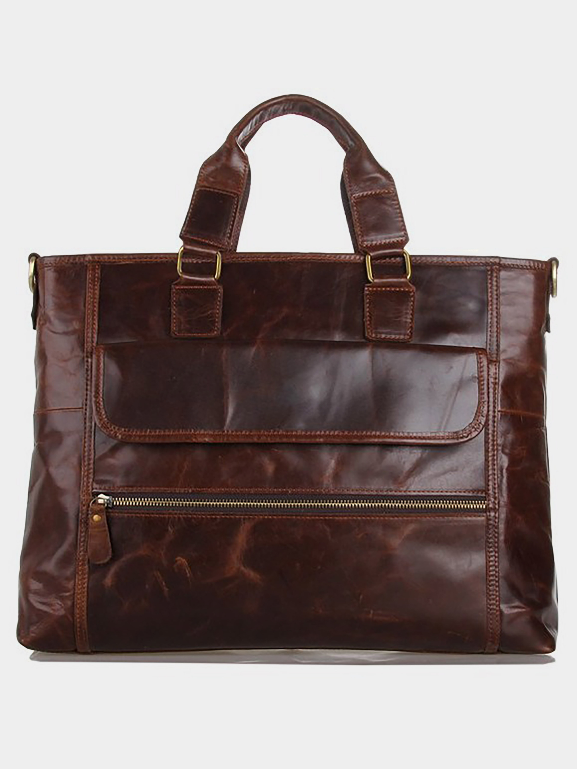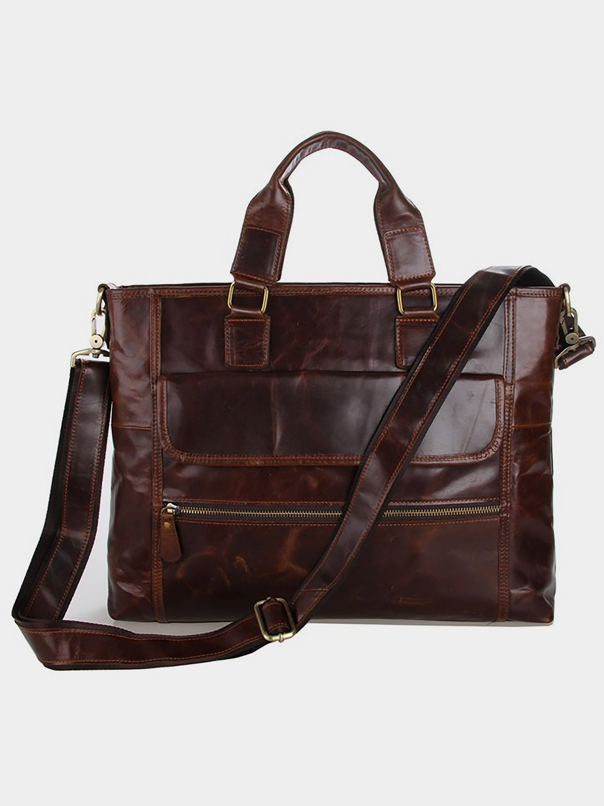 Колір коричневий; Матеріал: натуральна шкіра високої якості; Розміри: 40.5 на 30.5 на 7.5 см. Сучасна, містка шкіряна сумка коричневого кольору. У даній моделі з легкістю поміщається ноутбук з найпопулярнішою діагоналлю 15.6 дюймів. Колір фурнітури: латунь. На лицевій стороні аксесуару знаходиться відділення на блискавці і накладна кишеня на магнітній кнопці. Ще одне відділення на блискавці розташоване на задній зовнішній стороні. Сумку можна переносити в руці, а також через плече. При необхідності плечовий ремінь можна відстебнути. Підкладка виконана з міцного текстильного матеріал темно-коричневого кольору. Всередині: - одне велике відділення; - дві накладні кишені для мобільних телефонів на передній стінці; - велика накладна кишеня і відділення-перегородка на блискавці на задній стінці; - потаємне відділення на блискавці на задній стінці.