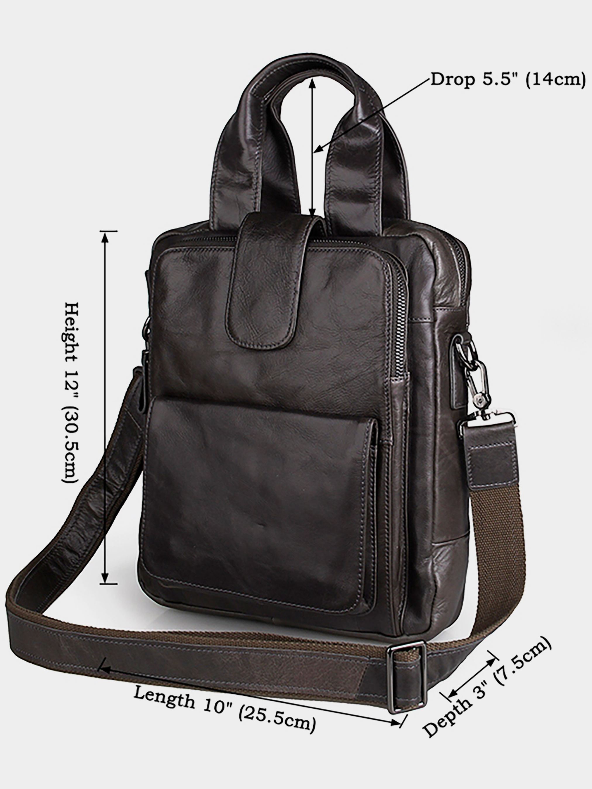 Колір: темно-сірий; Матеріал: натуральна шкіра високої якості; Розміри: 25.5 на 30.5 на 7.5 см. Оригінальна повсякденна сумка темно-сірого кольору з натуральної шкіри високої якості. Сумка досить містка (вміщує формат А4 ) і зручна в носінні. Аксесуар можна носити в руці і через плече (плечовий ремінь йде в комплекті). Сумка відмінно підійде як для повсякденного, так і для ділового стилю. Упакована в текстильний пилозахисний чохол білого кольору. Особливості: - 1 кишеня на 2-х магнітних кнопках на лицевій стороні; - 1-невелике відділення на блискавці на лицевій стороні; - 1-невідділення на блискавці на задній зовнішній стороні. Всередині: - 1-невелике відділення; - потайна кишеня на блискавці на задній стінці; - 2 накладні кишені на задній стінці; - накладна кишеня на передній стінці.