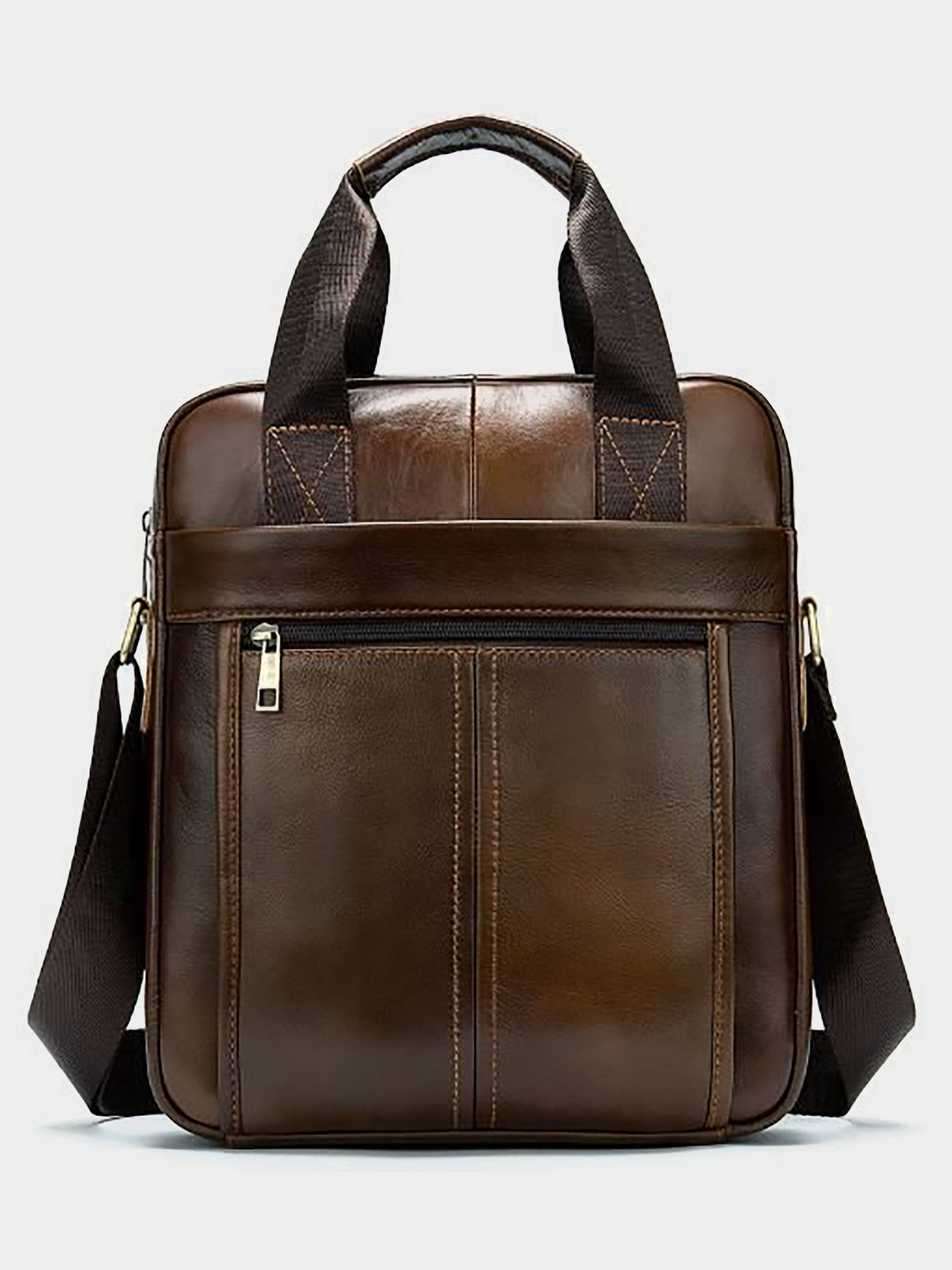 Колір: коричневий; Матеріал: натуральна шкіра високої якості; Розмір (ШхВхГ, см): 27,5х33х6,5; Країна виробник: Китай. Особливості: - основне відділення на блискавці; - потаємна кишеня на блискавці; - 2 відкритих відділення для мобільного телефону; - кишеня на блискавці на тильній стороні аксесуару; - 2 накладних кишені на блискавці на лицьовій стороні; - регульований текстильний ремінець що знімається. Солідна чоловіча сумка з натуральної шкіри в коричневому кольорі. Аксесуар можна носити, як в руках за допомогою ручок, так і на плечі є текстильний ремінець, що знімається. Модель доповнена металевою фурнітурою. По краях аксесуар прошитий рудої ниткою. Ви повинні розуміти, що трохи переплативши за шкіряну сумку ви виграєте в тому, що вона прослужить вам набагато довше ніж текстильні або з замінника. Аксесуар зручно тримати в руці. Сумка неважка і має величезний функціонал. У ній вам буде зручно носити документи або планшет, або книгу. З такою сумкою буде зручно їздити на зустрічі або у відрядження. Вона підкреслить ваш статус і відчуття стилю. Сумка буде бажаним подарунком для будь-якого чоловіка. Аксесуар упакований в тканинний мішок, що захищає його від пилу і вологи під час того як ви його не використовуєте.