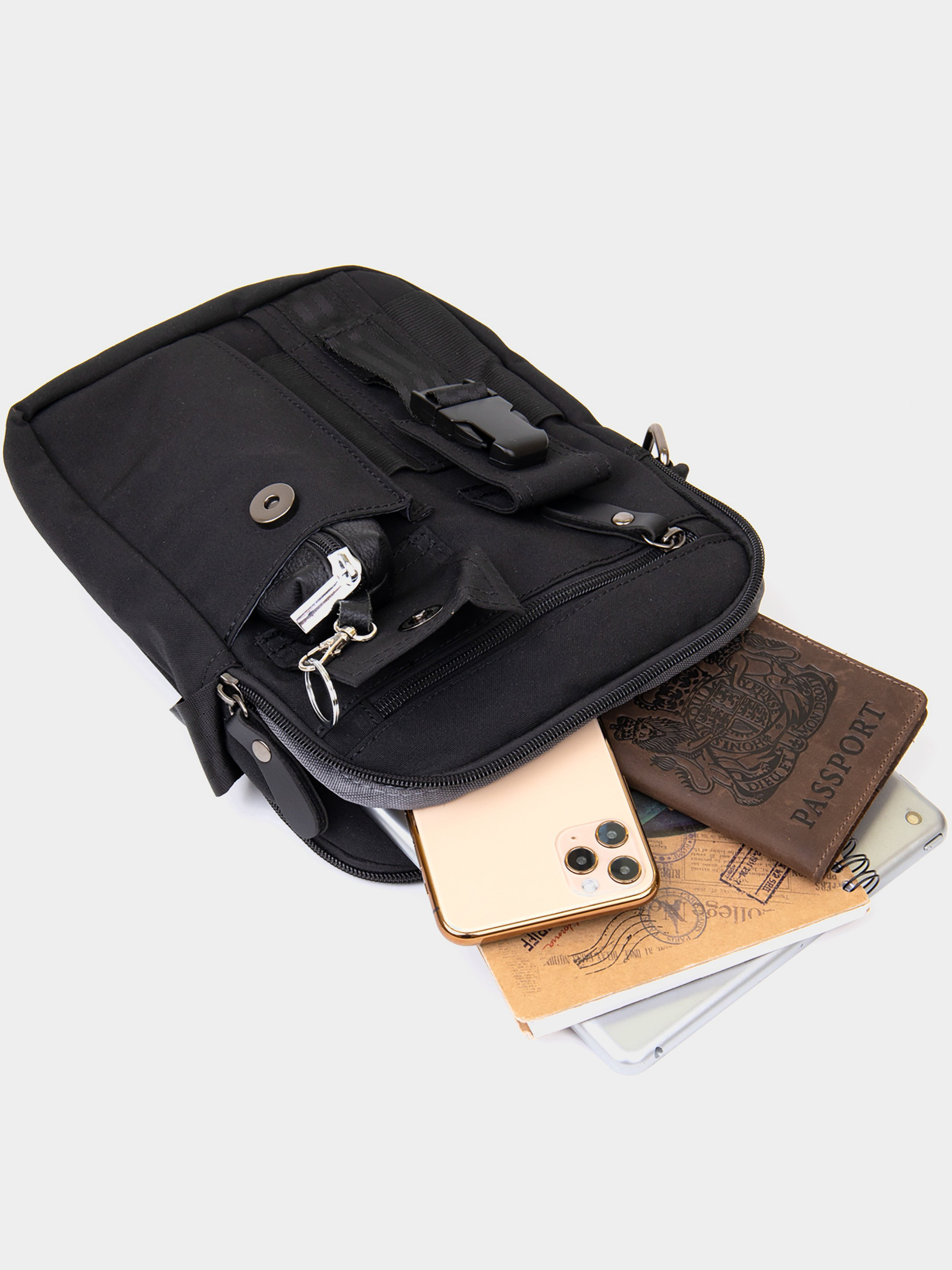 Матеріал: текстиль; Колір чорний; Розміри (ШхВхГ, см): 20х26,5х4. Країна виробник: Китай. Особливості: - два основних відділення на блискавках; - в ближньому відділенні дві кишеньки для мобільного телефону і потайна кишеня на блискавці; - в далекому: кишеня відкритого типу; - кишеня відкрита під клапаном на лицьовій стороні; - накладна петелька під механічною застібкою на лицьовій стороні; - вбудована кишеня на блискавці; - кишеня на блискавці на тильній стороні сумки; - підкладка з сірої тканини. Текстильна сумка чоловіча. Відмінний варіант на літо. Аксесуар має два основних відділення на блискавках та практичний функціонал з безліччю кишеньок. Сумка доповнена гарною фурнітурою. Виробництво фабричний Китай. Аксесуар ідеально підійде на кожен день. А також як аксесуар для прогулянок. Сумка дуже легка. Колір виробу практичний і на ньому не видно бруду. Текстильна сумка - чудовий варіант для тих, хто хоче заощадити свої кошти.