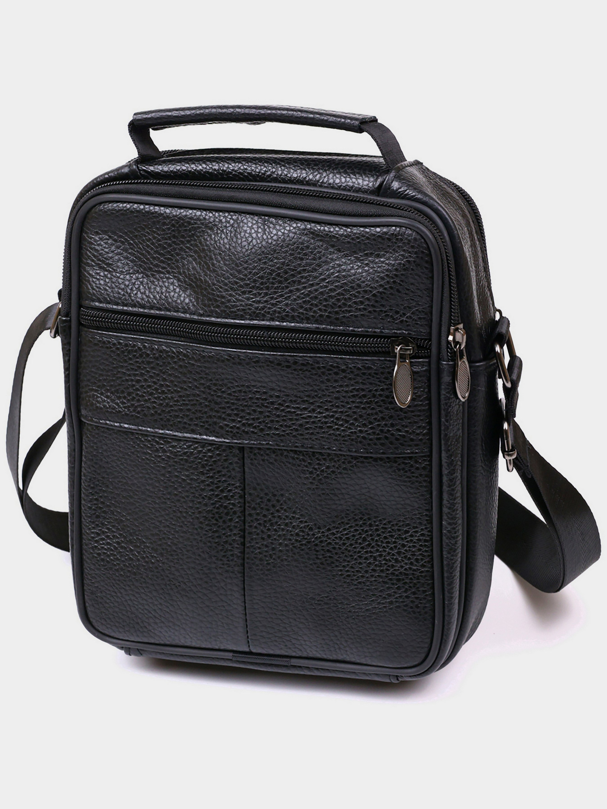 Колір чорний; Матеріал: натуральна шкіра; Розміри (ШхВхГ, см): 19х21х8 см Країна виробник: Китай. Бренд: Vintage. Опис: - 2 відділення на блискавці; - усередині невелика кишеня на блискавці; - на зовнішній стороні 3 кишені на блискавці; - на тильній стороні кишеня на блискавці; - регульований текстильний ремінь для перенесення на плечі; - зручна ручка для перенесення сумки в руках. Невеликий чоловічий месенджер із високоякісної натуральної шкіри, яка стійка до різних пошкоджень та зносу. Має два місткі відділення та чотири додаткові кишені для різних аксесуарів. Ремінь виконаний із міцного текстилю та регулюється по довжині. Колір виробу - універсальний чорний, що дуже практично і зручно.