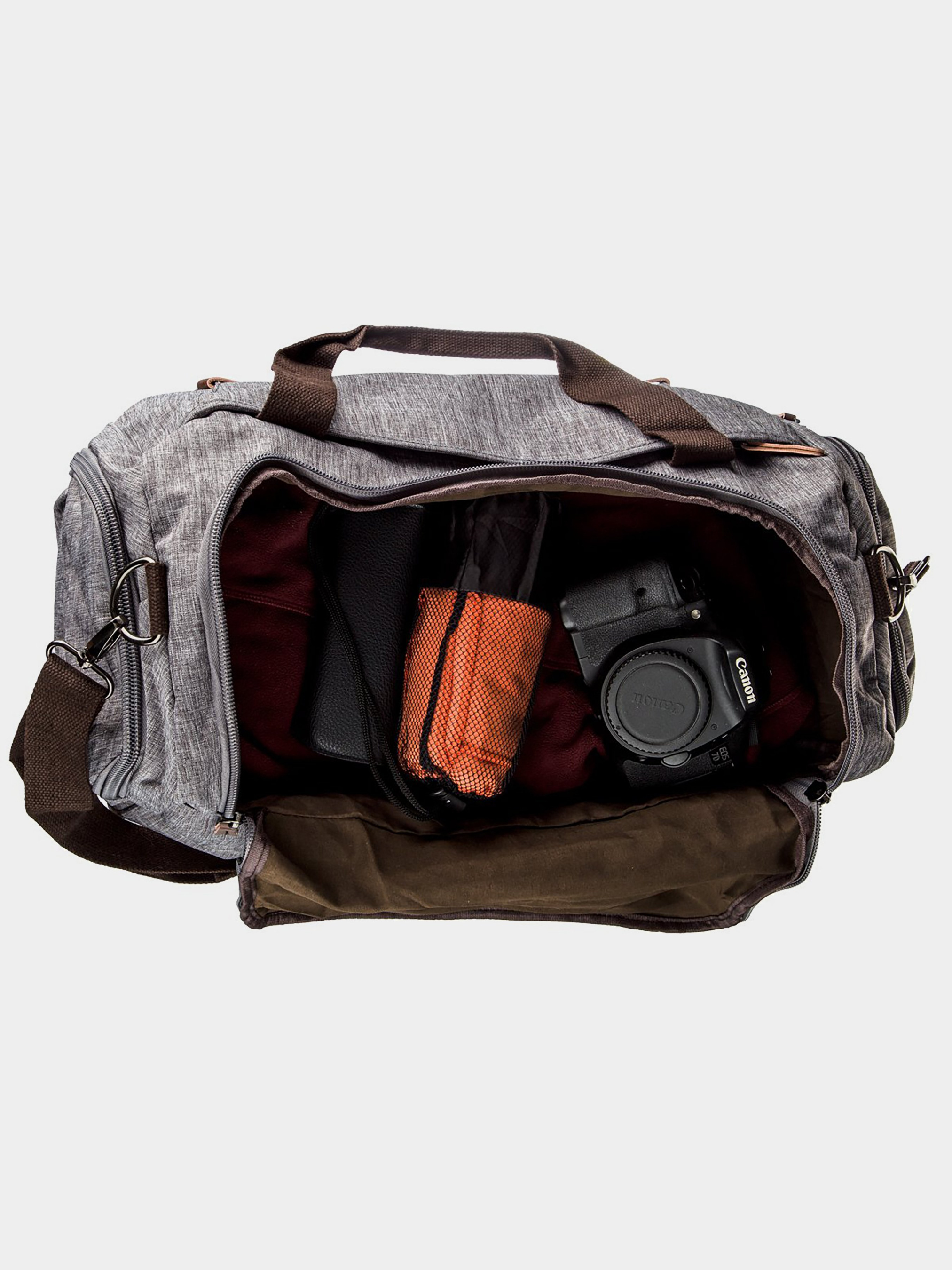 Матеріал: текстиль; Колір сірий; Розміри (ШхВхГ, см): 46х30х21. Країна виробник: Китай. Особливості: - основне відділення на змійці з потайною кишенею на змійці і двома накладними кишенями; - накладна кишеня на змійці на лицьовій стороні аксесуара; - кишеня на змійці на тильній стороні; - дві бічні кишені на змійках; - текстильний регульований ремінець на плече; - ущільнене дно з захисними ніжками; - підкладка з коричневої тканини. Дуже містка і в той же час легка текстильна сумка. Модель з ущільненим дном і захисними ніжками. Виріб ви можете носити як на плечі, так і в руках. Текстильна сумка відрізняється своєю доступністю і більш легкою вагою в порівнянні з моделями з шкіри або шкірозамінника. Модель не мазка, на ній практично не видно бруду. При бажанні сумку ви можете легко випрати. Якщо ви давно шукали собі сумку для відпустки або поїздок додому радимо вам дану модель.