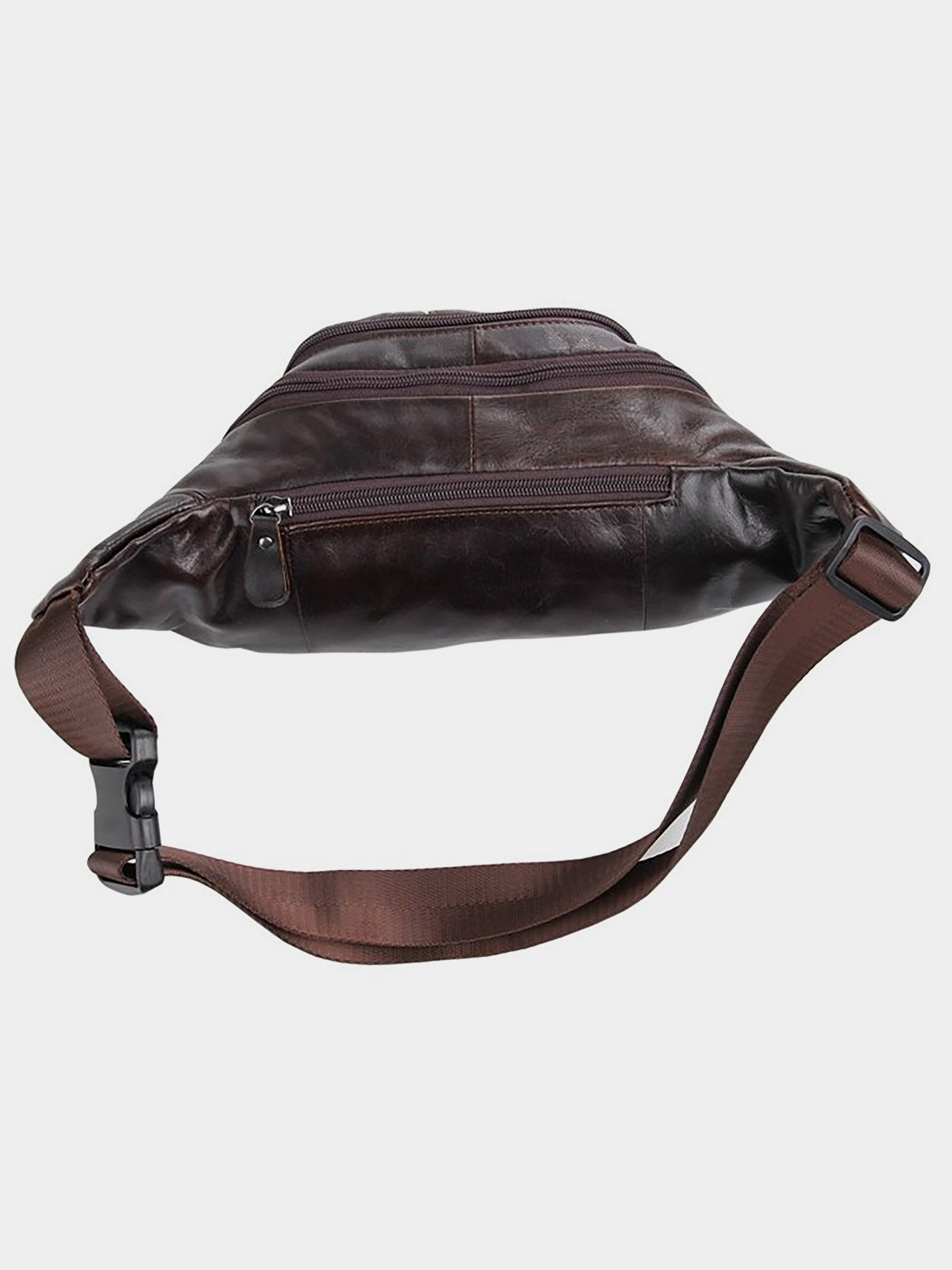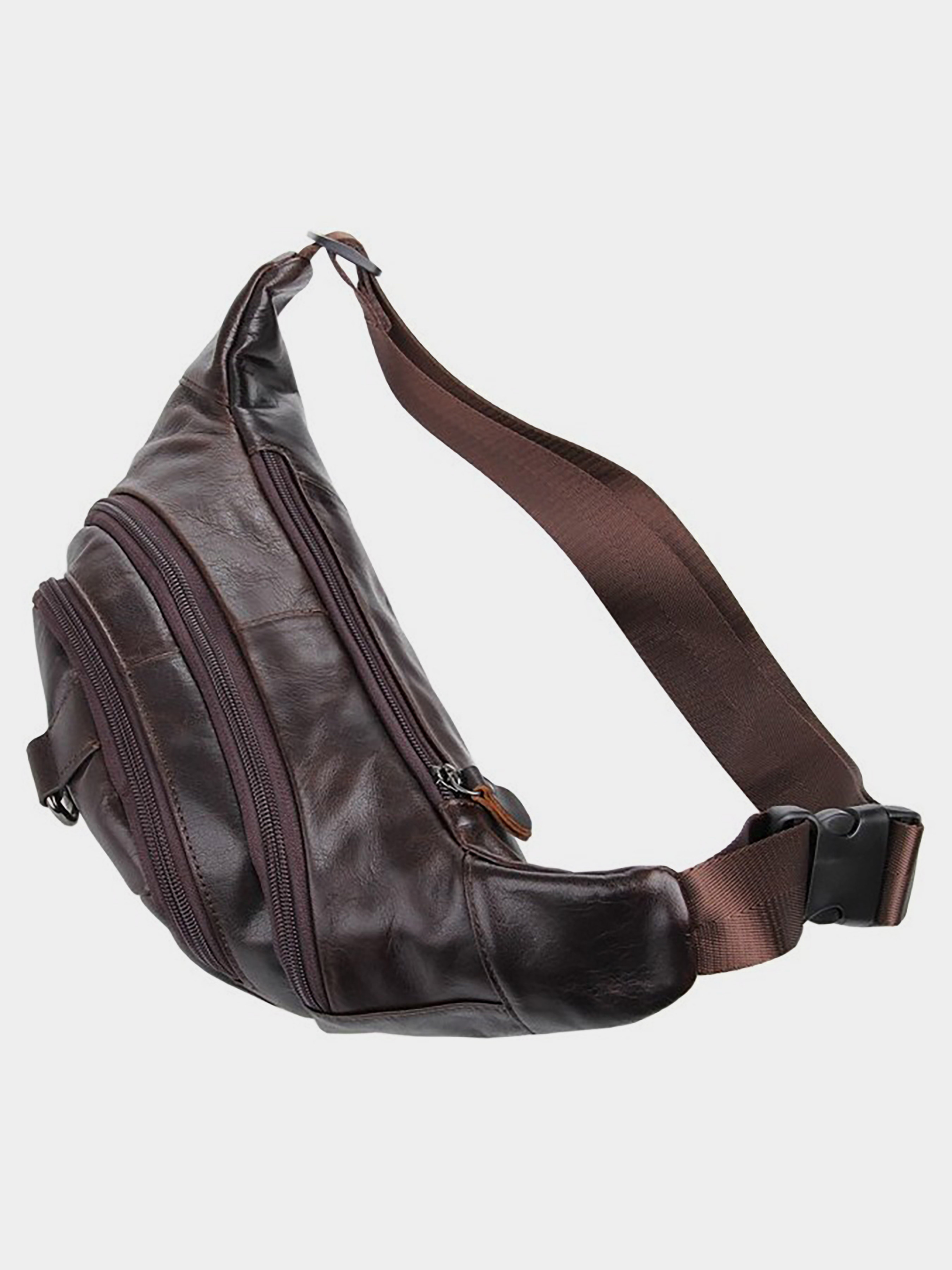 Колір: коричневий; Матеріал: натуральна шкіра високої якості; Розміри: 23 на 12.5 на 10 см. Чудова шкіряна поясна сумка коричневого кольору. Колір фурнітури: темне срібло. Сумка носиться на поясі за допомогою регульованого поясного ременя. Аксесуар має 3 відділення на блискавці. У другому відділенні знаходиться потайна кишеня на блискавці. Сумка надійно прошита міцною темно-коричневою ниткою. Виріб упаковано в текстильний пилозахисний чохол білого кольору.