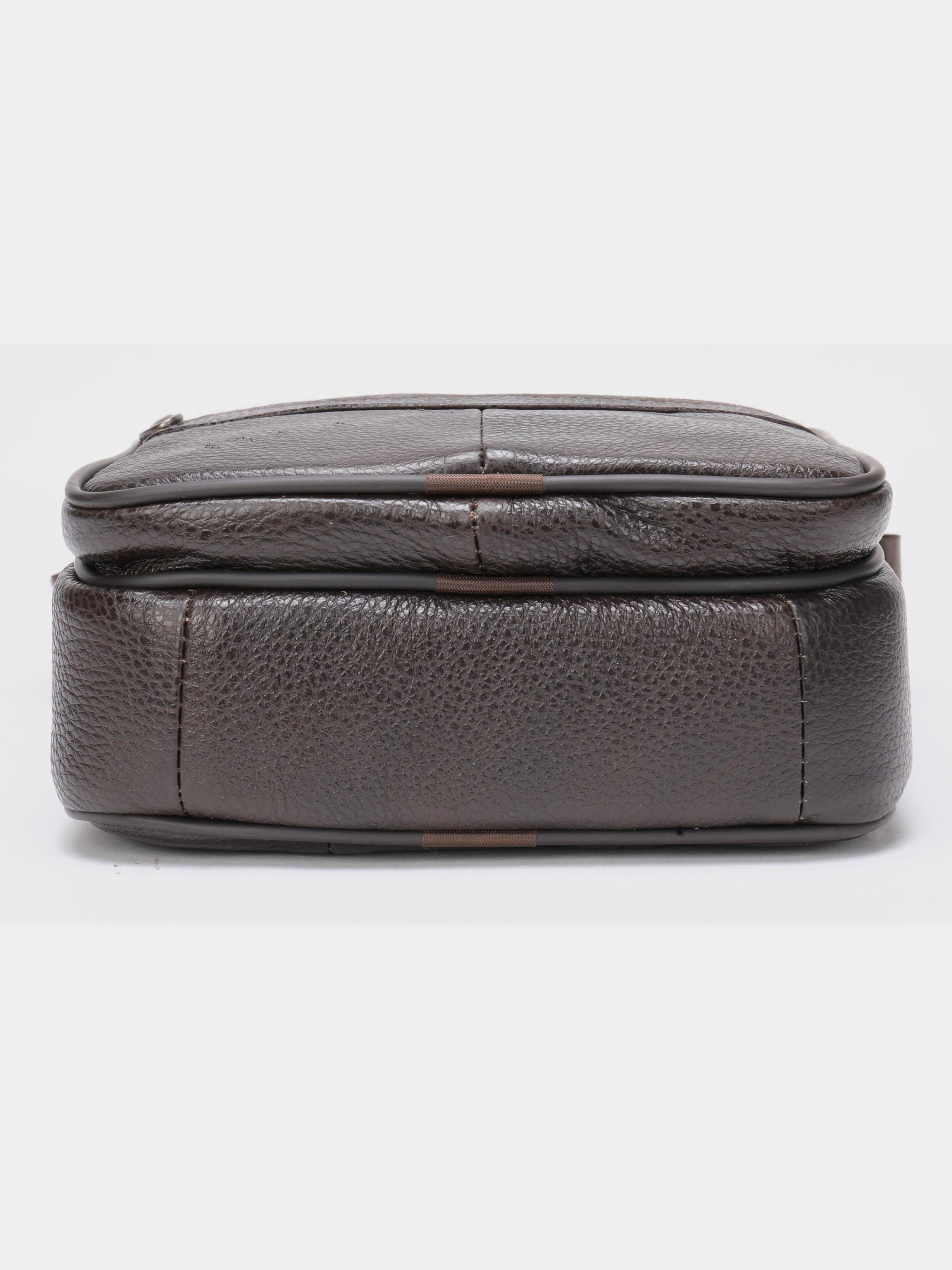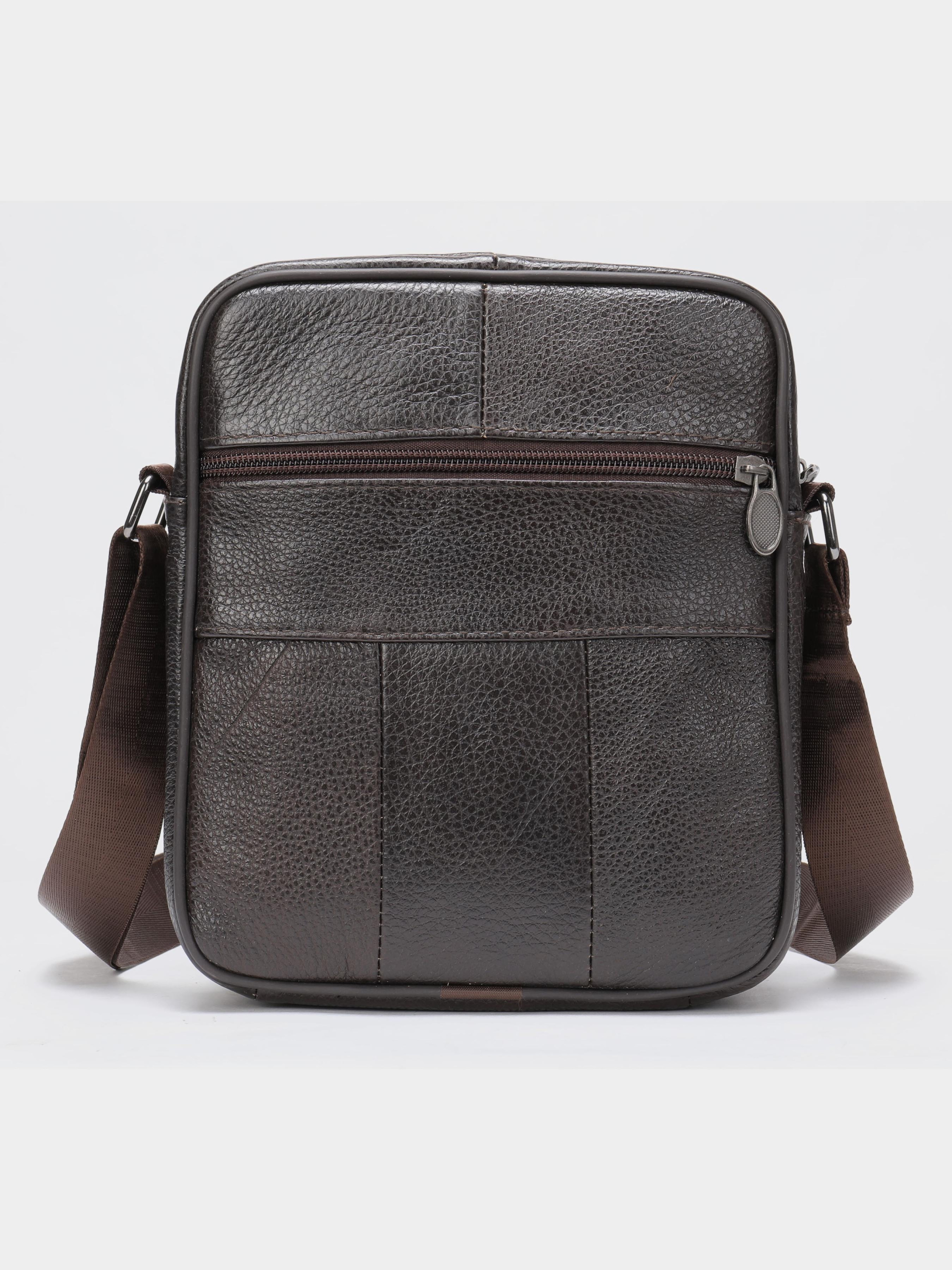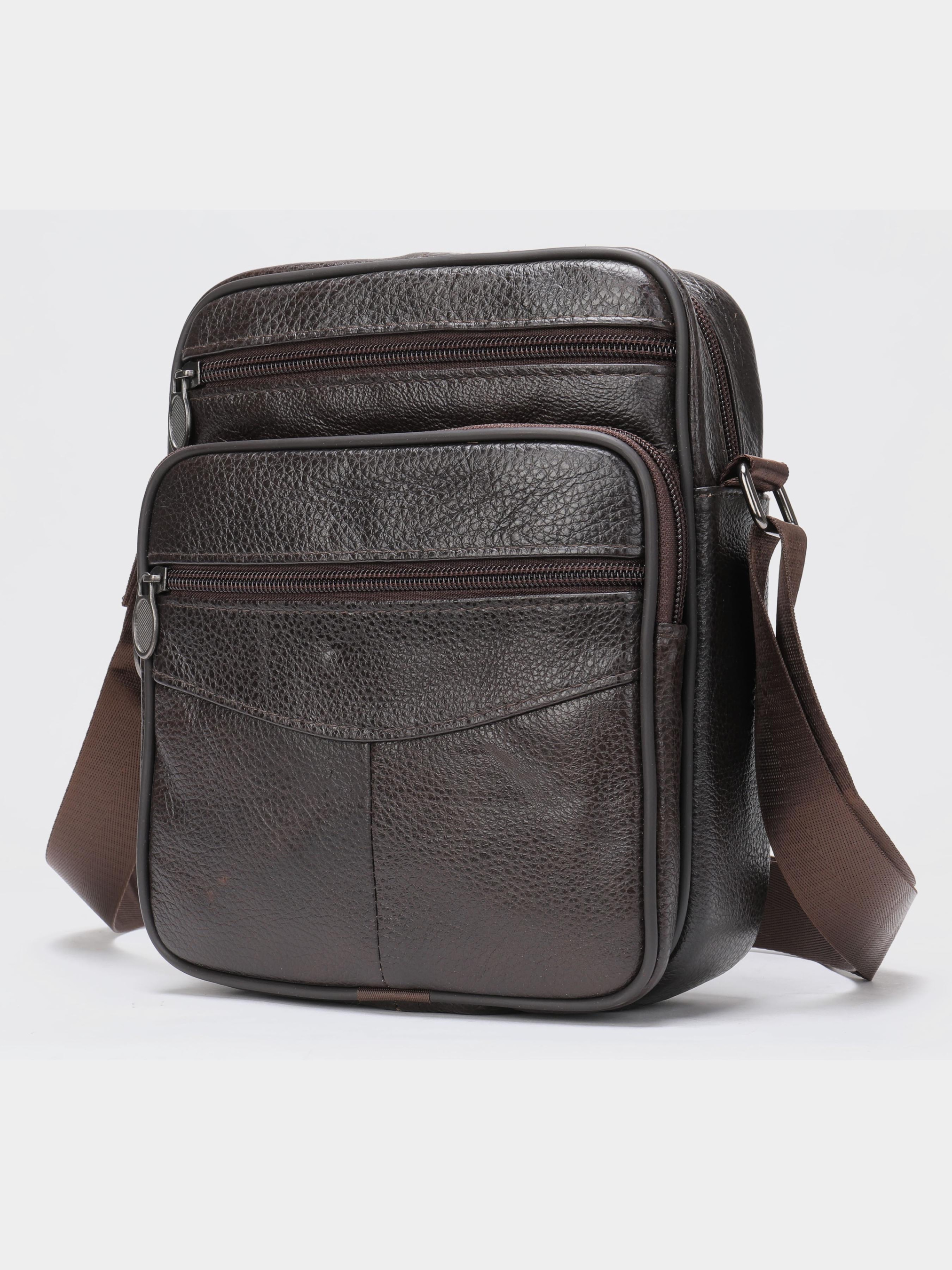Колір коричневий; Матеріал: натуральна шкіра високої якості; Розмір (ШхВхГ, см): 22,5х18,5х5; Країна виробник: Китай. Особливості: - основне відділення на блискавці; - потайна кишеня на блискавці на задній стінці; - кишеня на тильній стороні на блискавці; На лицьовій стороні: - накладна кишенька на блискавці; - регульований текстильний ремінець на плече. Якісна чоловіча сумка з натуральної шкіри. Виріб виконаний з зернистої шкіри коричневого кольору. Усередині аксесуара щільна текстильна підкладка коричневого кольору. Сумка буде вашим ідеальним варіантом на кожен день. Модель дуже зручна. Класичний дизайн ніколи не вийде з моди. Така сумка підійде під будь-які речі з вашого гардеробу. Модель доповнена якісною фурнітурою в дизайн виробу.