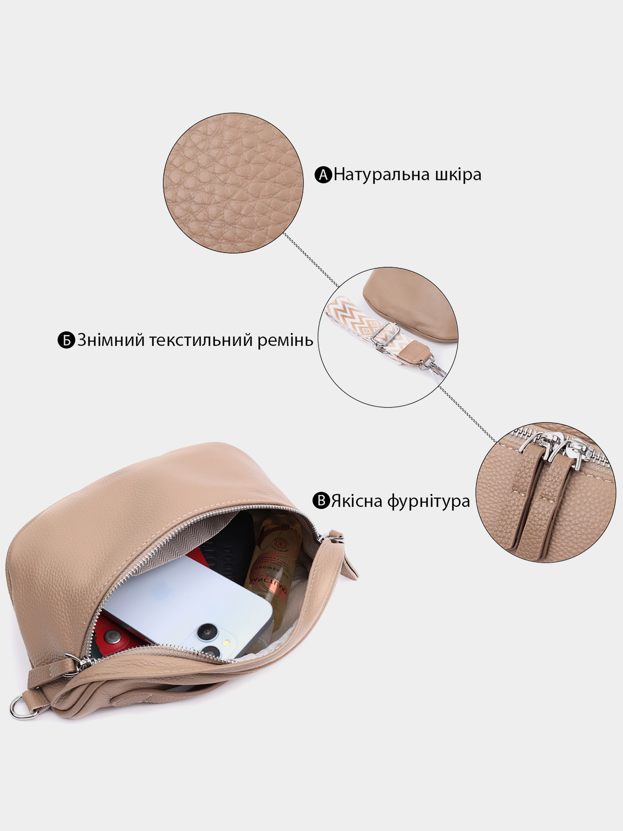 Колір: бежевий; Матеріал: натуральна шкіра; Розмір (ШхВхГ, см): 24х16х6 см; Країна виробник: Китай. Бренд: Vintage. Особливості: - одне основне відділення, що закривається на блискавку; - всередині: кишеня відкритого типу та кишеня на блискавці; - ручка для перенесення до рук; - фурнітура кольору срібла; - знімний текстильний ремінь. Актуальна цього сезону сумка через плече з натуральної шкіри. Аксесуар складається з основного відділення, що закривається на блискавку, кишені на блискавці та кишені відкритого типу усередині. Носити сумку можна на плечі, через плече, а також в руках для цього є текстильний ремінь, що знімається, і шкіряна ручка.