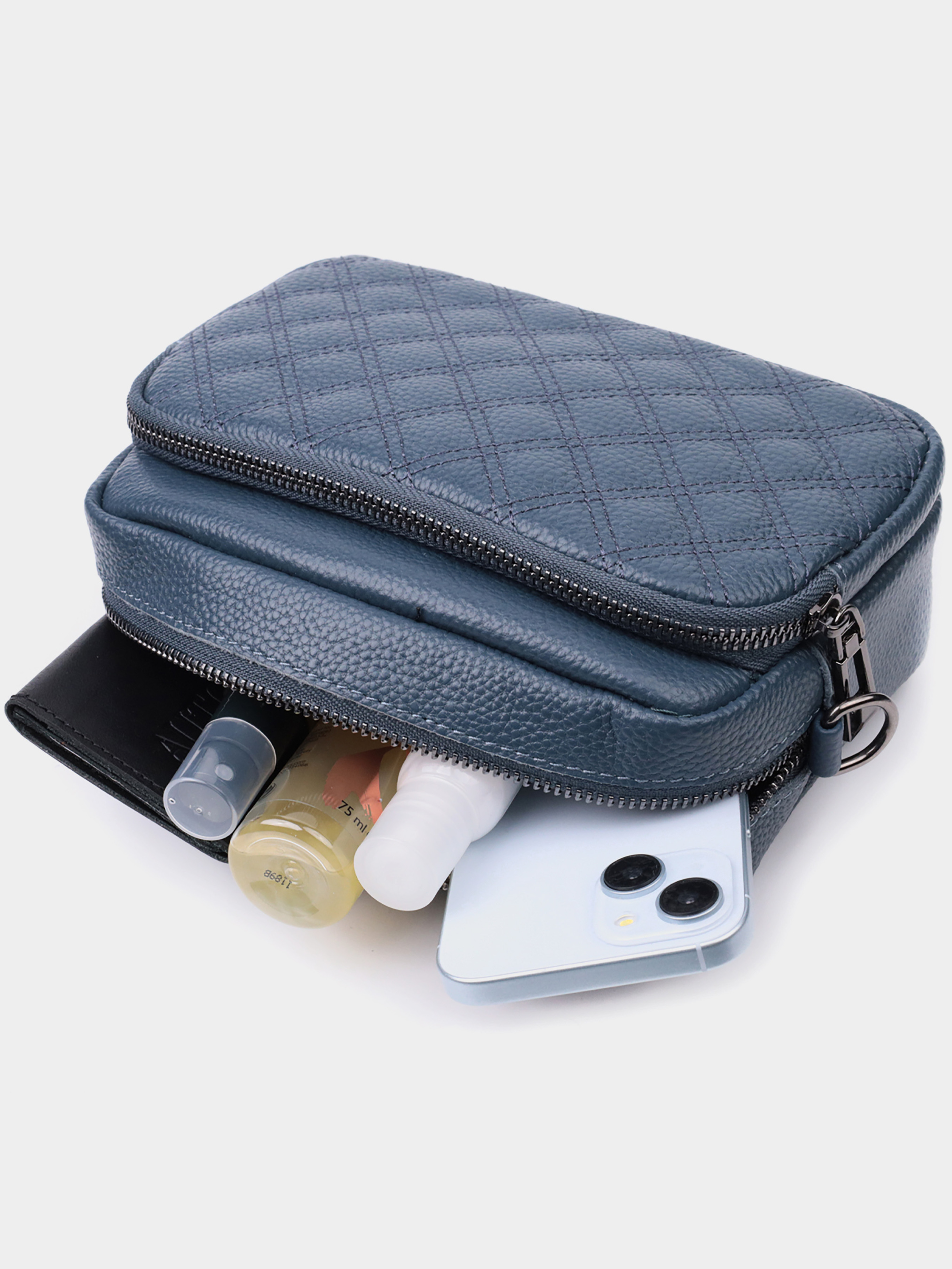 Колір: синій; Матеріал: натуральна шкіра; Розмір (ШхВхГ, см): 21х15х7см; Країна виробник: Китай. Бренд: Vintage. Особливості: - містке основне відділення, що закривається на блискавку; - усередині: потайна кишеня на блискавці та кишеня відкритого типу; - вбудована кишеня на блискавці на тильній стороні; - накладна кишеня на блискавці на лицьовій стороні; - фурнітура кольору темного срібла; - знімний текстильний ремінь. Відмінна сумка в незвичайному кольорі для жінок із натуральної шкіри. Сумка прошита на лицьовій стороні трендовими ромбами, що надає аксесуару стилю. Носити сумку можна на плечі та через плече, також можна носити як клатч під рукою, для цього можна зняти текстильний ремінець.