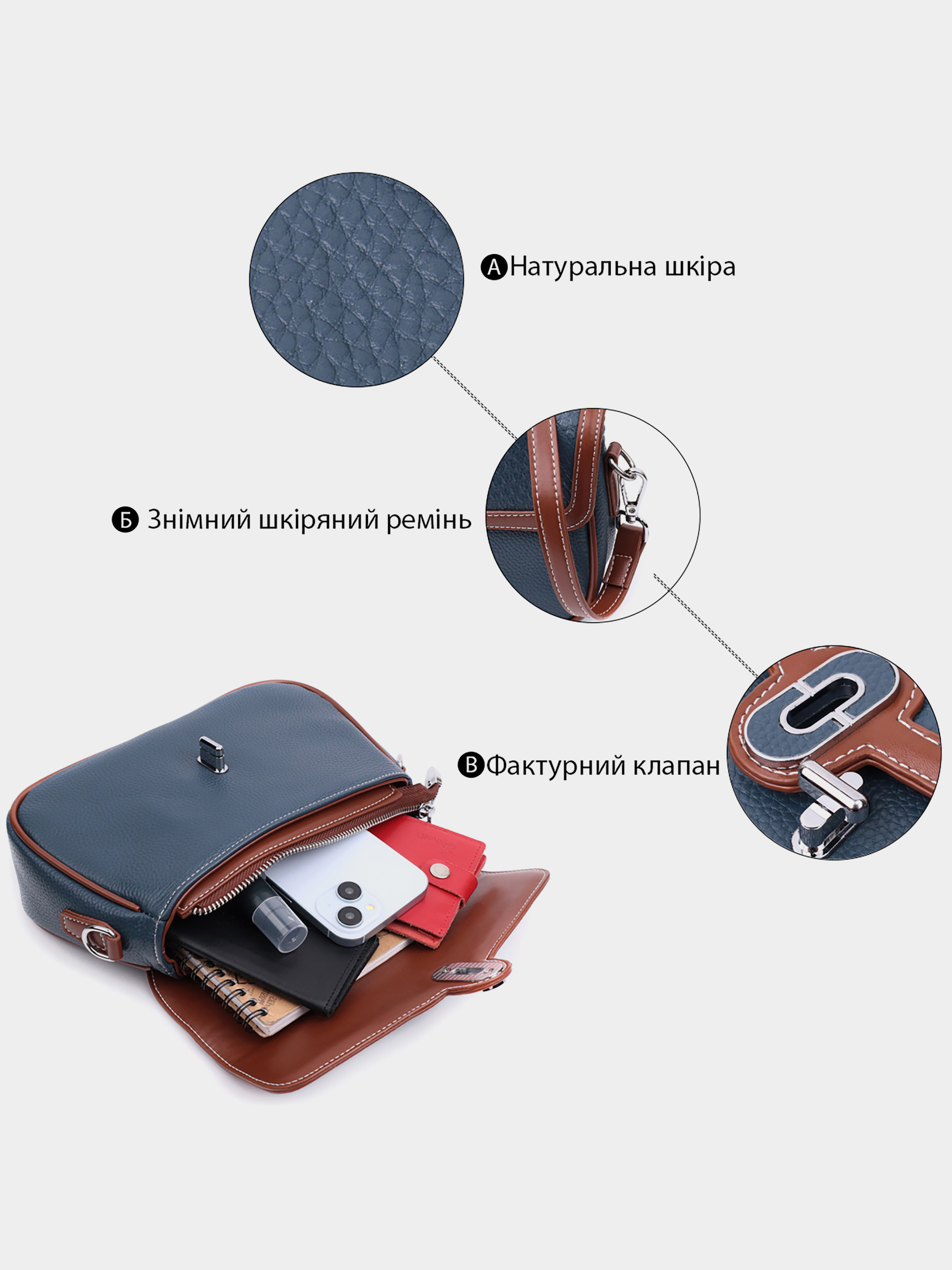 Колір: синій; Матеріал: натуральна шкіра; Розмір (ШхВхГ, см): 25,5х15х7,5см; Країна виробник: Китай. Бренд: Vintage. Особливості: - містке основне відділення, що закривається на блискавку та на клапан з механічною клямкою; - всередині: дві кишені на блискавках та кишеня відкритого типу; - вбудована кишеня на блискавці на тильній стороні; - фурнітура кольору срібла; - знімний шкіряний ремінь. Практична каркасна сумка жіноча з натуральної шкіри. У виробі використано шкіру синього та коричневого кольору. Притягує погляд у виробі фактурний клапан із тисненням під змію та витончена механічна клямка. Аксесуар складається з основного відділення, кишені-перегородки на блискавці, потайної кишені на блискавці та кишені відкритого типу, а також ще однієї кишені зовні, на тильній стороні. Носити сумку можна в руці, під рукою, на плечі і через плече, для цього є шкіряний ремінь, що знімається. В аксесуарі використано якісну фурнітуру кольору срібла. Універсальний варіант сумки на вечір, на щодня, а також буде відмінно поєднуватиметься з діловим стилем.