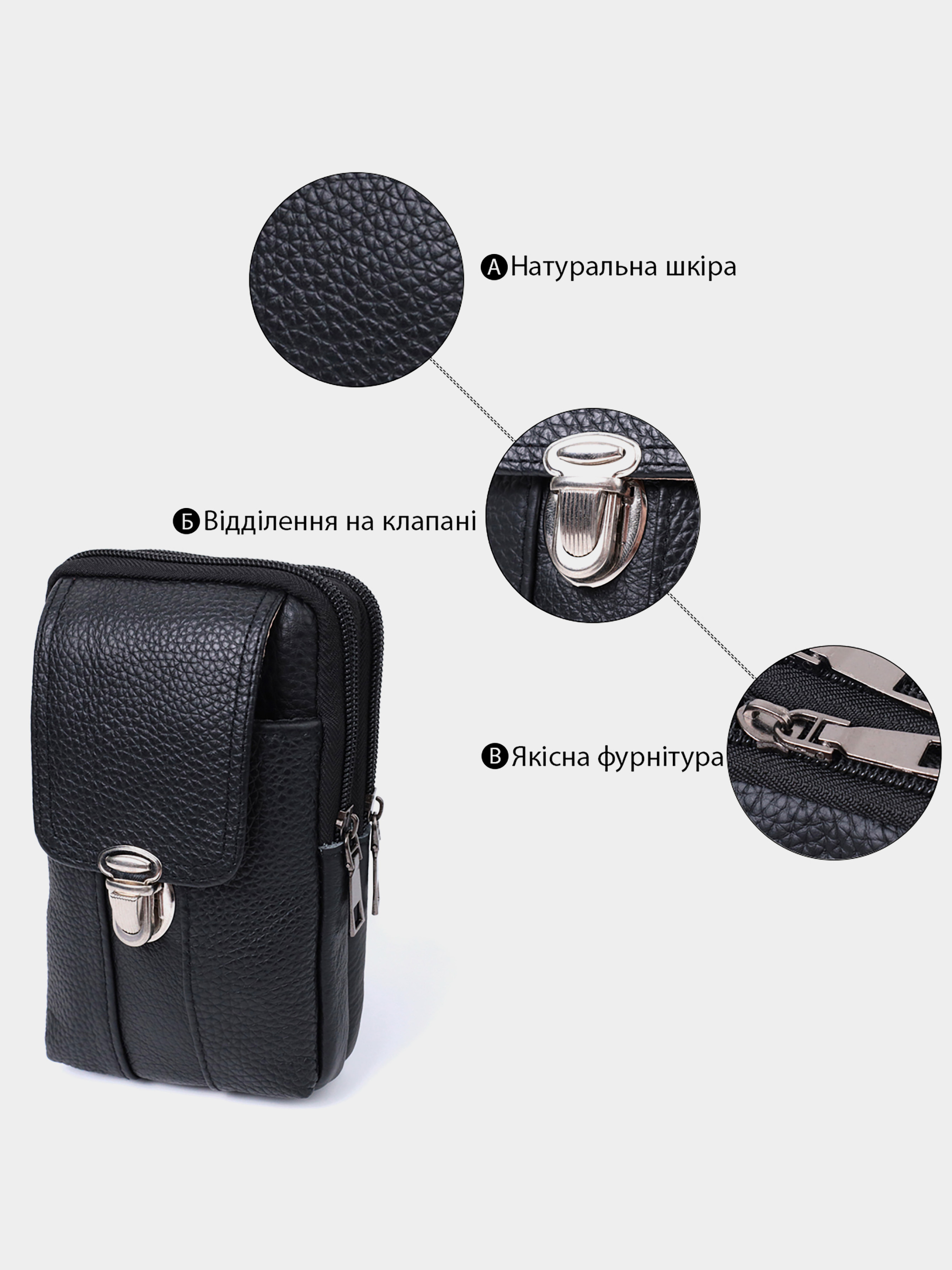 Колір: чорний; Матеріал: натуральна шкіра; Розмір (ШхВхГ, см): 10х17х4 см; Країна виробник: Китай. Бренд: Vintage. Особливості: - два автономні відділення, що закриваються на блискавці; - накладна кишеня для телефону, що закривається клапаном на механічну клямку, на лицьовій стороні; - металевий карабін на тильній стороні; - шкіряна петелька для пояса на тильній стороні. Чудова чоловіча сумка із натуральної шкіри стане доповненням образу сучасного ділового чоловіка. Вона виглядає дуже сучасно, завдяки красиво підібраній кольоровій фурнітурі, елегантним рівним рядкам і якісній шкірі, яка переливається на сонці. Ідеальний подарунок для близької людини.