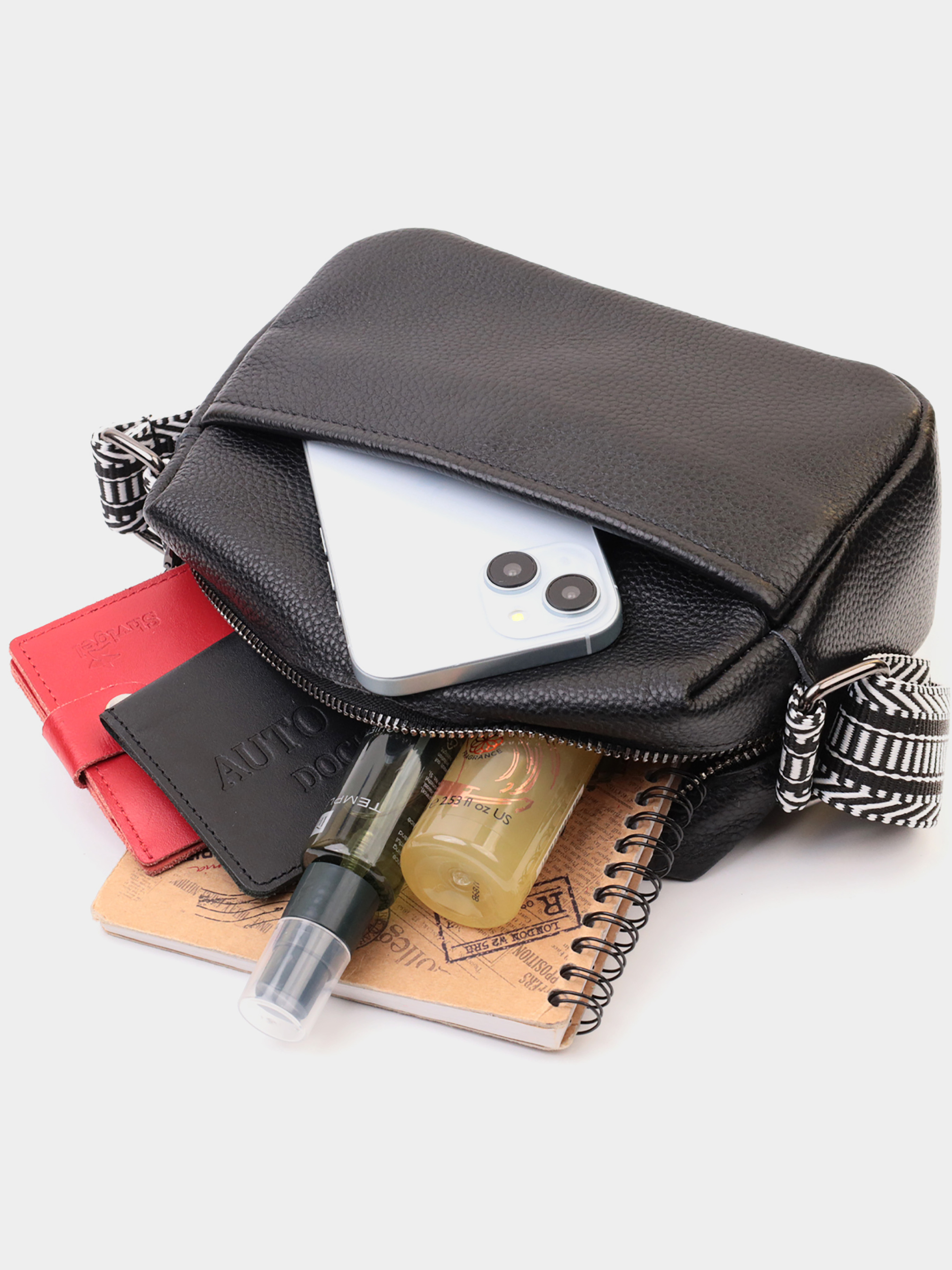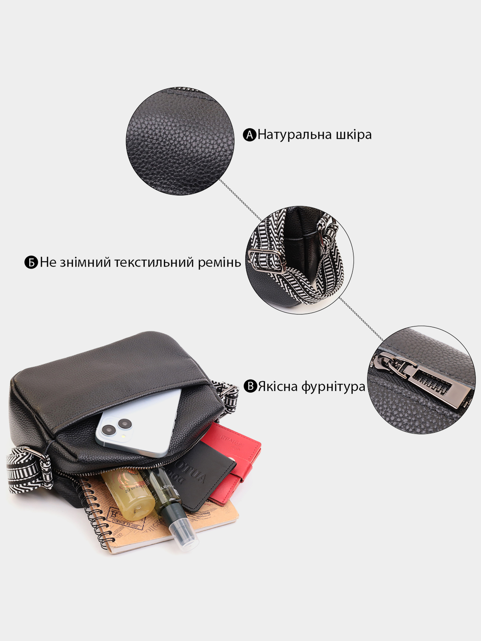 Колір: чорний; Матеріал: натуральна шкіра; Розмір (ШхВхГ, см): 20,5 х14х8, 5см; Країна виробник: Китай. Бренд: Vintage. Особливості: - основне відділення, що закривається на блискавку; - накладна кишеня на блискавці на тильній стороні; - накладна кишеня на лицьовій стороні; - фурнітура кольору темного срібла; - не знімний текстильний ремінь. Жіноча сумка у класичному чорному кольорі на всі випадки з натуральної якісної шкіри. Аксесуар складається з основного відділення, яке закривається на блискавку, а також двох кишень зовні на лицьовій та тильній стороні. Носити сумку можна в руці, під рукою, на плечі і через плече, для цього є текстильний ремінь, що не знімається. В аксесуарі використано якісну фурнітуру кольору темного срібла. У нашому магазині Ви зможете придбати якісний шкіряний аксесуар, який завжди порадує жінку будь-якого віку.