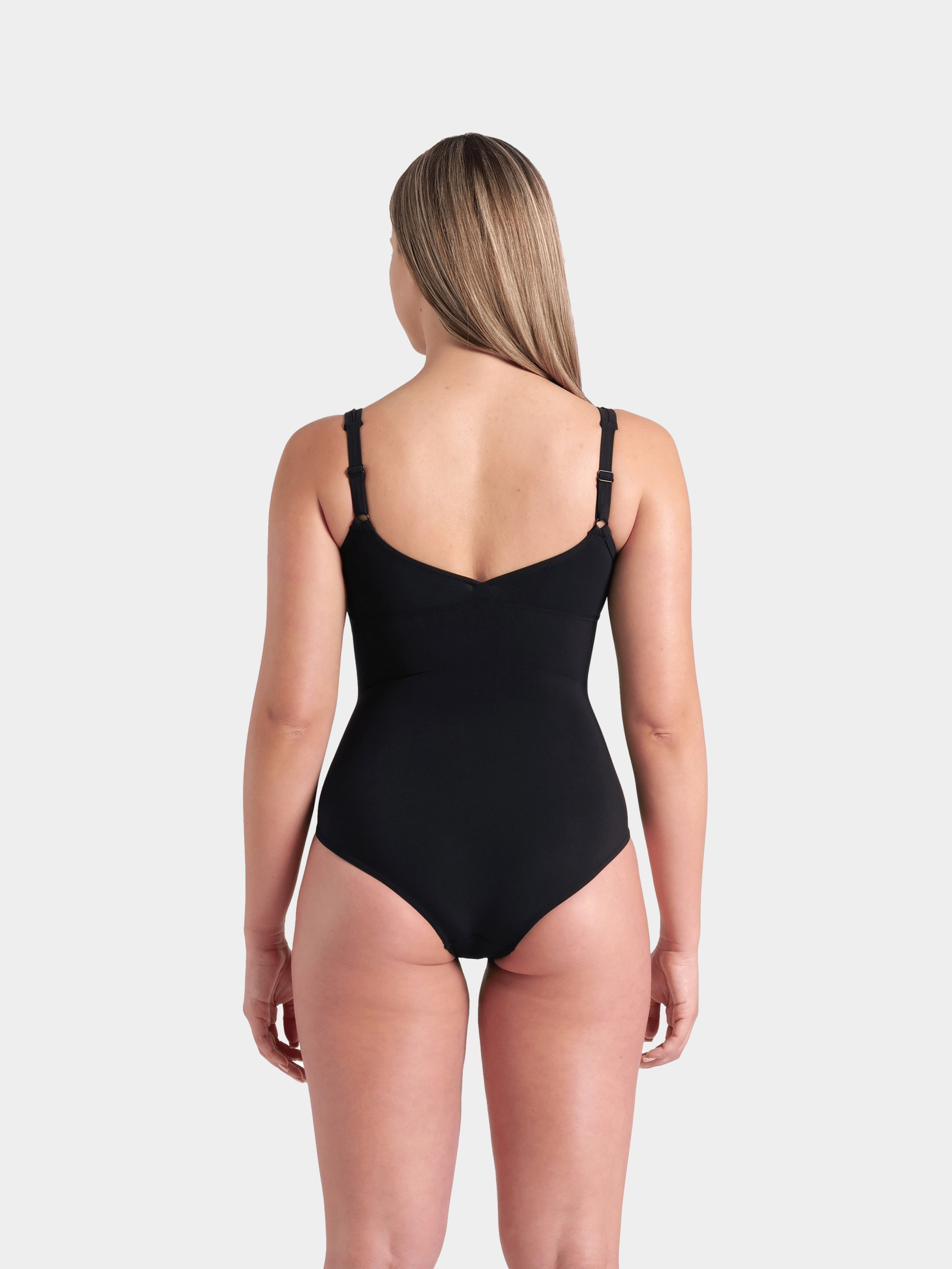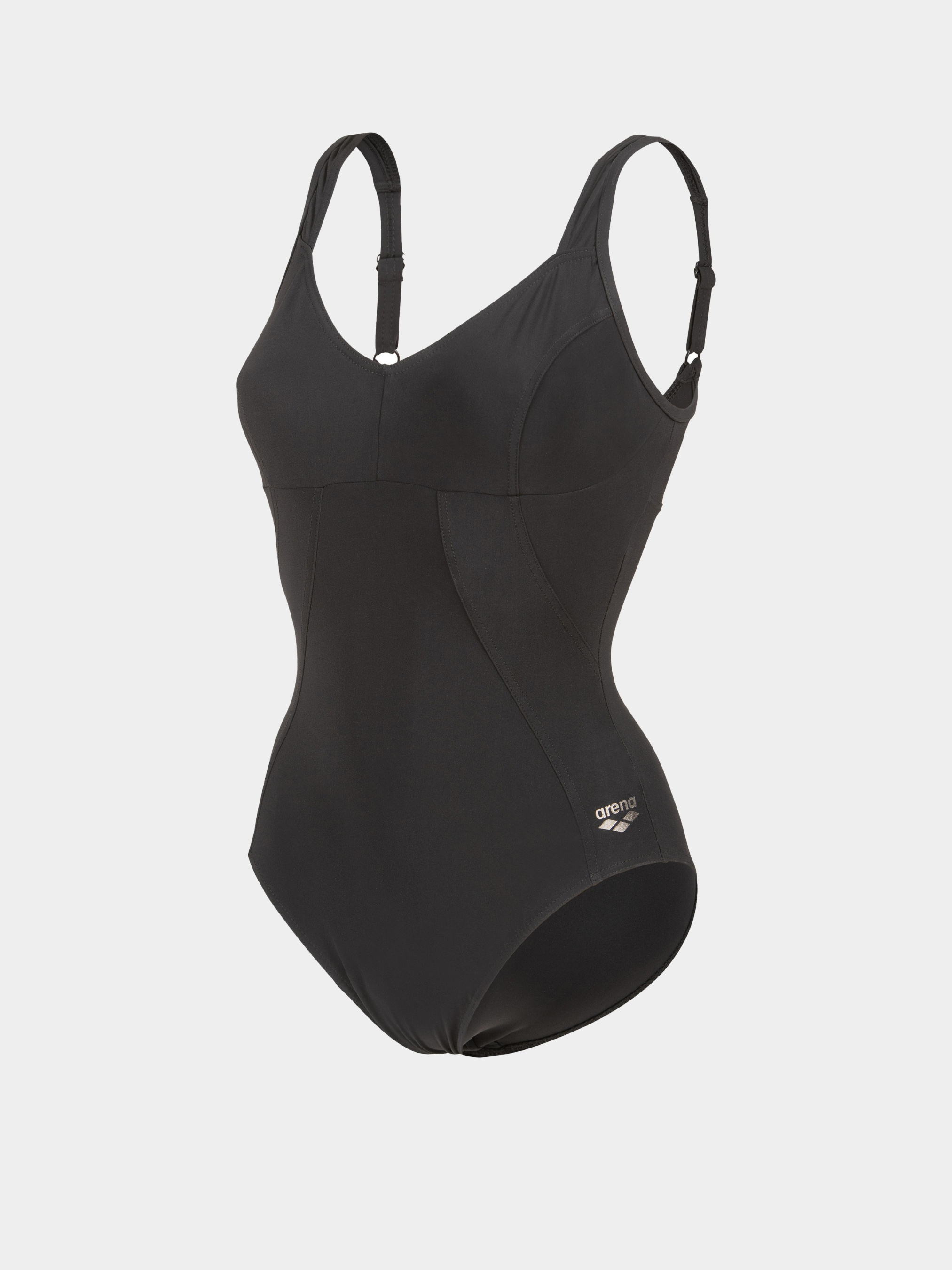 Що може бути більш позачасовим, ніж суцільний чорний купальник? Жіночий купальник Bodylift Vertigo — це безпрограшна модель із коригувальним ефектом, створена для активного відпочинку біля басейну. Виготовлений із тканини, що вирівнює силует і містить перероблені матеріали, він підкреслює фігуру завдяки формуючим швам, витонченому V-подібному вирізу та вбудованому бюстгальтеру. Модель із низьким вирізом стегна ідеально підійде тим, хто віддає перевагу більш стриманому дизайну. Тканина Sensitive Reco — це купальна тканина, на 68% виготовлена з переробленого нейлону. Вона поєднує коригувальні властивості, підтримувальну еластичність і легкість, забезпечуючи комфорт як у воді, так і поза нею. Стійка до хлору, швидко сохне та має захист від ультрафіолету — готова до будь-яких водних активностей.