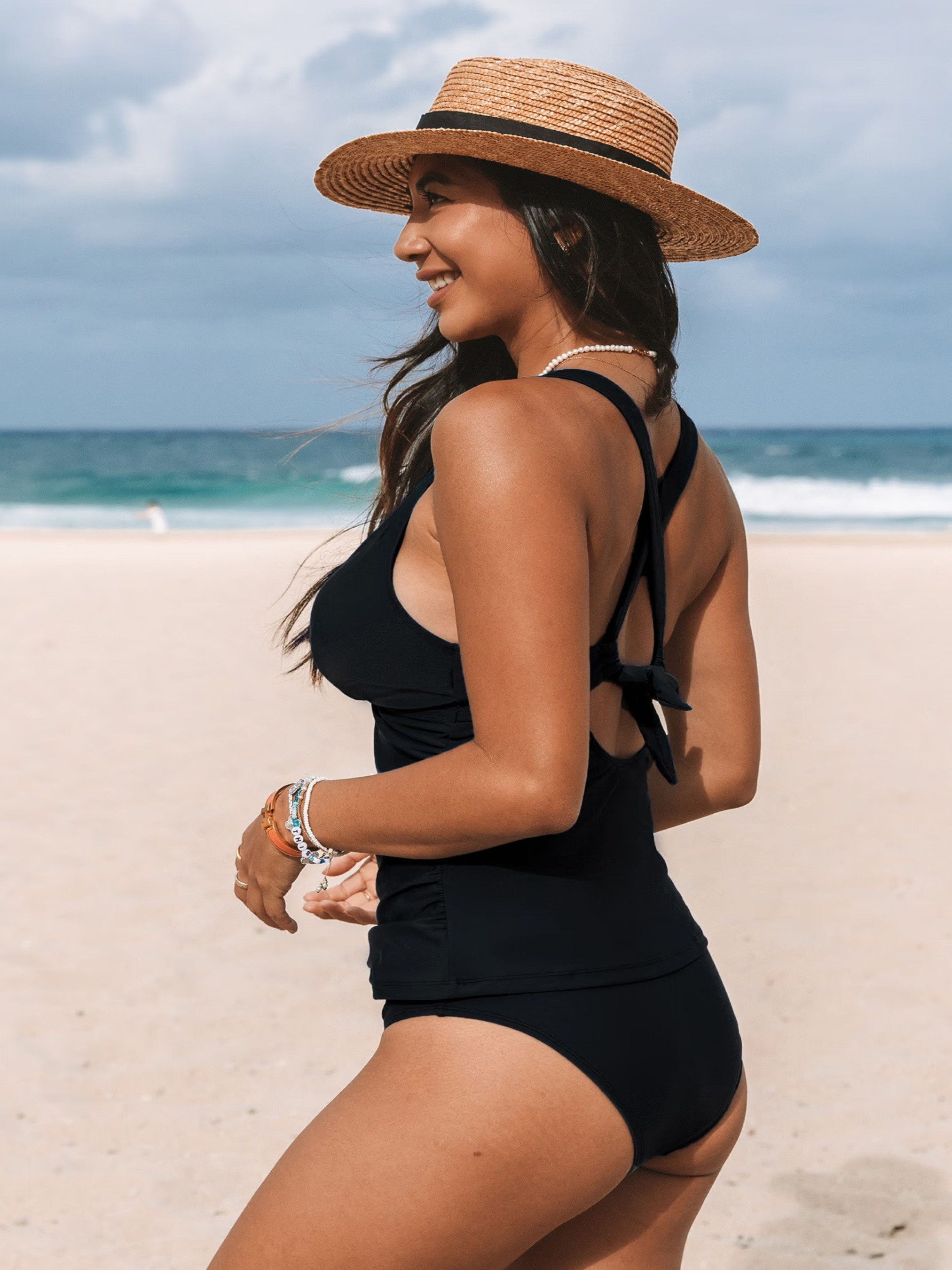Приверніть загальну увагу на пляжі в нашому чорному комплекті з топки-танкіні зі збірками та плавок середньої посадки. V-подібний виріз Регульовані бретельки, що перехрещуються, на спині М'які чашки, що знімаються. Зав'язка на спині Складання Виріз Середня посадка Стандартний крій брючини Класична стандартна посадка на сідницях