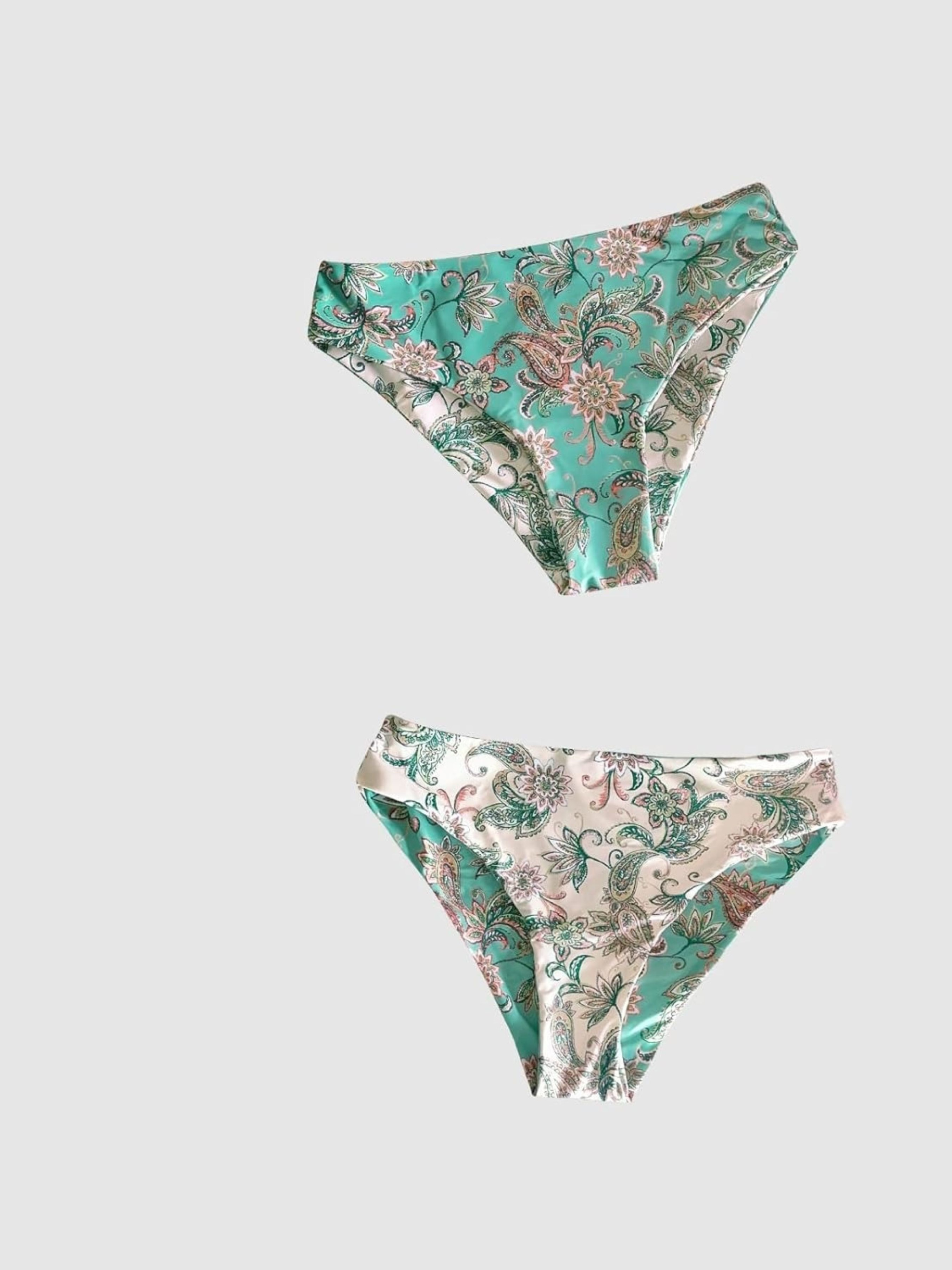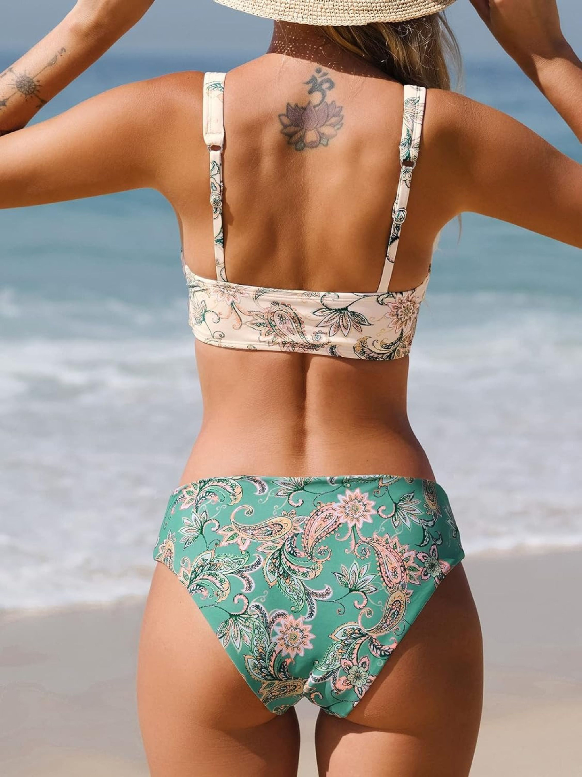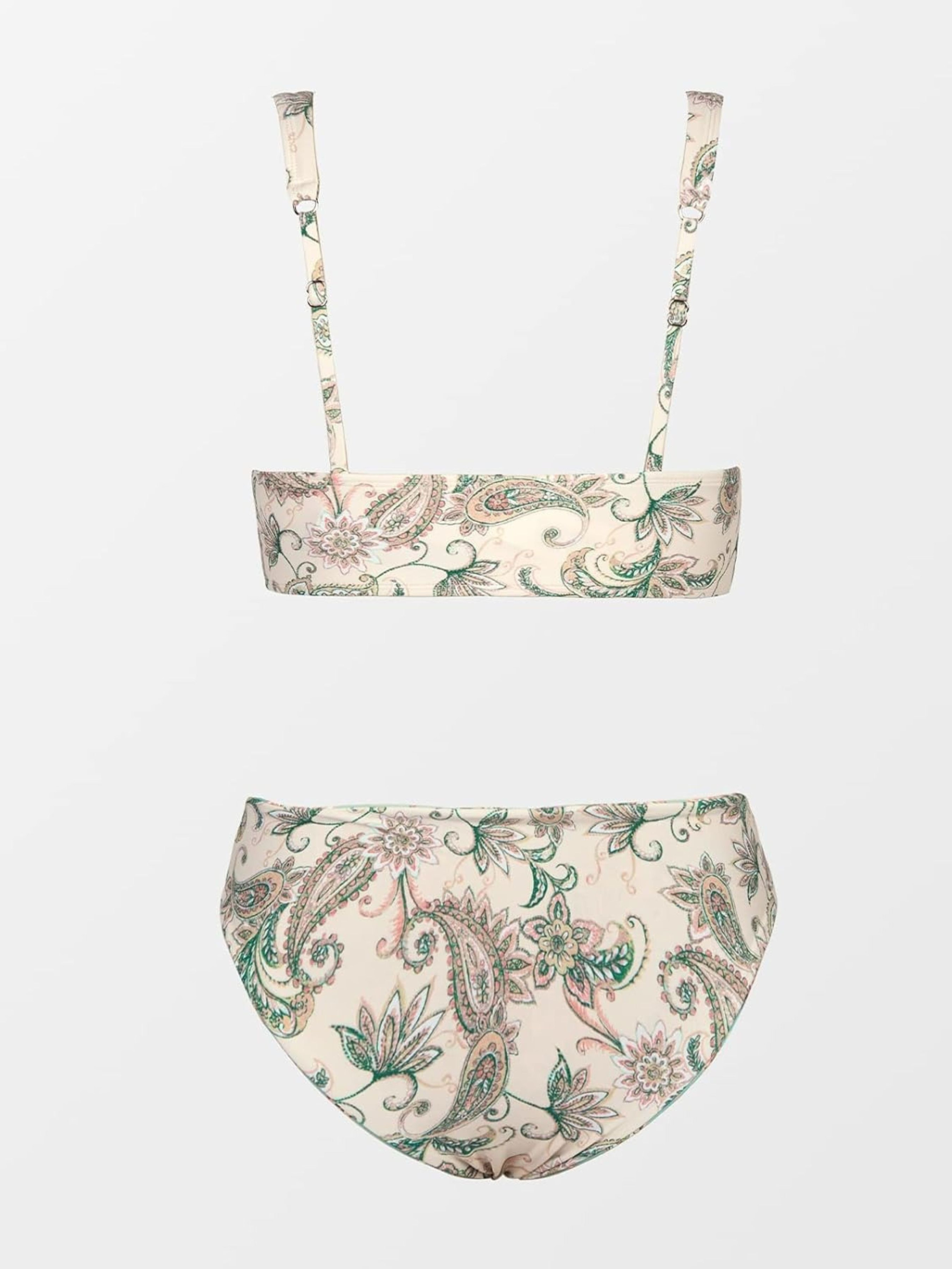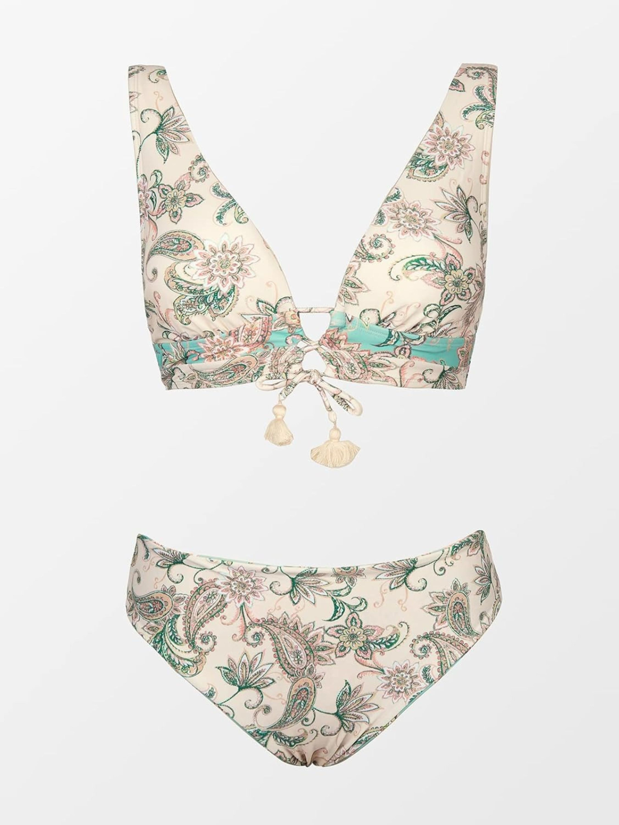 Бікіні з двох частин, V-подібний виріз, шнурівка на грудях, прикраса пензликами, бретелі, принт пейслі, плавки бікіні з середньою талією, які можна перевернути. Цей комплект бікіні складається з класичного верху зі м'якими знімними подушечками для додаткового комфорту і красивої форми, а також плавок бікіні в тон. Відкрийте для себе літній стиль у бікіні з двох частин привабливого дизайну та продуманих деталей. Верх бікіні з V-подібним вирізом має привабливу шнурівку в ділянці грудей, яка прикрашена пензликами і надає комплекту грайливого відтінку. Плавки бікіні із середньою посадкою вражають не лише модним принтом пейслі, а й своєю двосторонньою здатністю, яка дозволяє створити два різні образи за допомогою лише одного бікіні. Цей комплект бікіні - ідеальний вибір на всі випадки життя на пляжі, біля басейну або на інших заходах, таких як йога та спа. Високоякісні матеріали та ідеальна посадка забезпечують максимальний комфорт та елегантний вигляд. Склад: верх: 80% поліамід, 20% еластан/підкладка: 100% поліестер