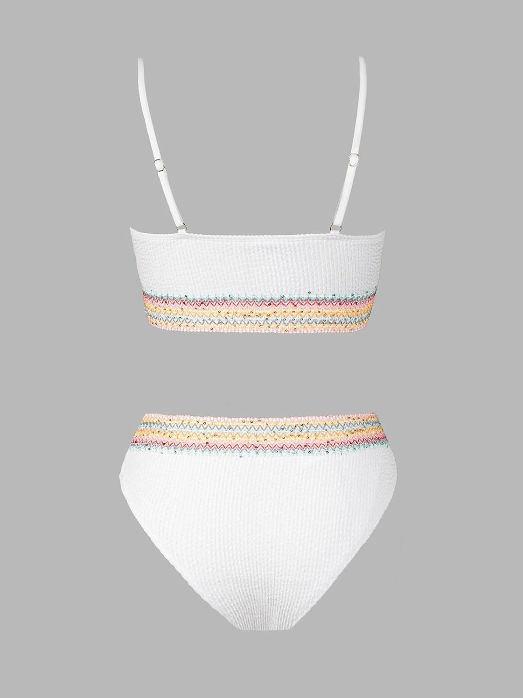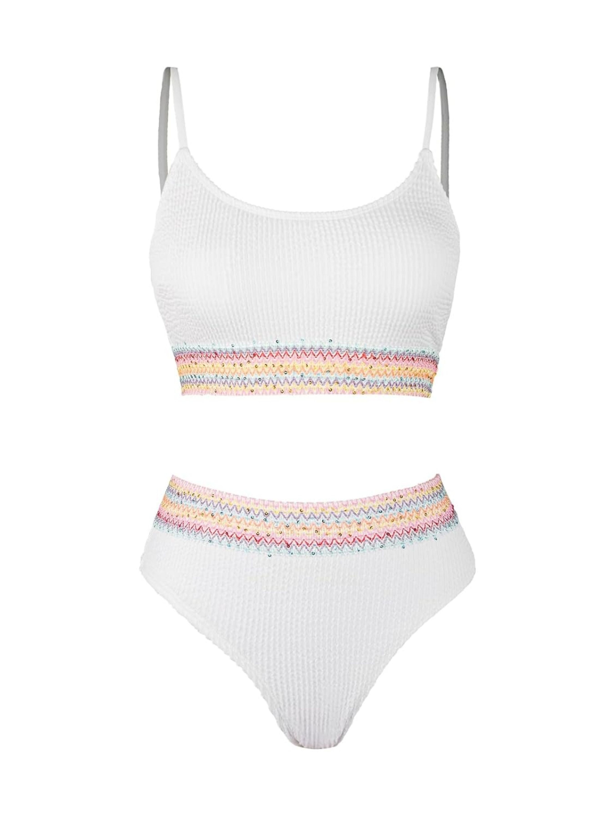 Верх бікіні із жатойтканини: регульовані бретельки-спагетті, округлий виріз, знімні подушечки та збиральний верх без застібки. Плавки бікіні: висока талія, контроль живота та високі штанини. Цей комплект бікіні відрізняється яскравим оздобленням з кольоровими блоками та створює сміливий та динамічний образ, який обов'язково приверне увагу на пляжі або біля басейну. Стиль: регульовані бретельки-спагетті для додаткової гнучкості, а конструкція пуш-ап з м'якими знімними подушечками та гумками під грудьми забезпечує достатню підтримку грудей. Висока талія забезпечує покриття живота, а високий виріз навколо ніг розтягує та подовжує тулуб, створюючи приємну та зручну посадку. Склад: верх: 75% поліестер, 25% еластан/підкладка: 92% поліестер, 8% еластан