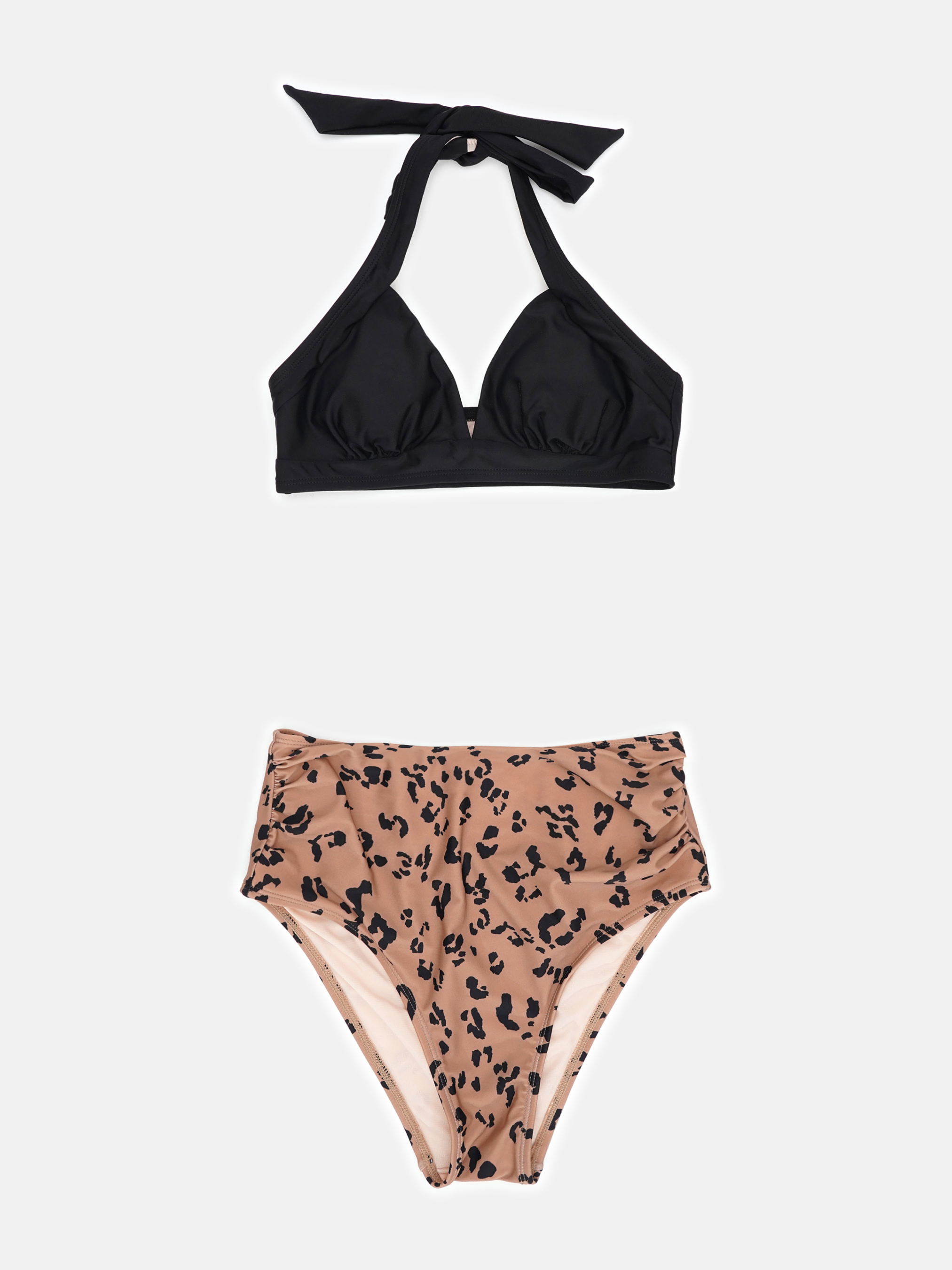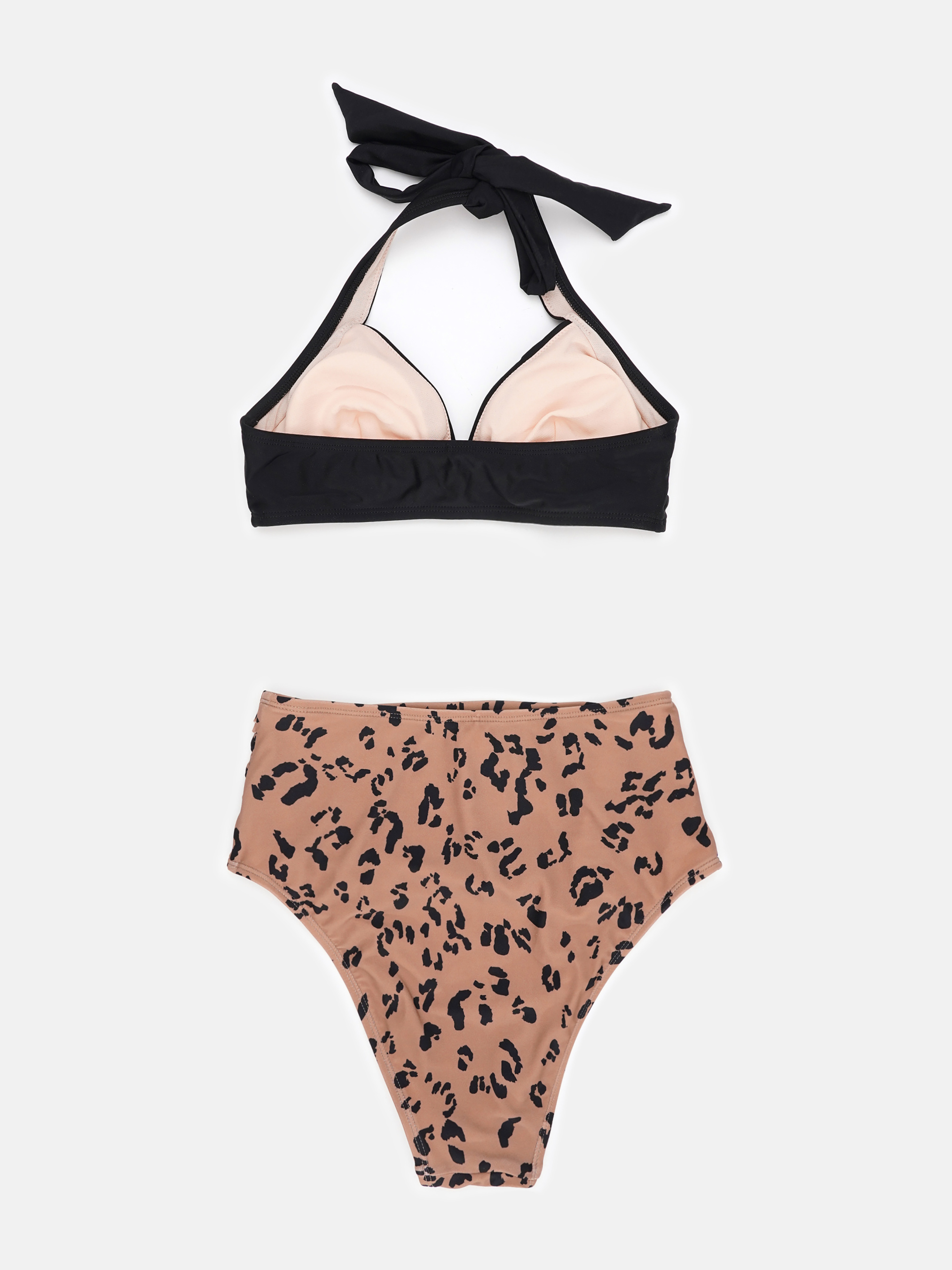 Підкресліть свій пляжний стиль за допомогою нашого комплекту бікіні із високою талією. Цей шикарний ансамбль включає привабливий топ із зав'язками на шиї та плавки бікіні з високою талією зі складанням-контролем живота. Пориньте в розкіш і впевненість із відтінком солодкої елегантності, яка виділяє вас на березі. Виріз через шию Знімні чашки Середня підтримка грудей. Зав'язки на шиї Завишена талія Класичне покриття сідниць Візерунок ліфа: Однотонний Візерунок трусиків: Леопардовий принт Склад: верх: 80% поліамід, 20% еластан/підкладка: 100% поліестер