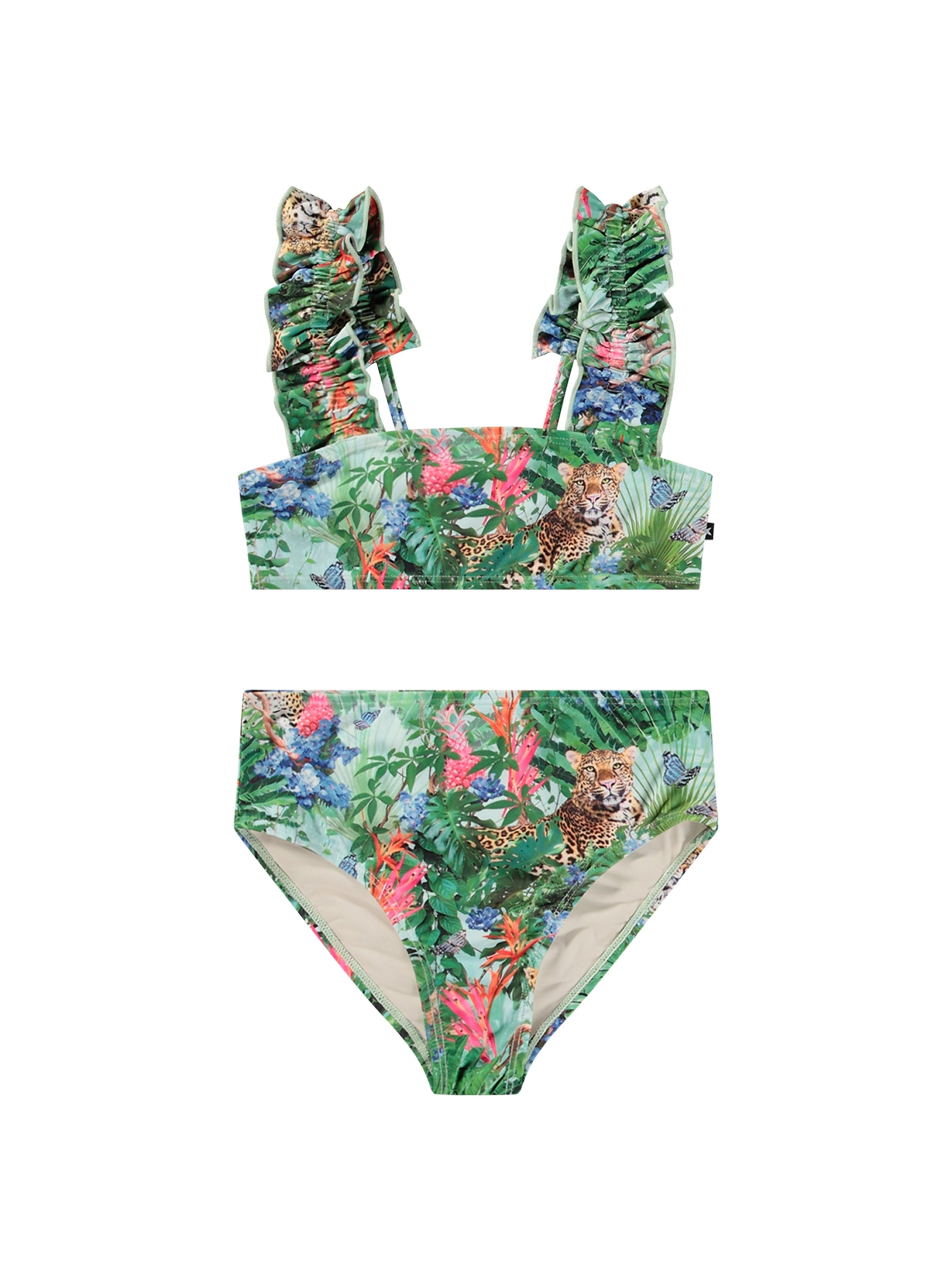 Купальник Molo "Nice Green Tropical" із захистом від ультрафіолету. Особливості: захист від сонця – UPF 50+; містить щонайменше 50% поліестеру з перероблених матеріалів, сертифікованого GRS (Global Recycled Standard)*; декорований принтом із зображенням тропічних джунглів та тварин; широкі бретелі прикрашено оборками. Купальник елегантно підкреслить витонченість і грацію дівчинки. *GRS – це міжнародний і добровільний стандарт, що перевіряє та відстежує перероблені матеріали від початкової сировини до кінцевого продукту.