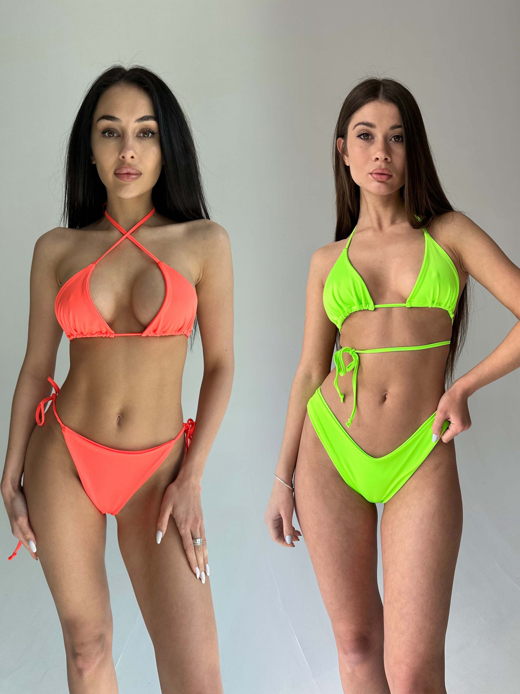 Жіночий комплект із двох роздільних купальників для басейну та пляжного відпочинку. Трикутна форма верху на тонких зав'язках. Плавки стрінги на середній посадці та плавки стрінги на зав'язках. Купальники виготовлені із міцного, швидковисихаючого, високоякісного матеріалу. Тканина не линяє та не вигоряє на сонці. Купальники без кишень для чашок.