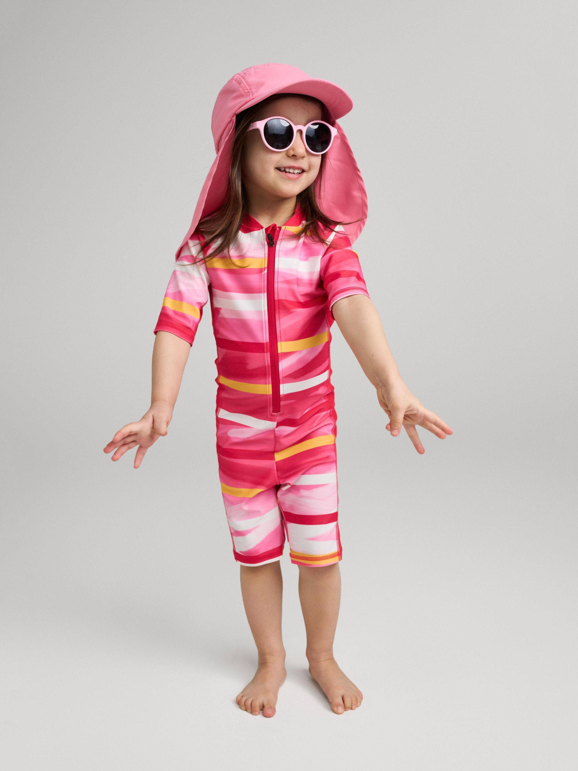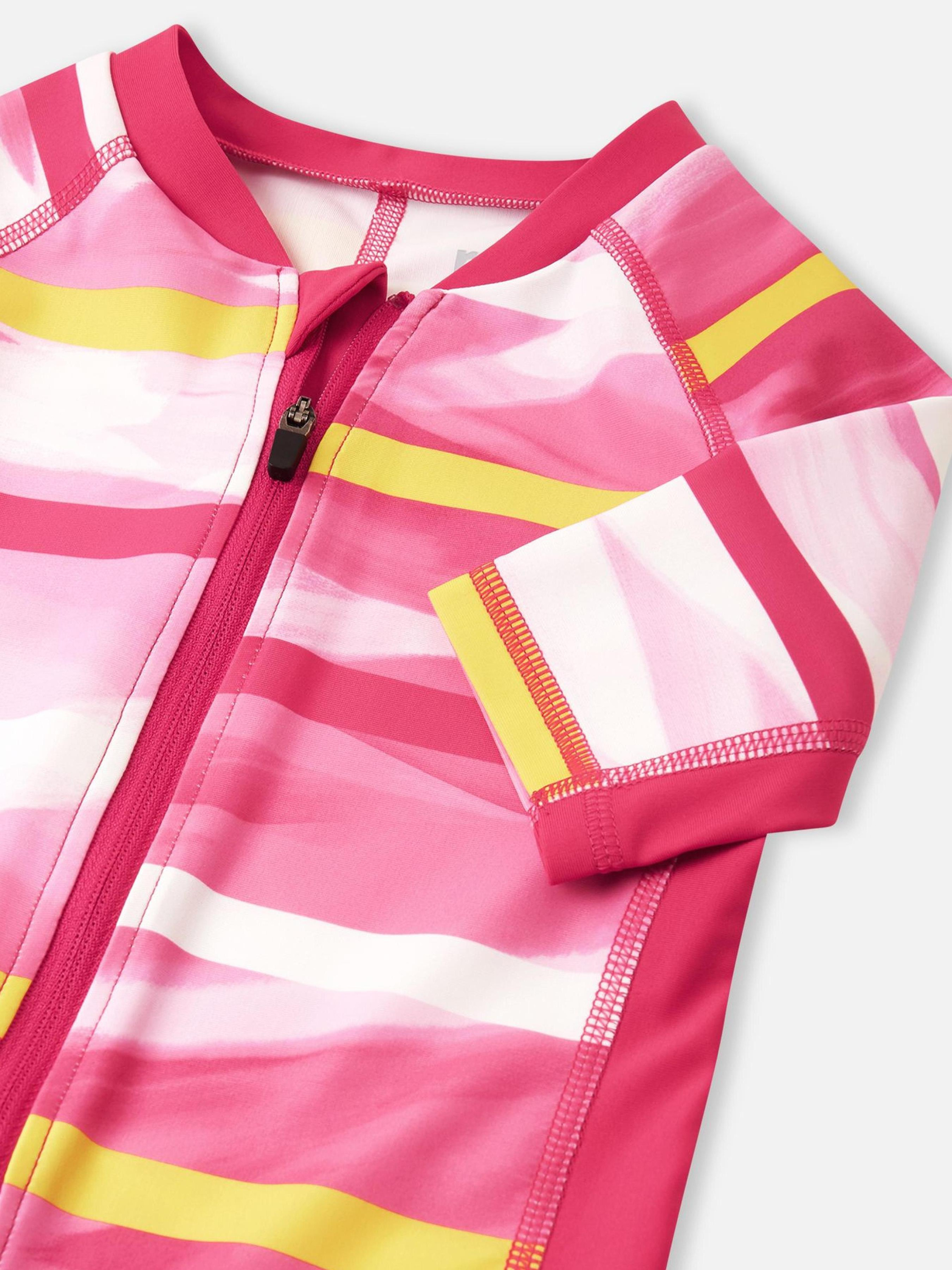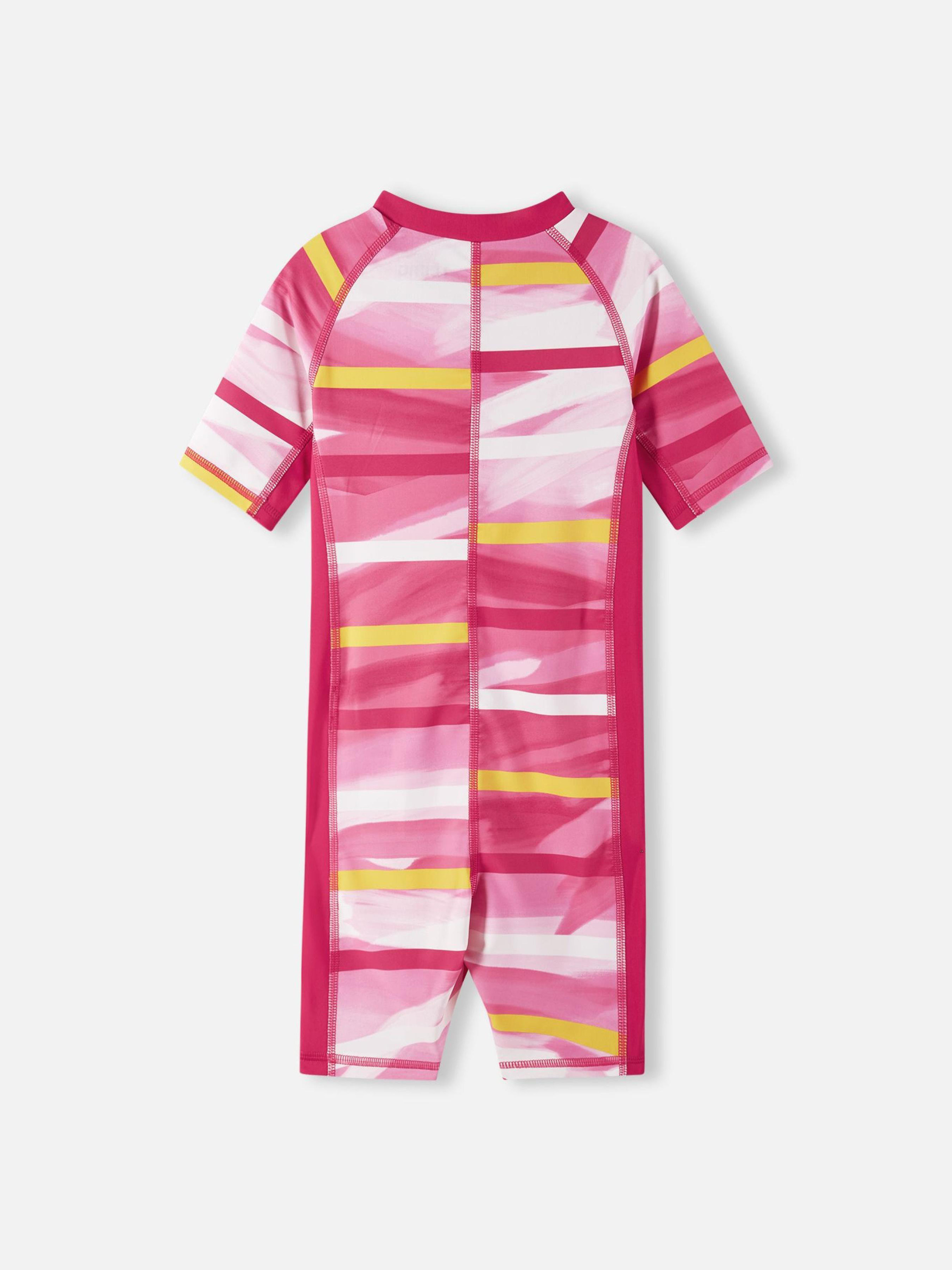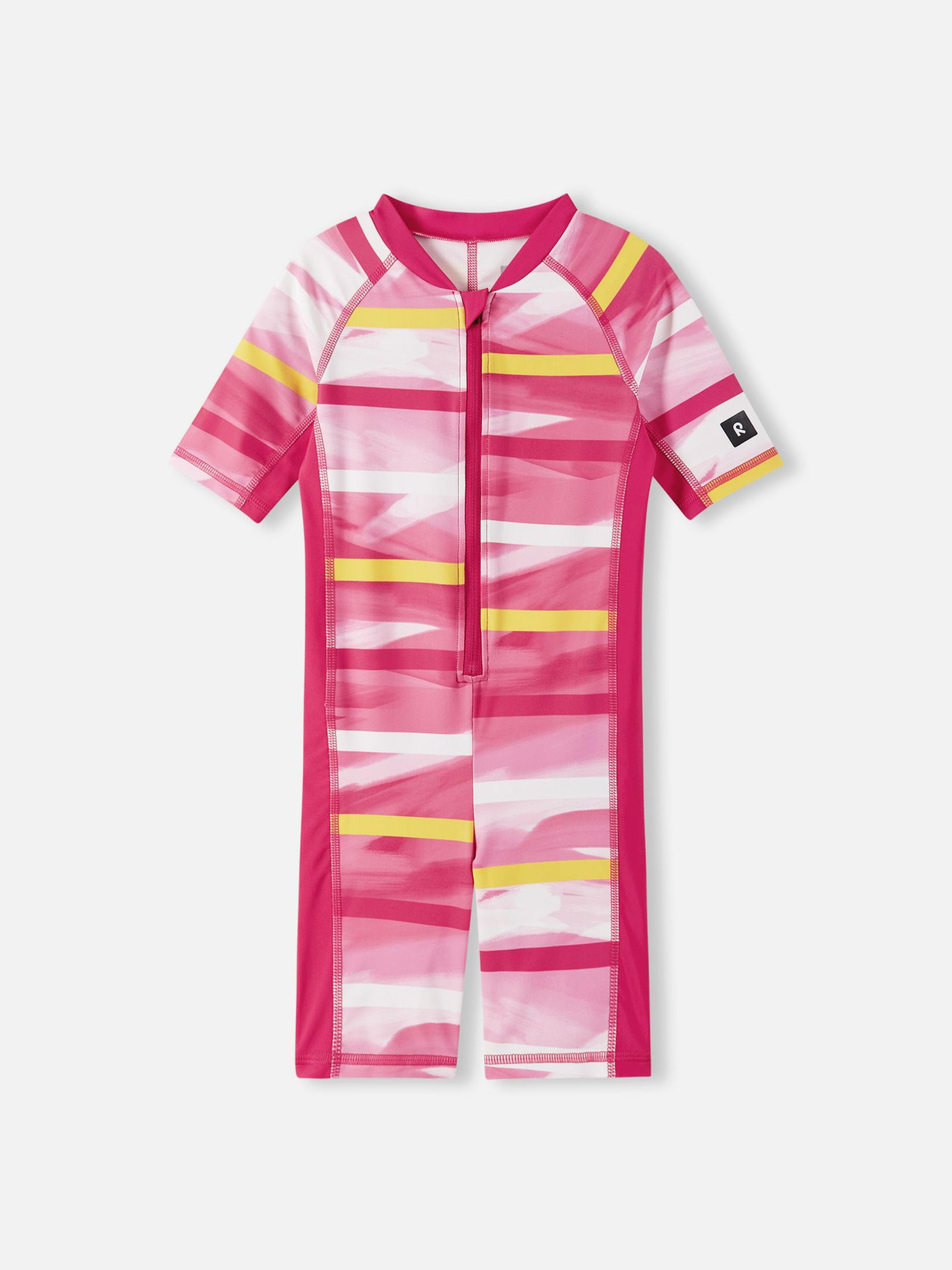 Склад: SunProof jersey GRS: 83% перероблений поліестер, 17% еластан Матеріал: SunProof jersey GRS УФ захист 50+ Еластичний матеріал Відводить вологу від шкіри Швидковисихаючий матеріал Перероблений матеріал Містить перероблені волокна із сертифікатом якості|Reima SunProof: фактор захисту від ультрафіолету 50+|Плоскі шви забезпечують додатковий комфорт|Рукави до ліктів і холоші до колін|Бокові вставки на рукавах та тілі для повної свободи рухів|Довга блискавка для легкого одягання|Напівавтоматична застібка на блискавці, що захищає від випадкового відкриття|Принт по всій поверхні Догляд : Прати з білизною однакового кольору, вивернувши навиворіт. Прати у спеціальному мішку. Застебнути блискавки. Прати миючим засобом, що не містить відбілюючих речовин. Полоскати без спеціального засобу. Сушити у захищеному від сонця місці. Після застосування прополоскати чистою водою. У цьому комбінезоні для плавання ваш маленький шукач пригод почуватиметься комфортно та захищено під час ігор у воді. Швидкосохнуча еластична тканина відводить зайву вологу від шкіри, а захист від ультрафіолету SPF 50+ дозволяє довше грати на сонці. Плоскі шви та правильний крій забезпечують повну свободу рухів. Купальний комбінезон дуже легко вдягати та знімати завдяки довгій напівавтоматичній застібці-блискавці. Цей купальник ідеально підходить для ігор на пляжі, басейні або задньому дворі. Не забувайте захищати шкіру, що не прикрита одягом, сонцезахисним лосьйоном.