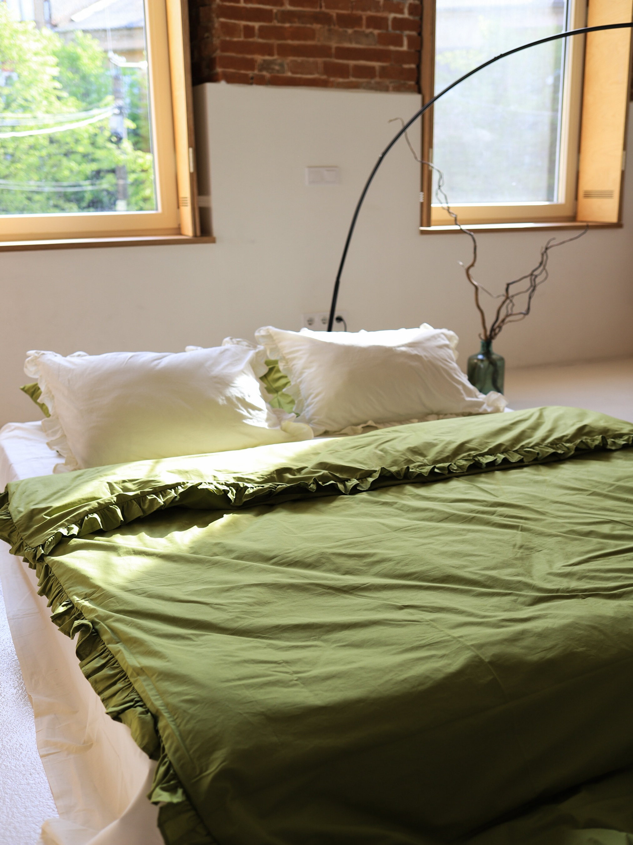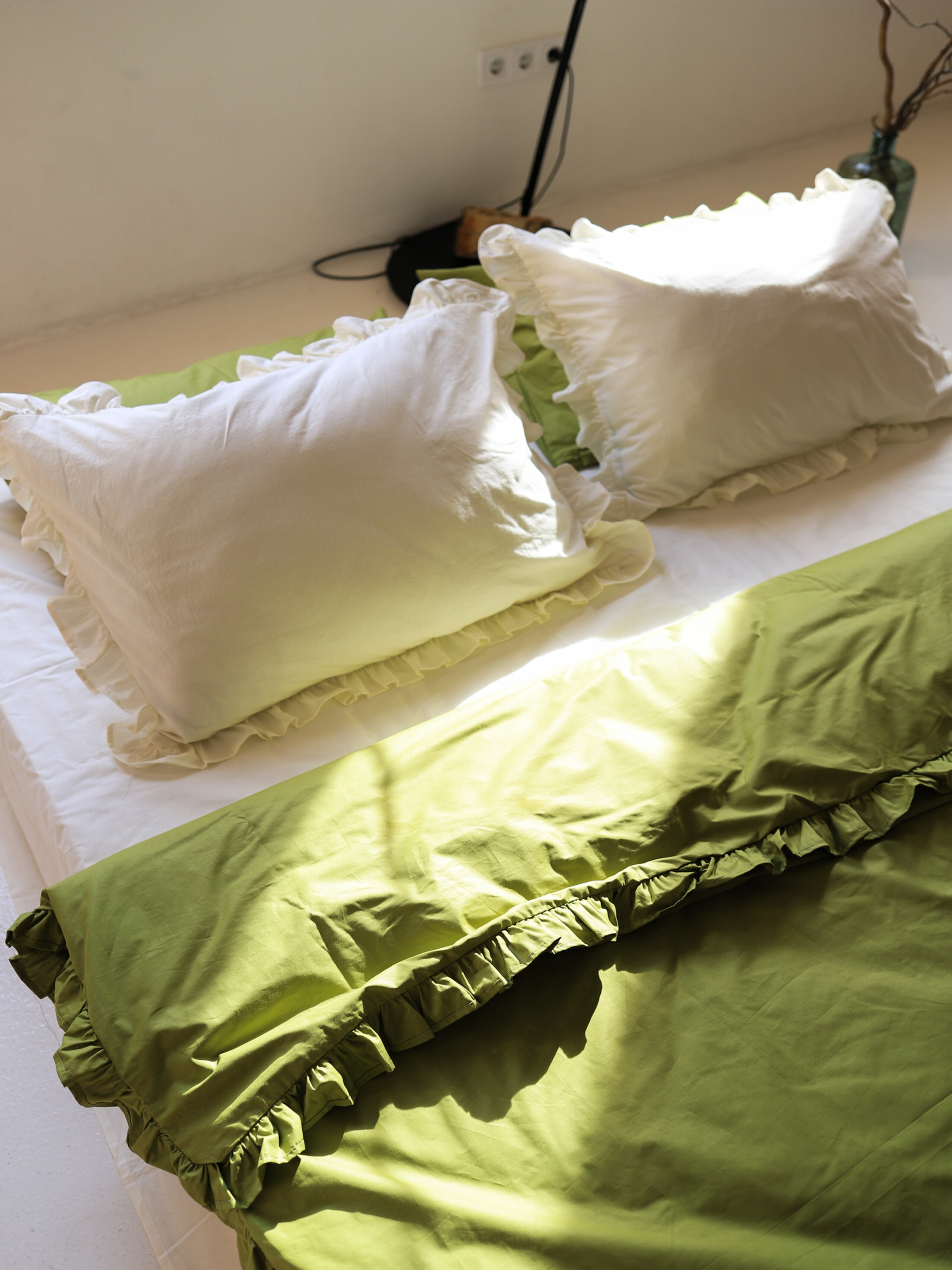 BedclozZzesКомплект постільної білизни з тканини ранфорс молочний+матча з рюшами