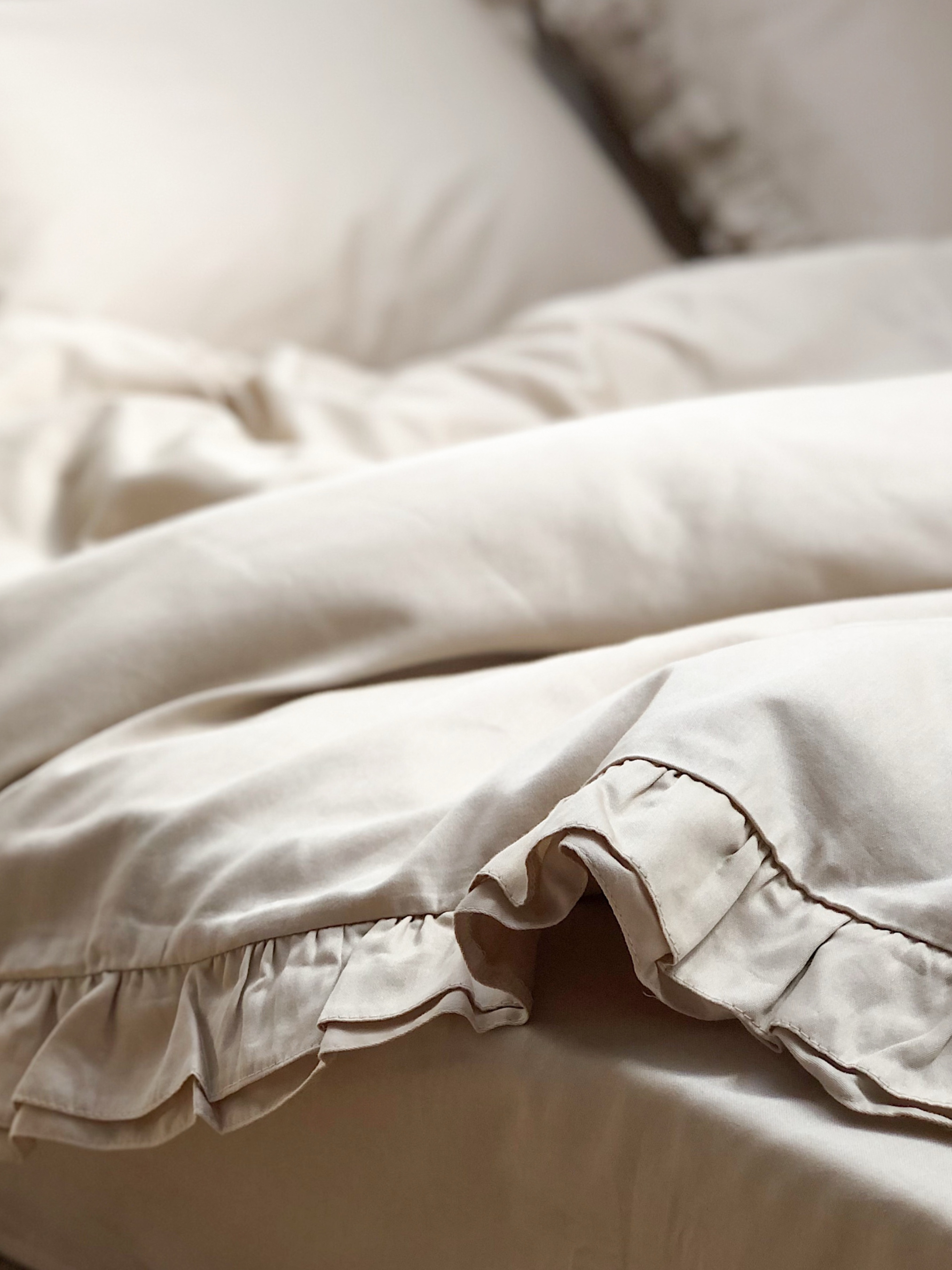 Підковдра з рюшами: - Рюші: подвійні рюші, виконані з двох боків по довжині підковдри, кожна деталь ретельно оброблена мікрооверлоком для ідеального вигляду та міцності. - Тканина: сатин мерсеризований, 100% бавовна — ніжна на дотик, стійка до зношування та численних прань - Щільність: 130 г/м² — оптимальна для міцності та комфортного сну в будь-яку пору року - Застібка: зручні та надійні кнопки, які не пошкоджують тканину і легко застібаються - Деталі: великий розріз для заправлення, що забезпечує швидке та зручне використання підковдри Рекомендації по догляду: - Перед першим використанням обов'язково виперіть постіль. Вона пройшла тривалий шлях від виробництва тканини на фабриці, пошиву виробу до його пакування і відправлення. - Уникайте завантаження пральної машини постільною білизною разом із іншими речами, особливо з різним складом тканини та кольорами. - Рекомендуємо використовувати режим “бавовна”, з температурою 30 градусів та швидкістю віджиму 400-600 об/хв. Такий режим віджиму дозволить постільній білизні досихати в більш рівному положенні, щоб вона виглядала свіжо прасованою. - Змінюйте постіль раз на 7-10 днів в холодну пору року та 1 раз в 5-7 днів у теплу.