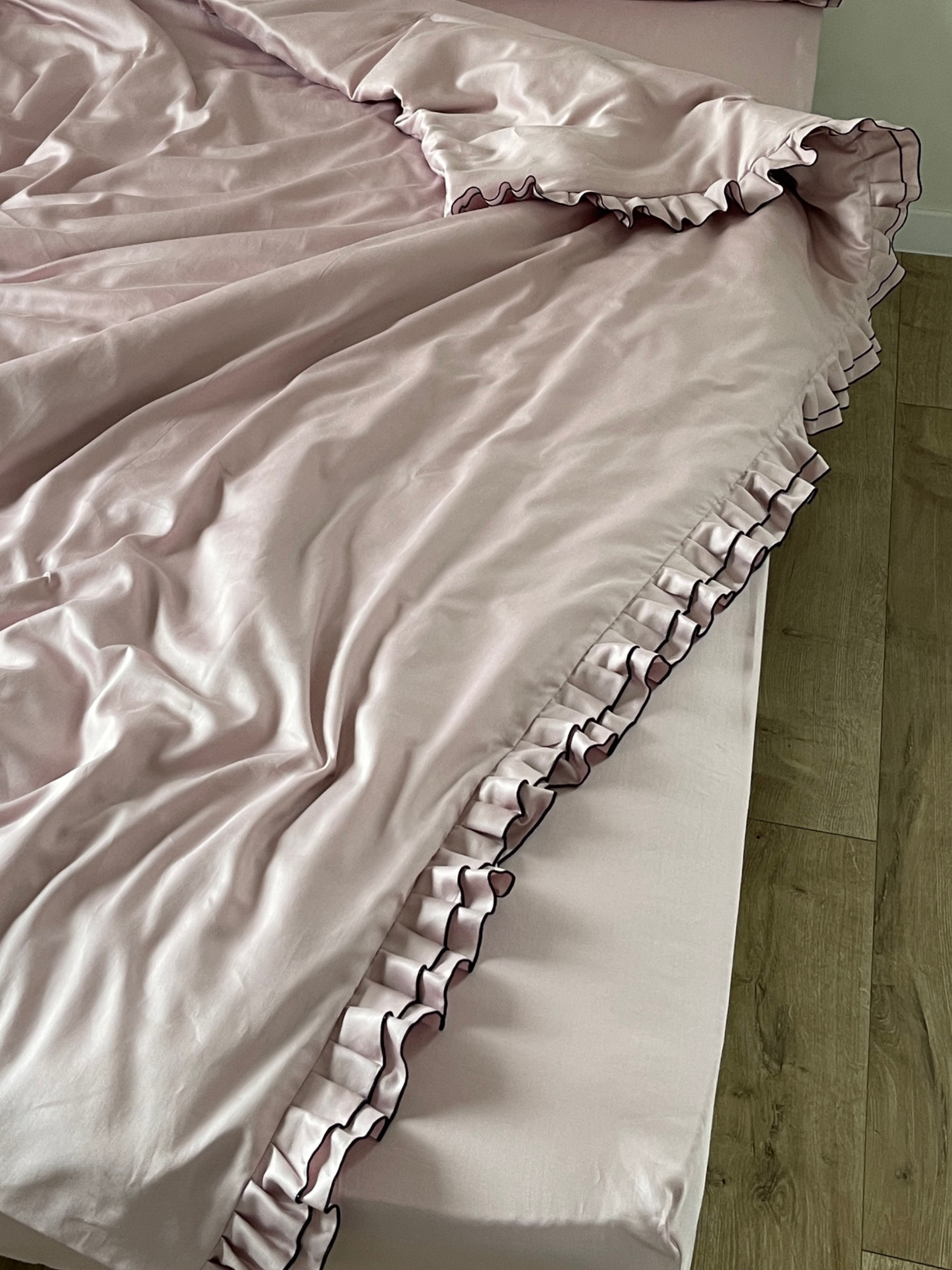 Підковдра з рюшами: - Рюші: подвійні рюші, виконані з двох боків по довжині підковдри, кожна деталь ретельно оброблена мікрооверлоком для ідеального вигляду та міцності. - Тканина: сатин мерсеризований, 100% бавовна — ніжна на дотик, стійка до зношування та численних прань - Щільність: 130 г/м² — оптимальна для міцності та комфортного сну в будь-яку пору року - Застібка: зручні та надійні кнопки, які не пошкоджують тканину і легко застібаються - Деталі: великий розріз для заправлення, що забезпечує швидке та зручне використання підковдри Рекомендації по догляду: - Перед першим використанням обов'язково виперіть постіль. Вона пройшла тривалий шлях від виробництва тканини на фабриці, пошиву виробу до його пакування і відправлення. - Уникайте завантаження пральної машини постільною білизною разом із іншими речами, особливо з різним складом тканини та кольорами. - Рекомендуємо використовувати режим “бавовна”, з температурою 30 градусів та швидкістю віджиму 400-600 об/хв. Такий режим віджиму дозволить постільній білизні досихати в більш рівному положенні, щоб вона виглядала свіжо прасованою. - Змінюйте постіль раз на 7-10 днів в холодну пору року та 1 раз в 5-7 днів у теплу.