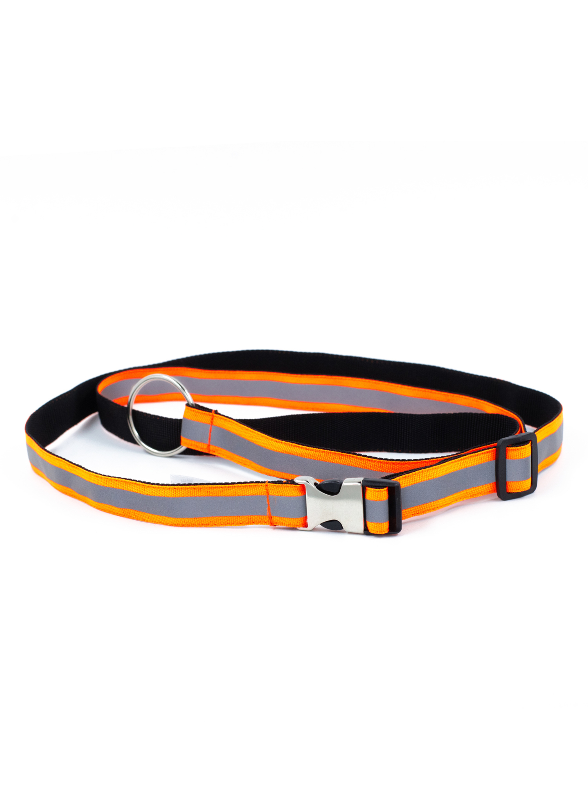 Ремінь помаранчевого кольору з нейлону, оздоблений світловідбивною тасьмою. Елегантна застібка фастекс забезпечує зручність використання. Розмір універсальний, обхват талії регулюється для ідеальної посадки. Довжина паска 1,30.