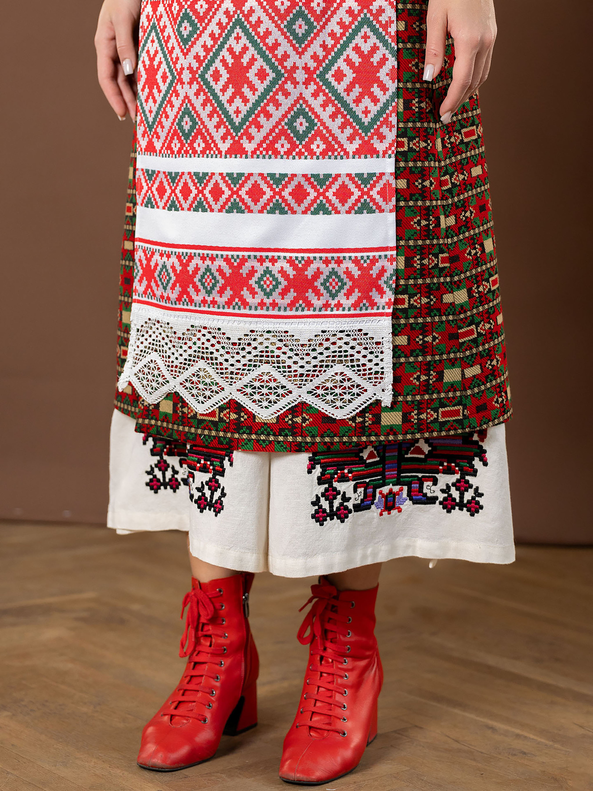 Фартух виконаний у традиційному стилі та привертає увагу насиченими поєднаннями червоного, білого й темно-зеленого. Геометричні орнаменти створюють виразний характер виробу, роблячи його стильним і помітним. Рівний фасон забезпечує зручну посадку та легко регулюється зав’язками, що дозволяють адаптувати фартух під будь-яку фігуру. Ніжне мереживо знизу додає виробу акуратності та елегантності. Такий фартух стане чудовим вибором як для святкових подій, етнофестивалів і тематичних фотосесій, так і для етнічної родзинки на щодень. Практична тканина легка у догляді. Вона зберігає яскравість кольорів, забезпечуючи довговічність і привабливий вигляд виробу на роки.
