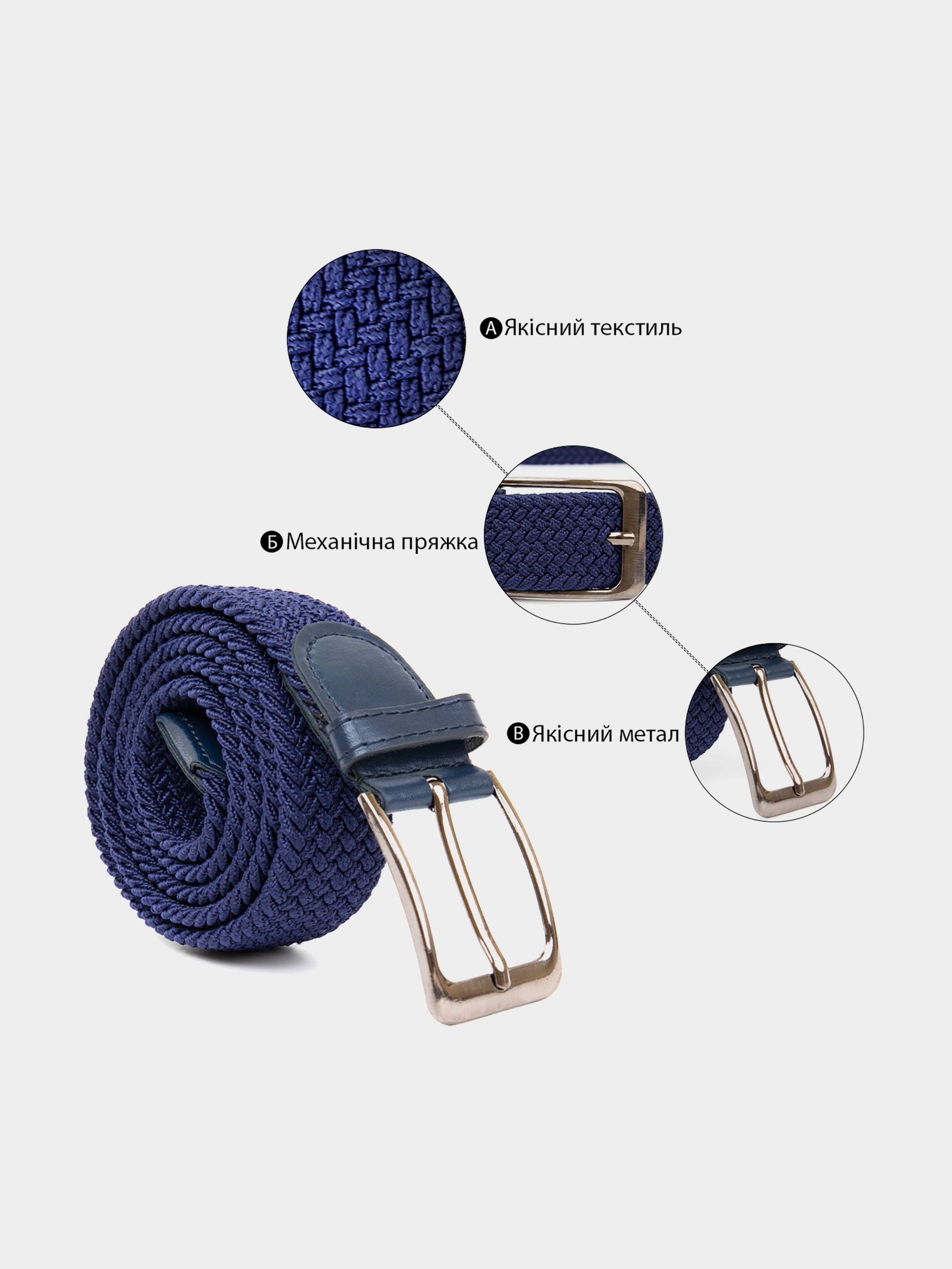 Матеріал: текстиль; Розмір: ширина 3,4 см; Колір синій; Довжина: 115 см. Країна виробник: Китай. Текстильний ремінець для чоловіків з класичною пряжкою сріблястого кольору. Пряжка з міцного сплаву. Ремінь виконаний в оригінальному синьому кольорі. Особливістю даного ремінця є те, що вам не потрібно робити дірки в полотні - вони з легкістю робляться за допомогою хлястика на пряжці. Візерунок текстильного полотна розсується і хлястик проходить наскрізь. Таким чином у вас немає необхідності скорочувати полотно ременя. Текстильний ремінець стане кращою альтернативою шкіряного ременя і при цьому значно заощадить ваші кошти. Ремінь доступний також в різних кольорах і з пряжкою автомат.